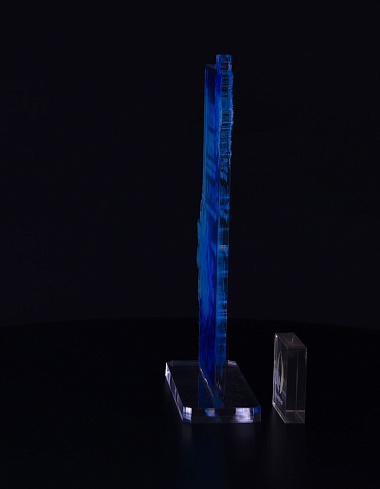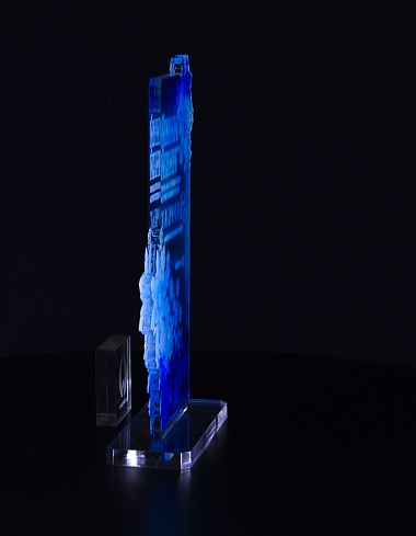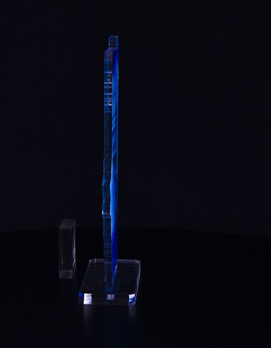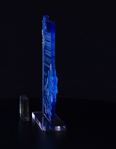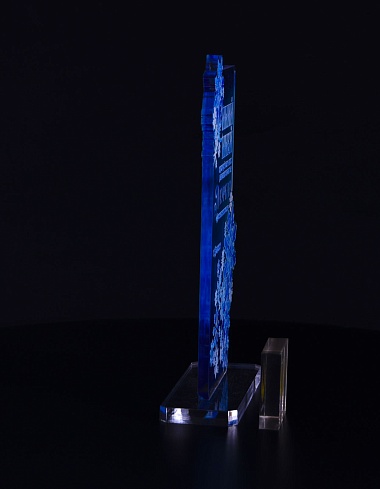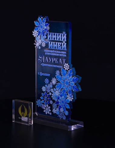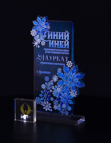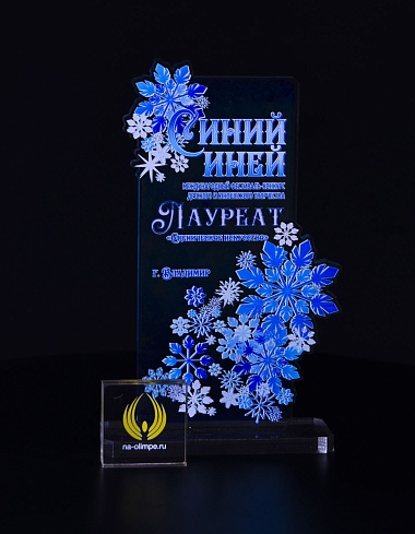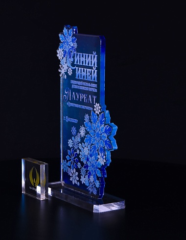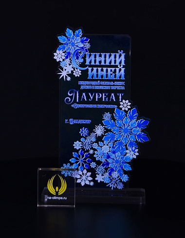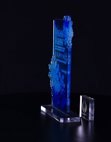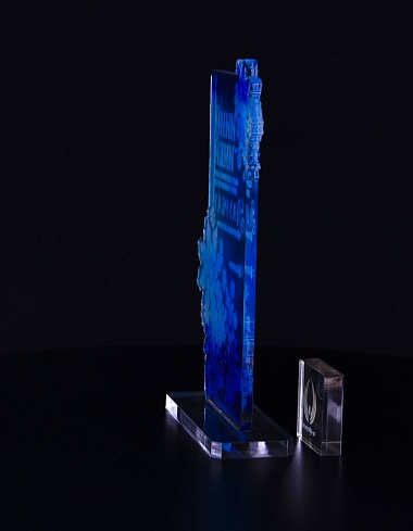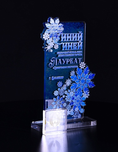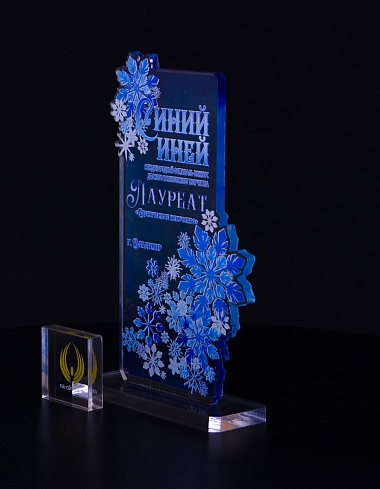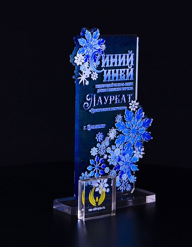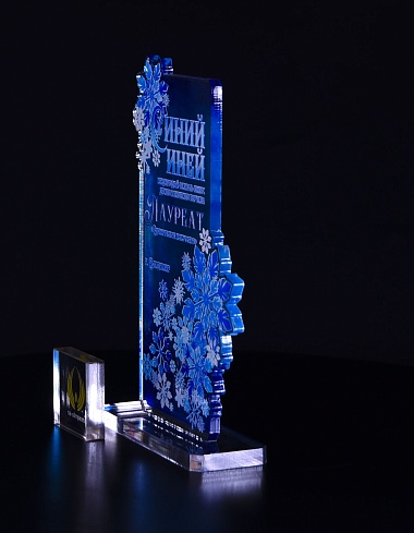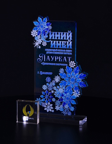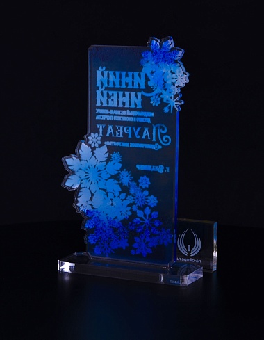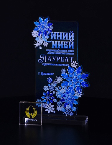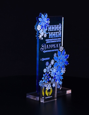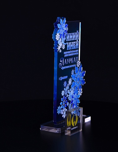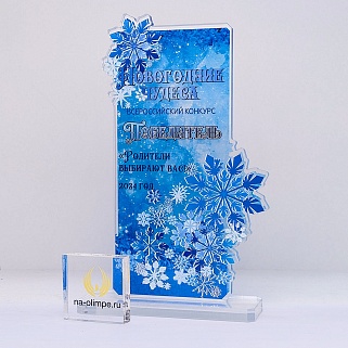 Приз из прозрачного акрила с глянцевой цветной печатью на лицевой стороне и полупрозрачной печатью на задней стенке награды и постаменте.