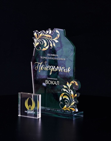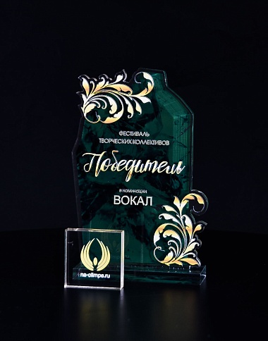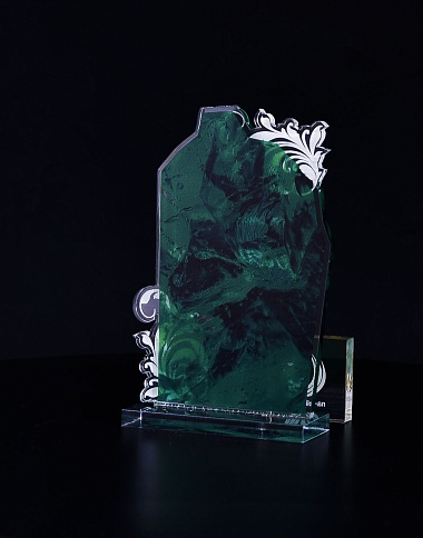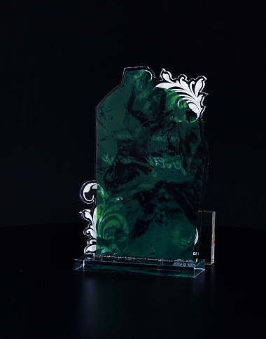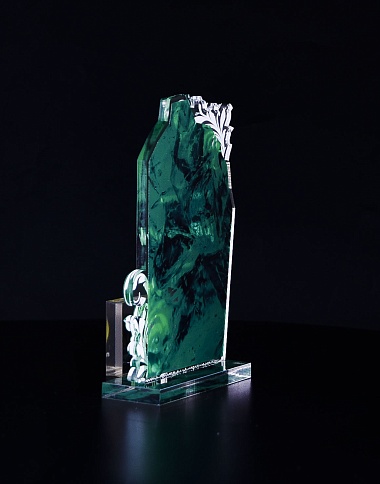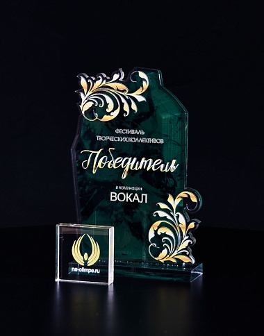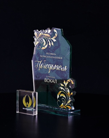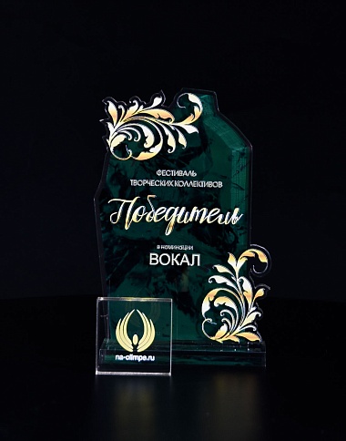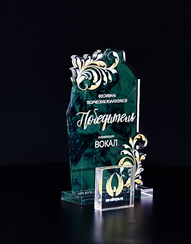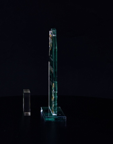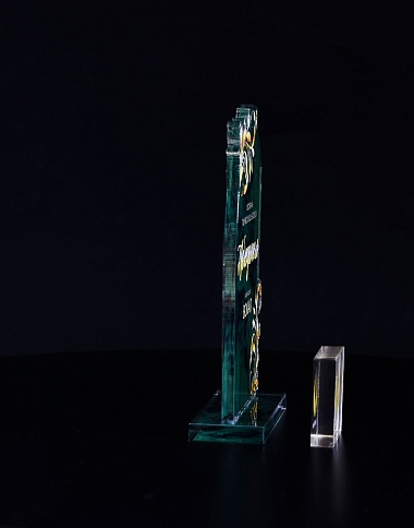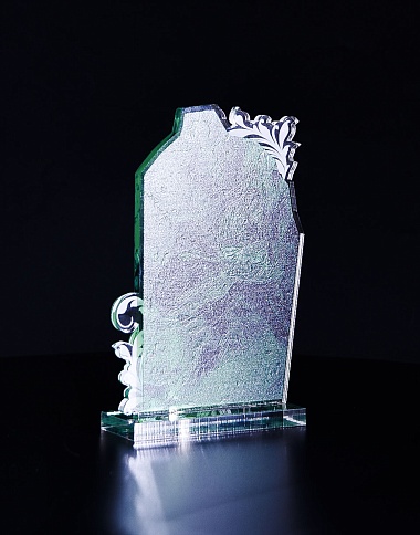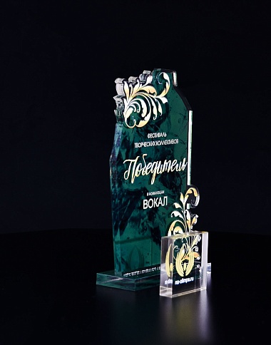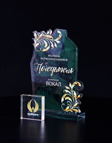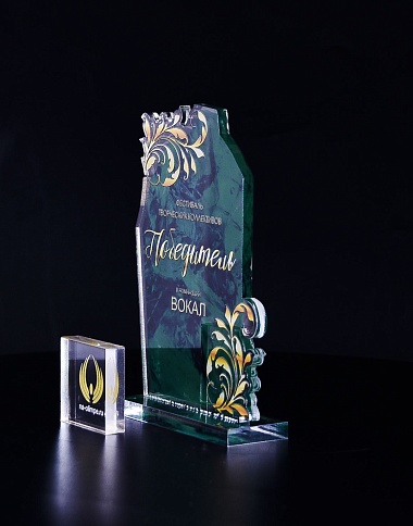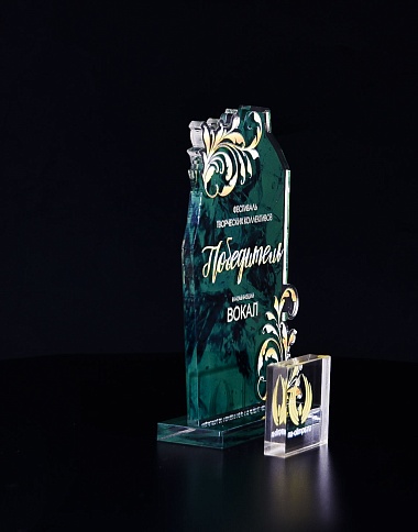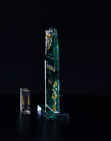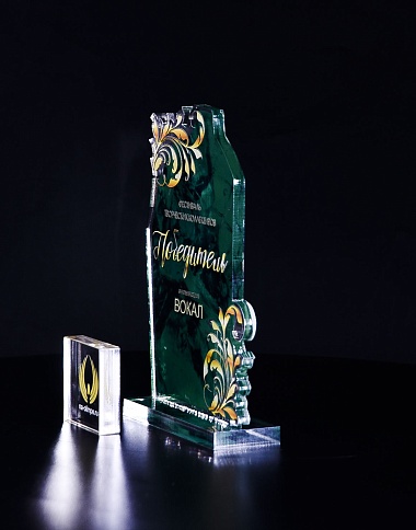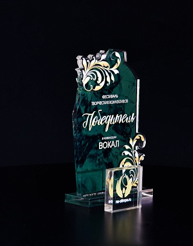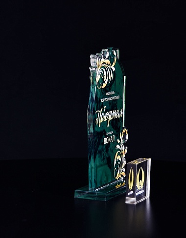 Приз из прозрачного акрила с глянцевой цветной печатью на лицевой стороне и полупрозрачной печатью на задней стенке награды и постаменте.