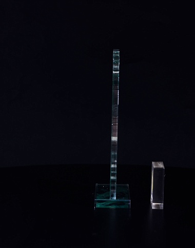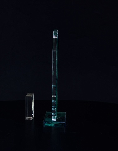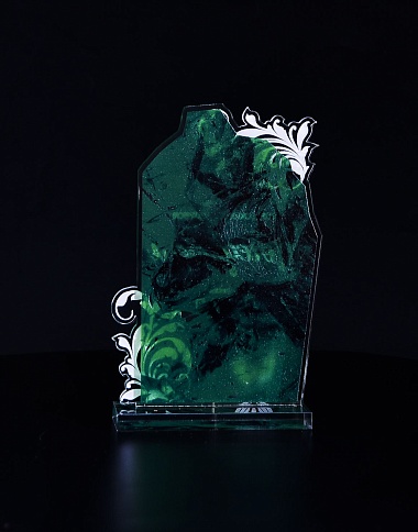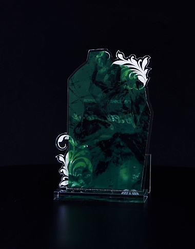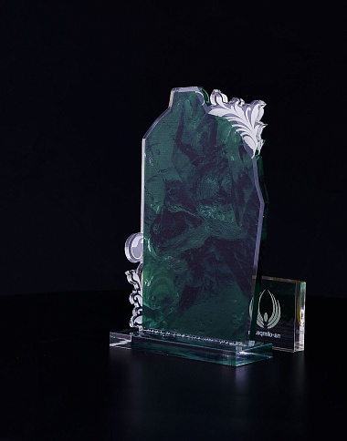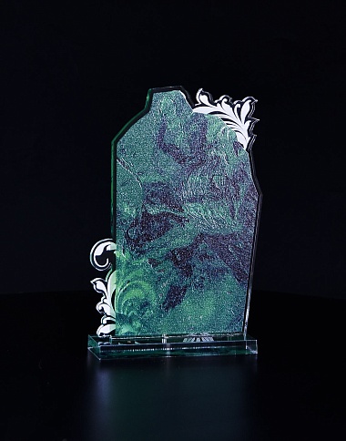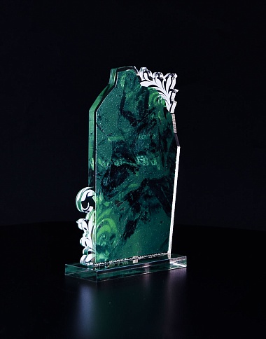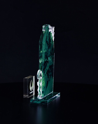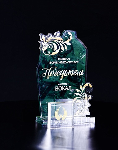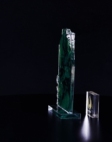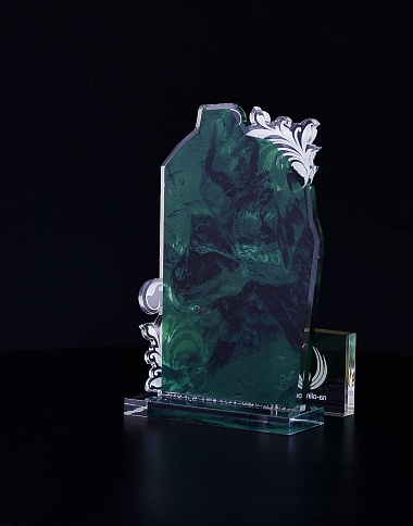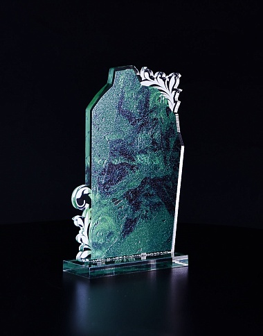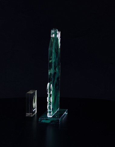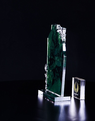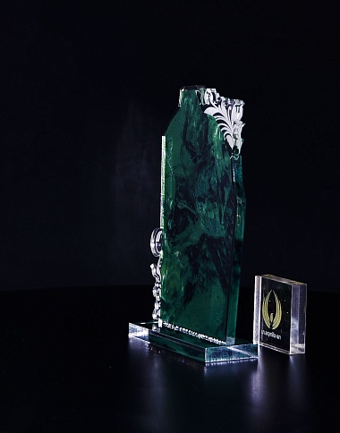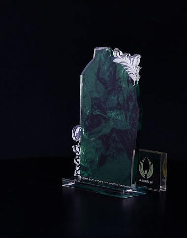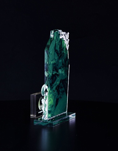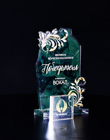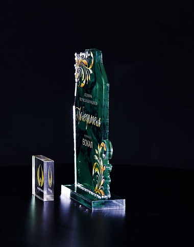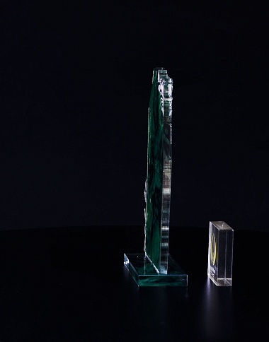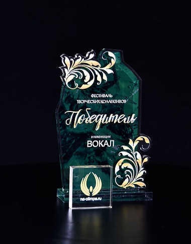 Приз из прозрачного акрила с глянцевой цветной печатью на лицевой стороне и полупрозрачной печатью на задней стенке награды и постаменте.