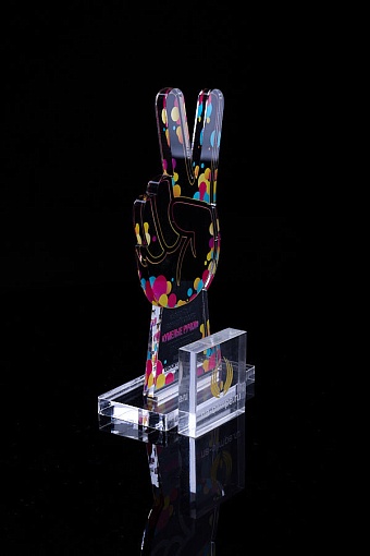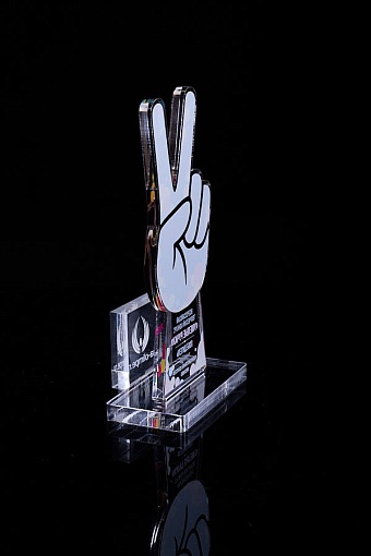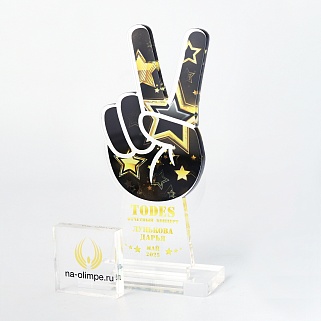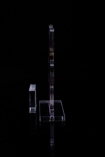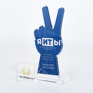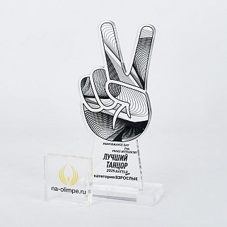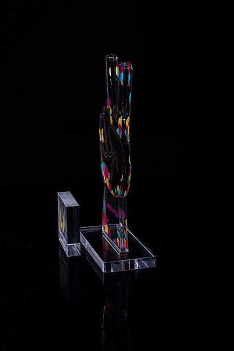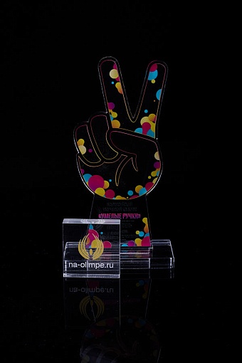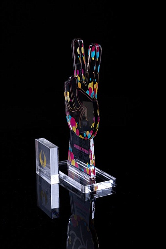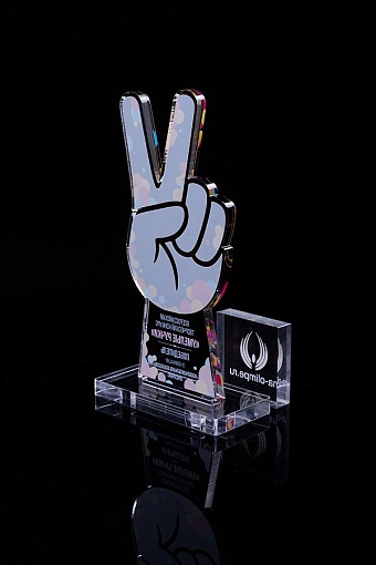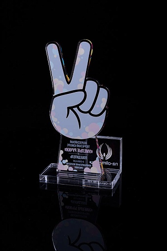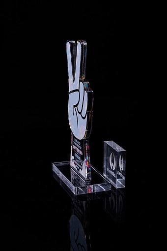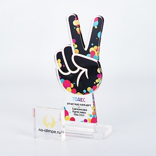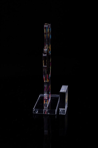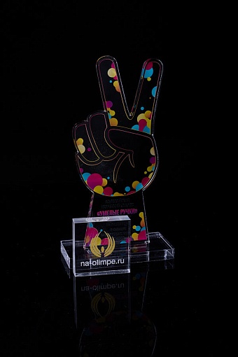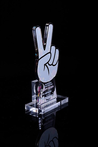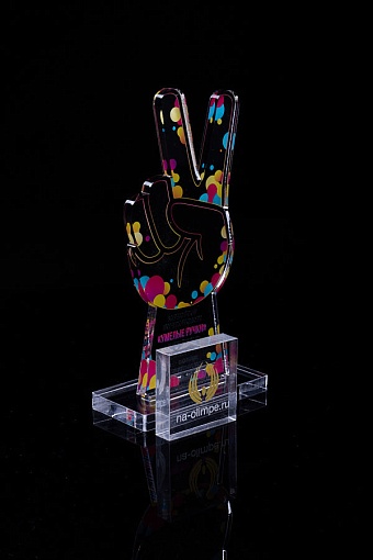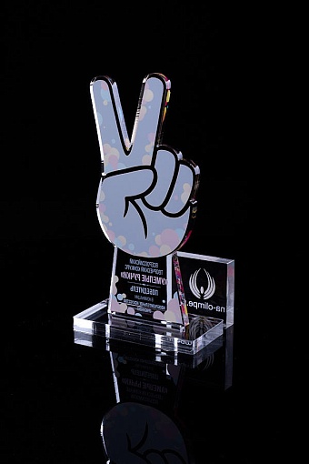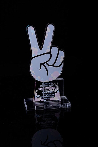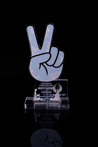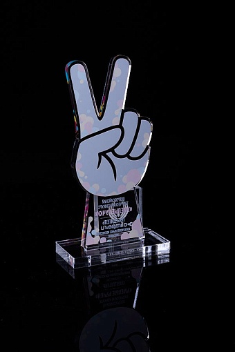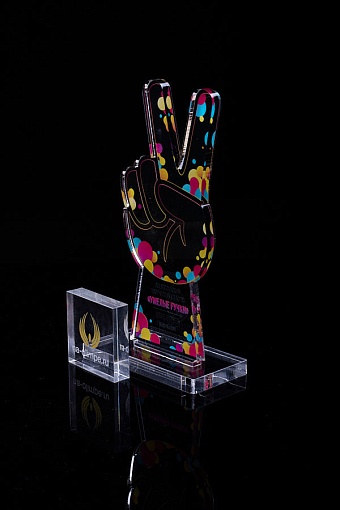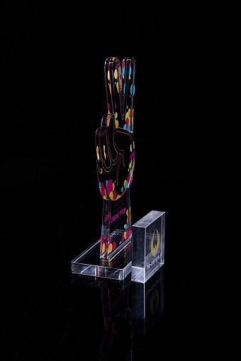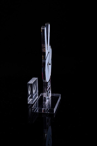 Награда из прозрачного акрила с цветной печатью на постаменте. Акриловая вертикальная основа вставляется в постамент в паз. Такая конструкция проста и надежна в эксплуатации и при транспортировке, так как не имеет склеенных элементов.