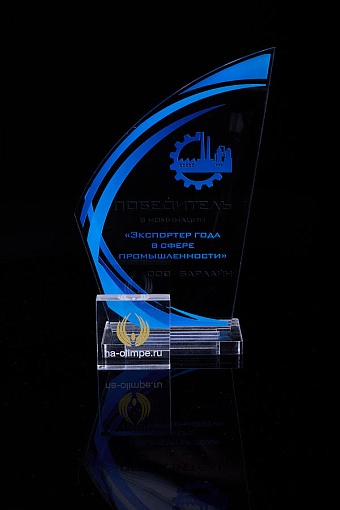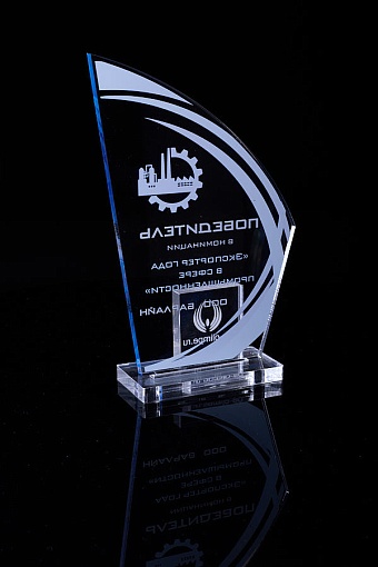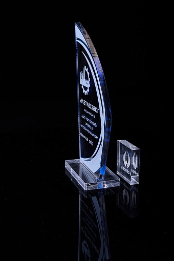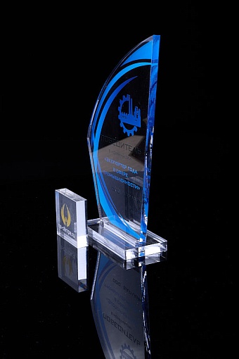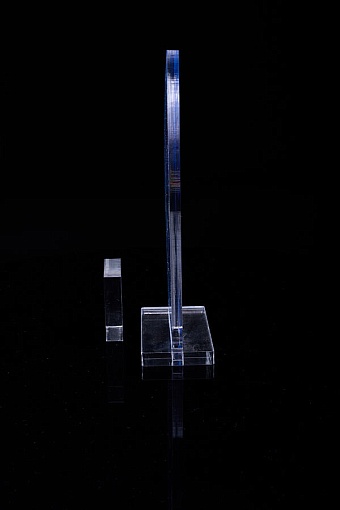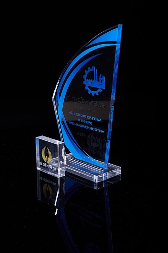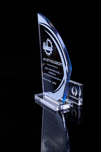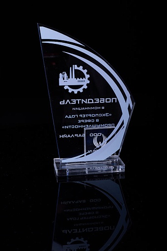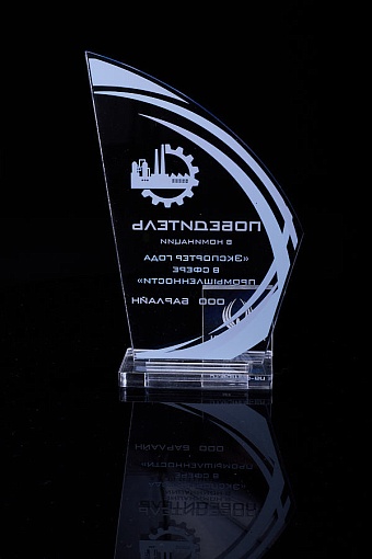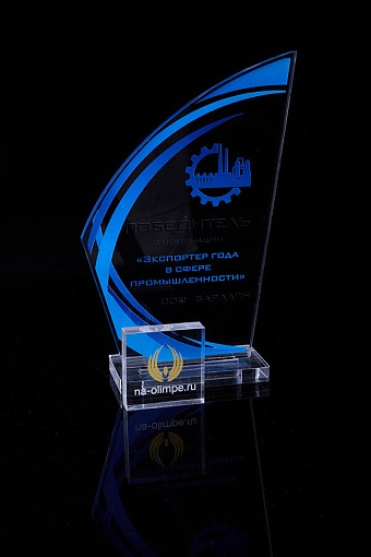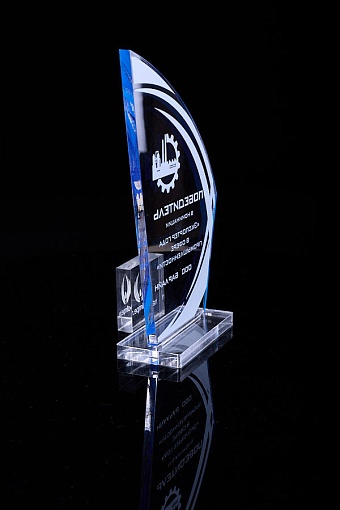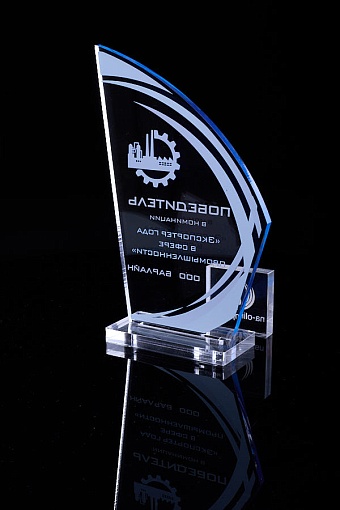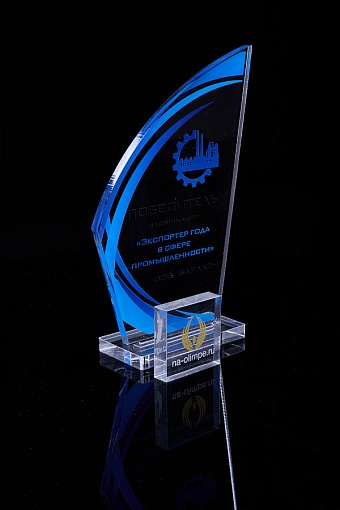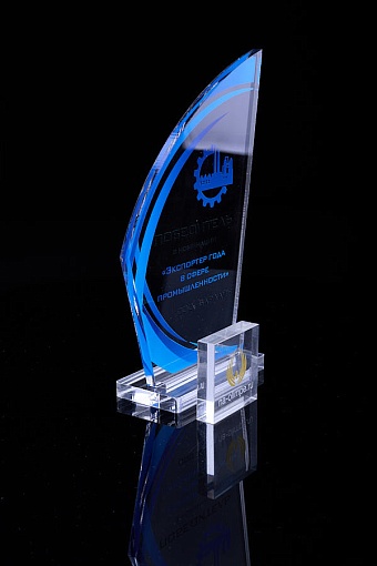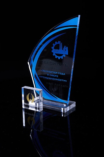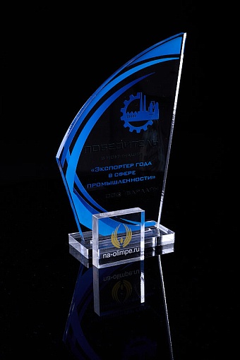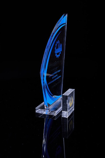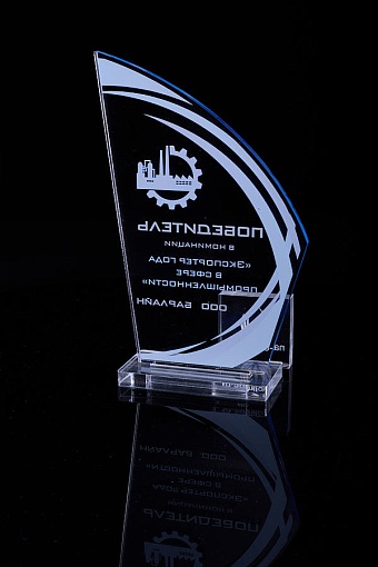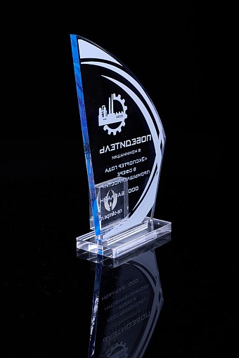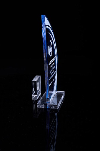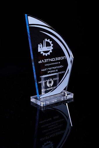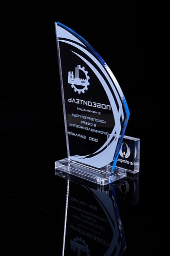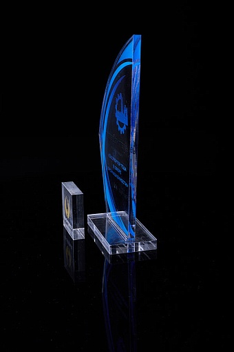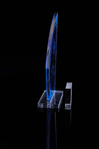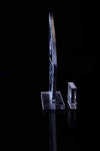 Награда из прозрачного акрила с цветной печатью на постаменте. Акриловая вертикальная основа вставляется в постамент в паз. Такая конструкция проста и надежна в эксплуатации и при транспортировке, так как не имеет склеенных элементов.