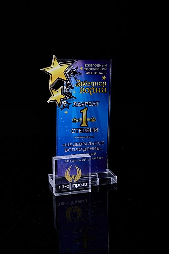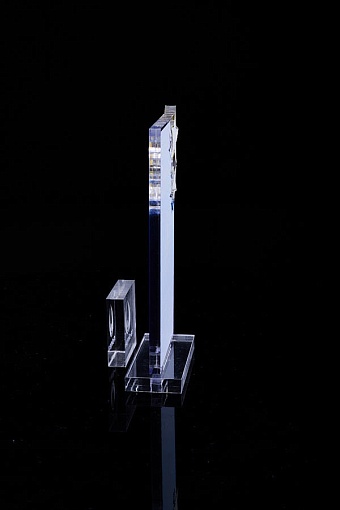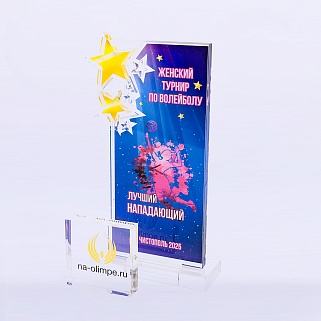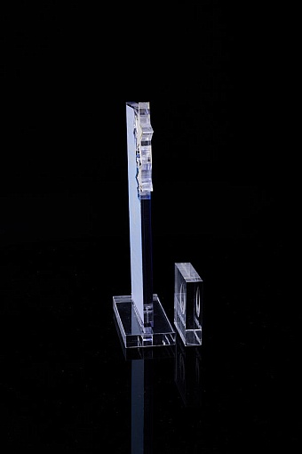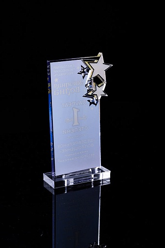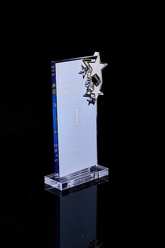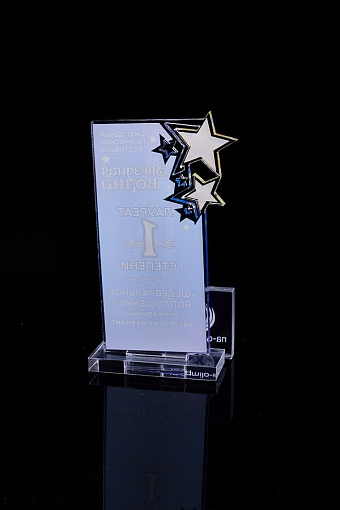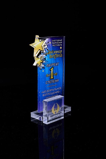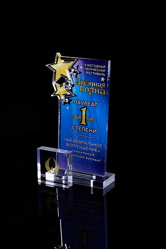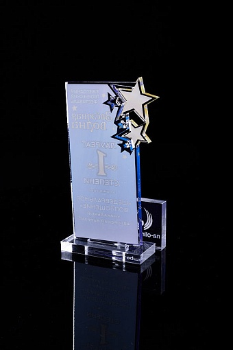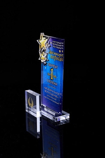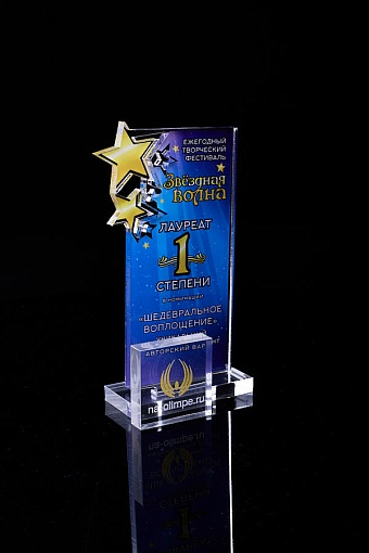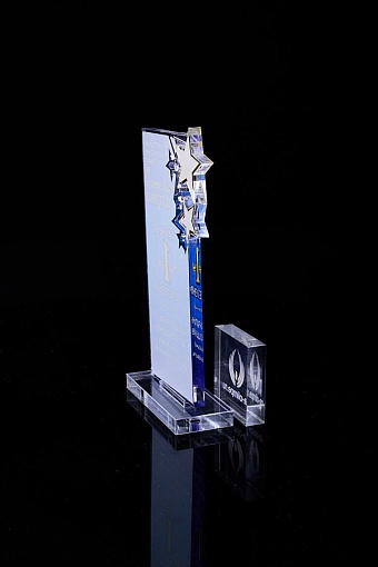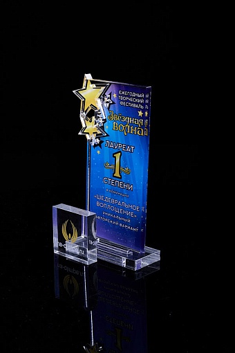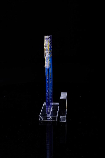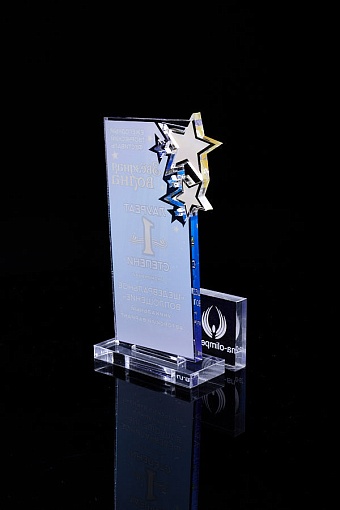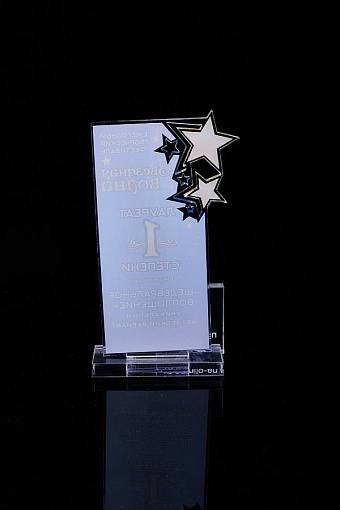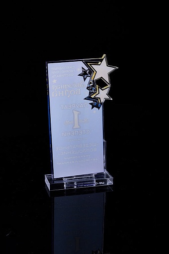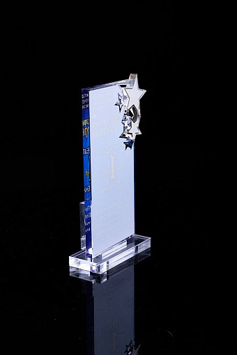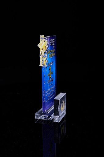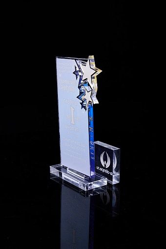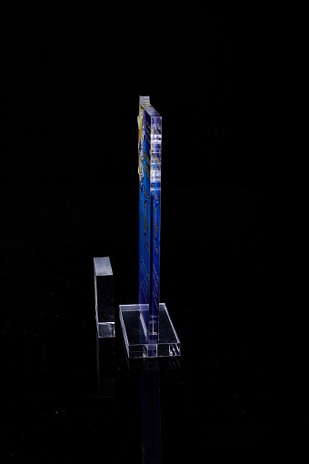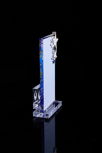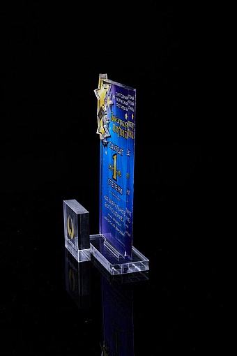 Награда из прозрачного акрила с цветной печатью на постаменте. Акриловая вертикальная основа вставляется в постамент в паз. Такая конструкция проста и надежна в эксплуатации и при транспортировке, так как не имеет склеенных элементов.