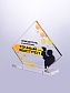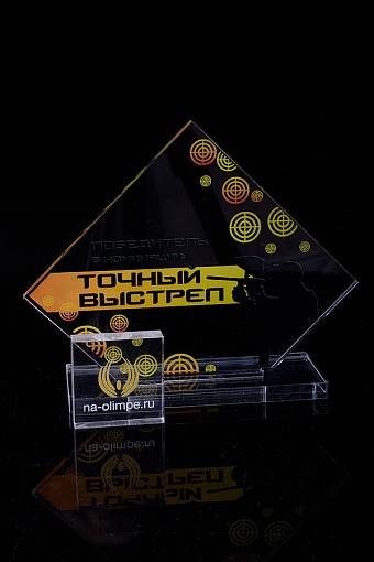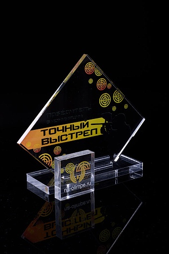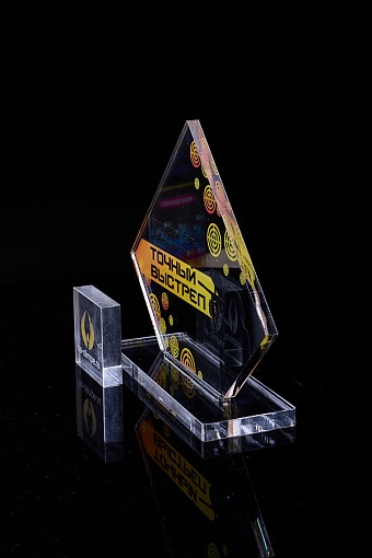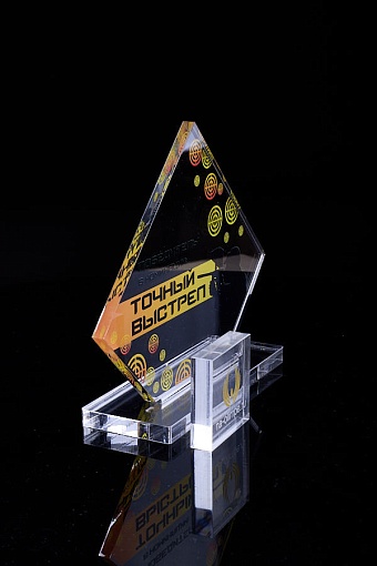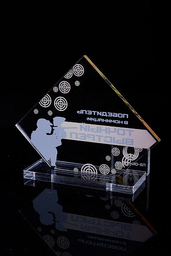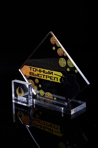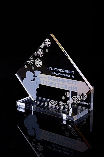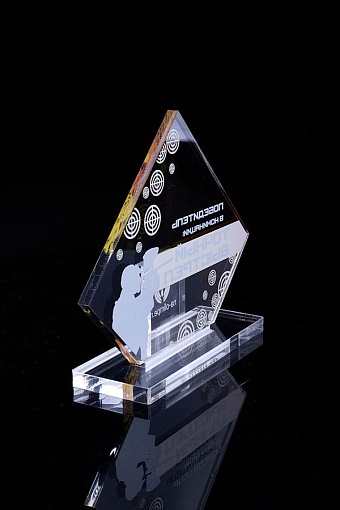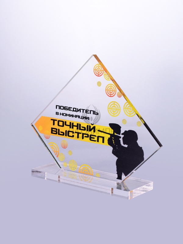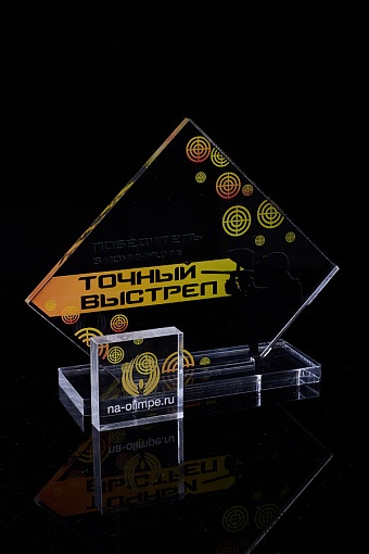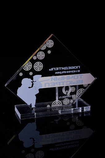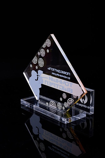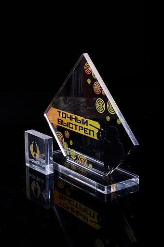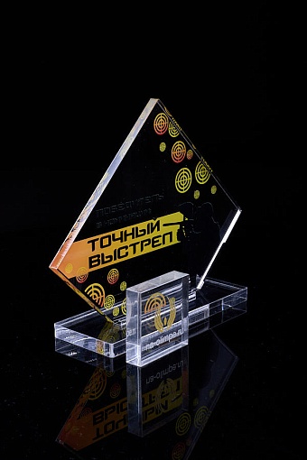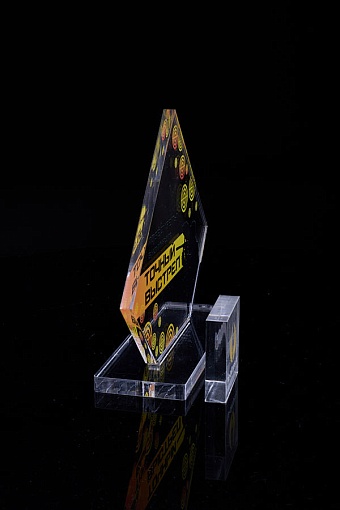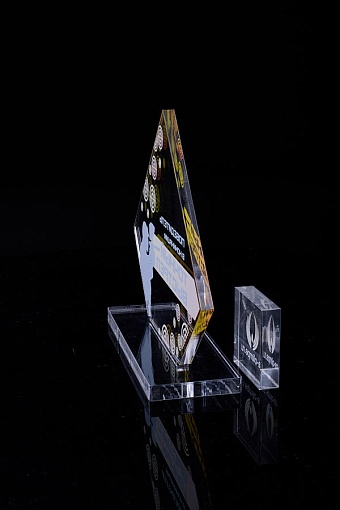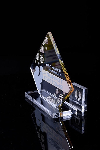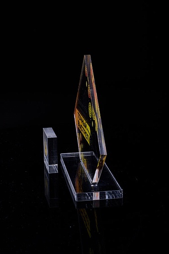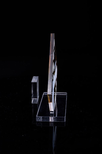 Награда из прозрачного акрила с цветной печатью на постаменте. Акриловая вертикальная основа вставляется в постамент в паз. Такая конструкция проста и надежна в эксплуатации и при транспортировке, так как не имеет склеенных элементов.