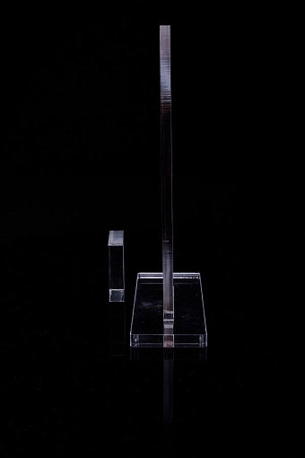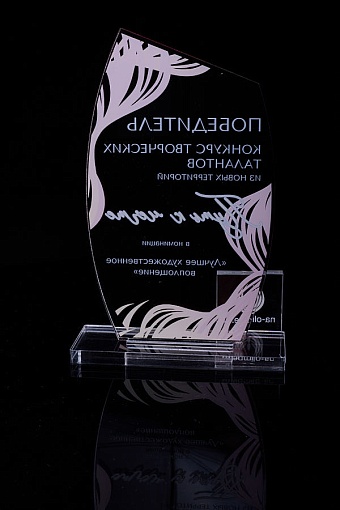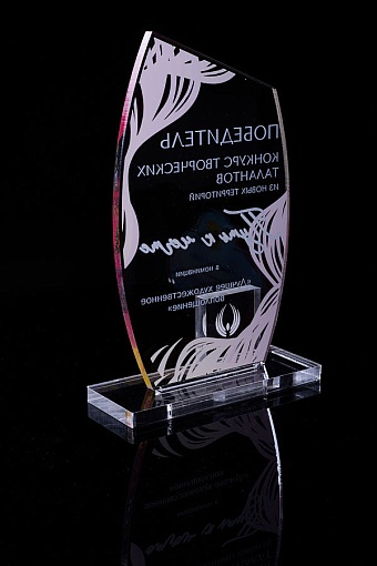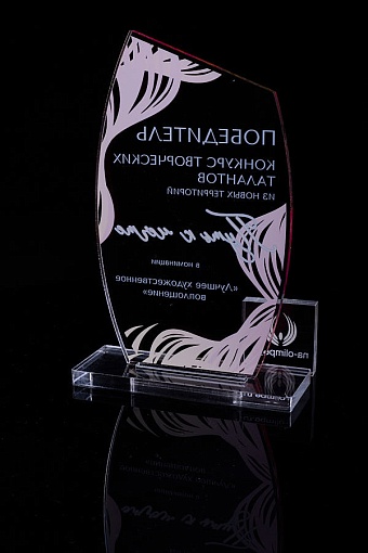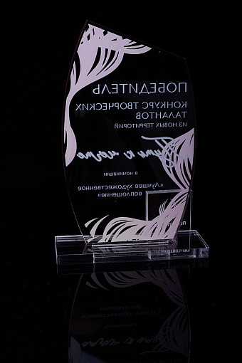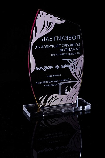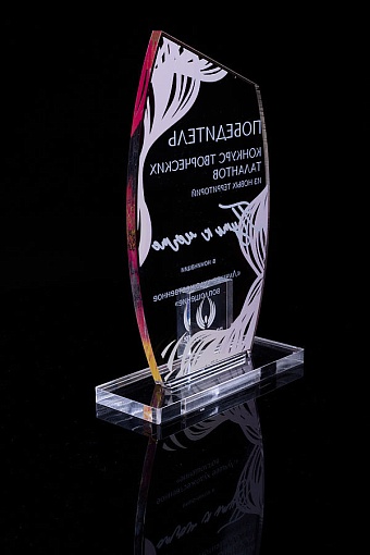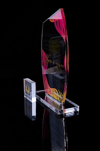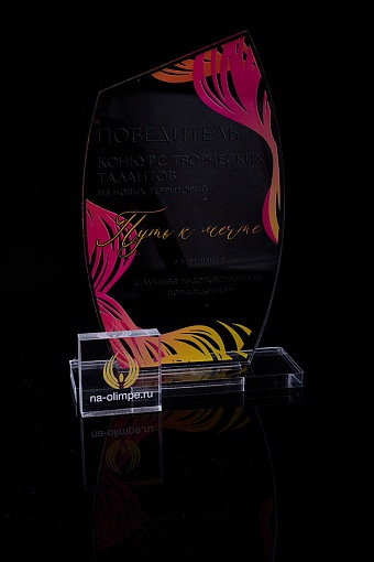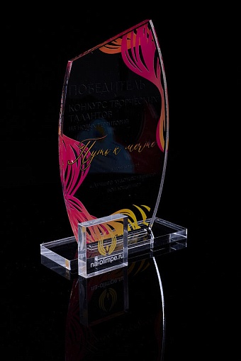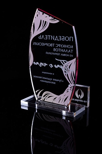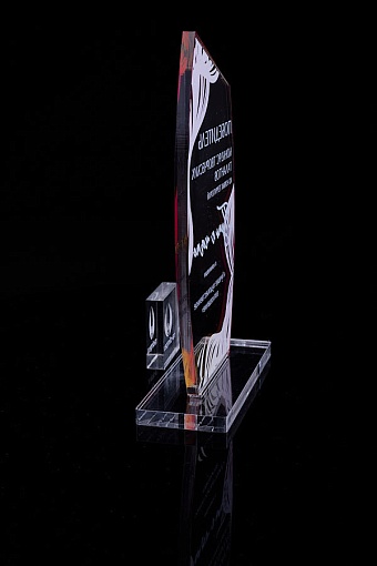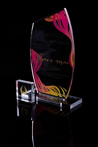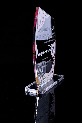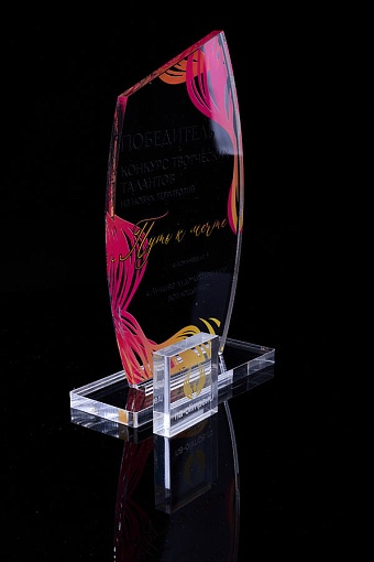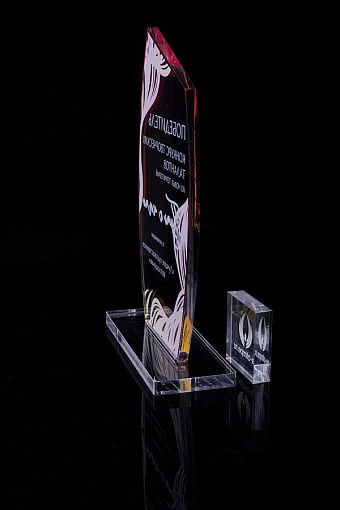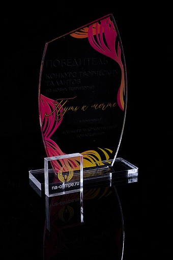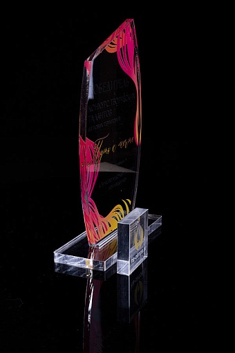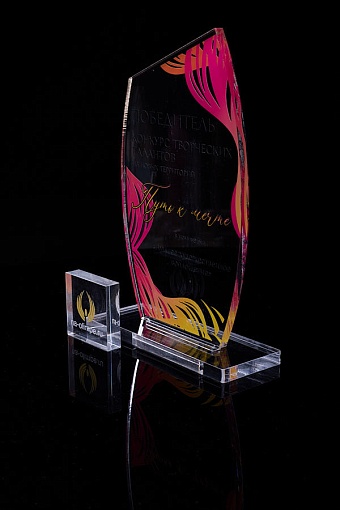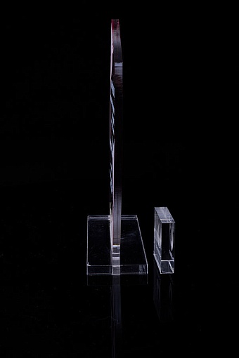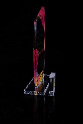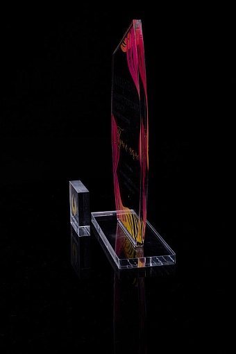 Награда из прозрачного акрила с цветной печатью на постаменте. Акриловая вертикальная основа вставляется в постамент в паз. Такая конструкция проста и надежна в эксплуатации и при транспортировке, так как не имеет склеенных элементов.