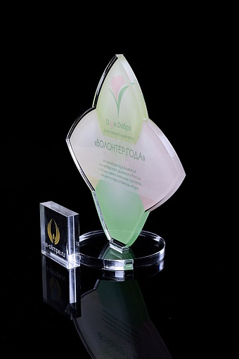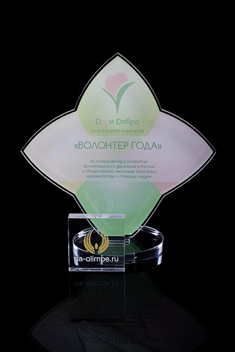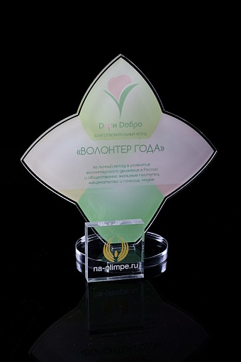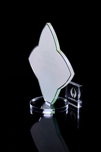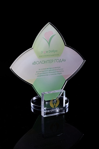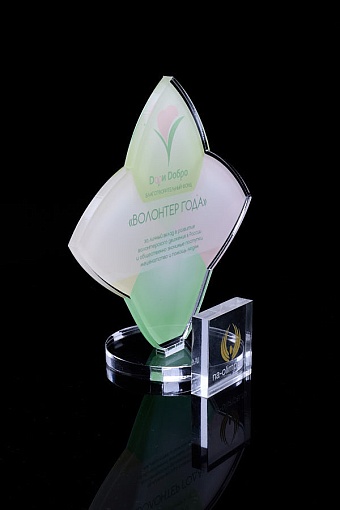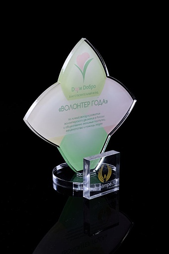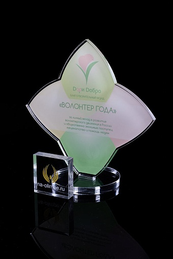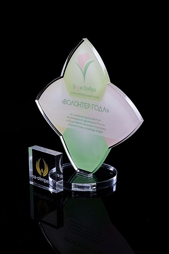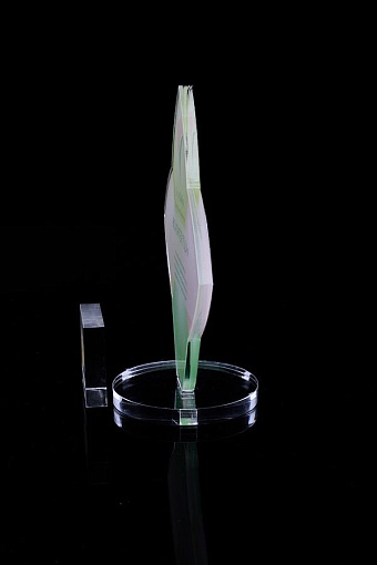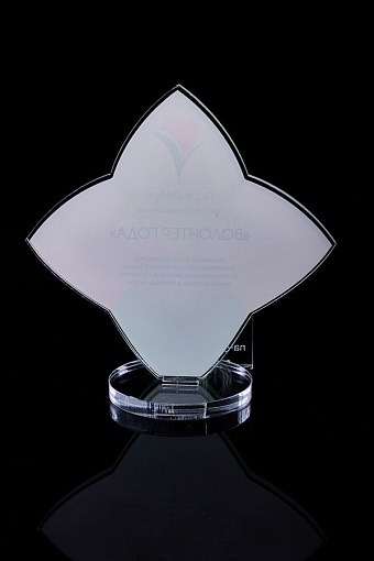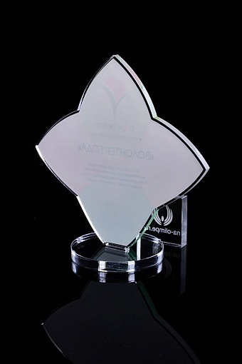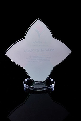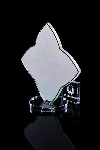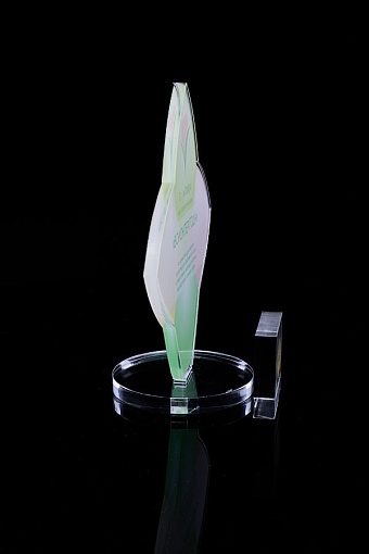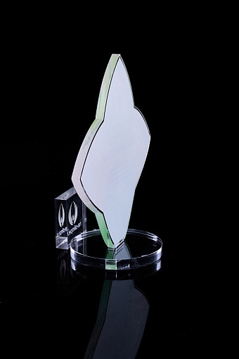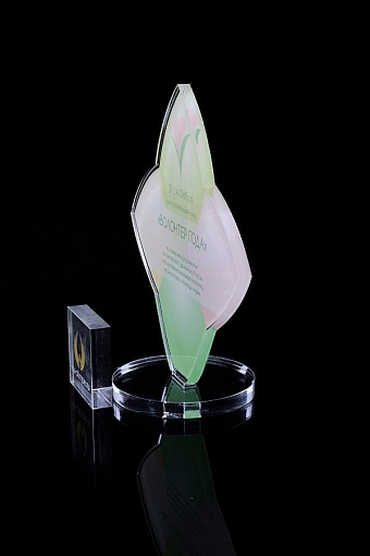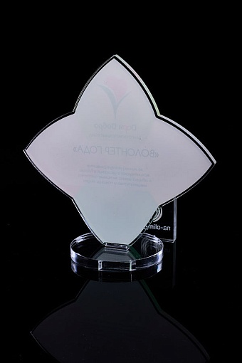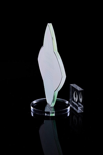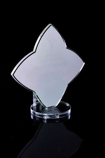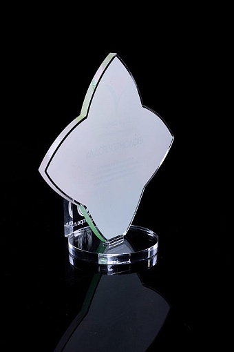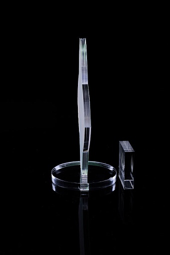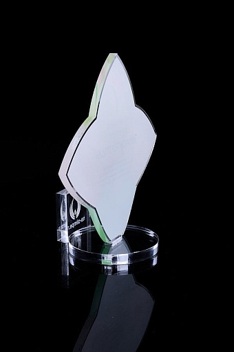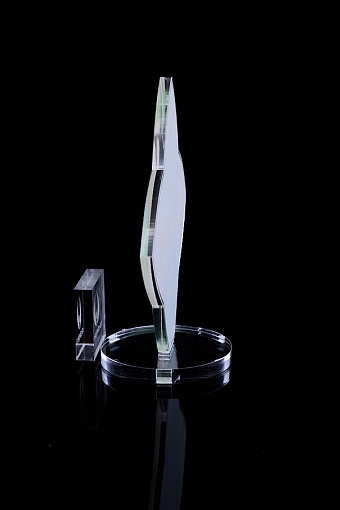 Награда из прозрачного акрила с цветной печатью на постаменте. Акриловая вертикальная основа вставляется в постамент в паз. Такая конструкция проста и надежна в эксплуатации и при транспортировке, так как не имеет склеенных элементов.