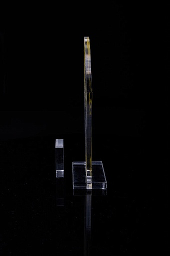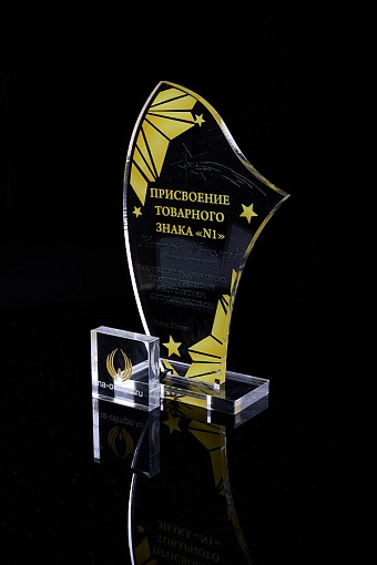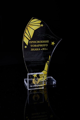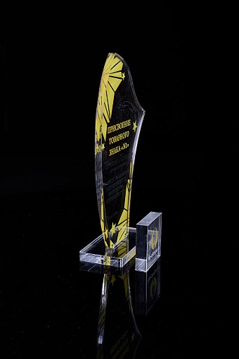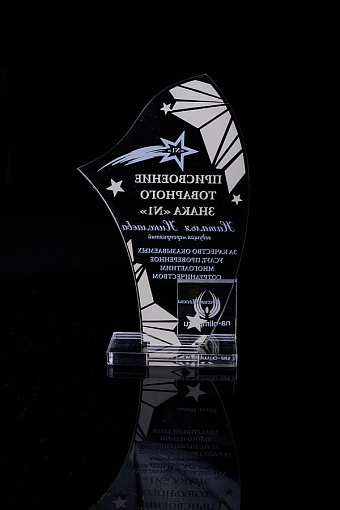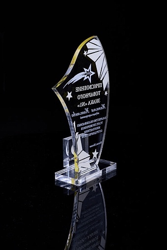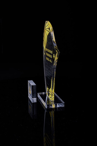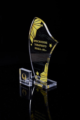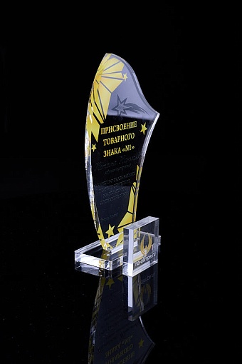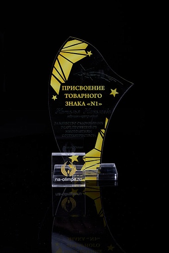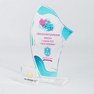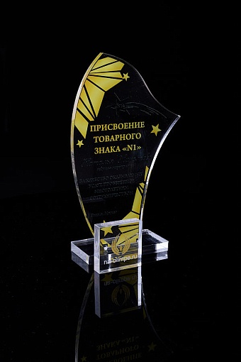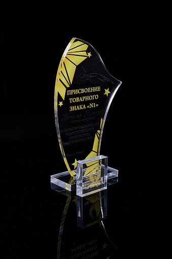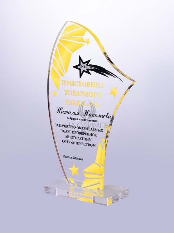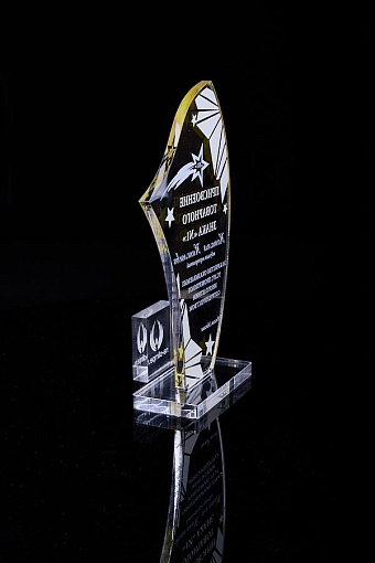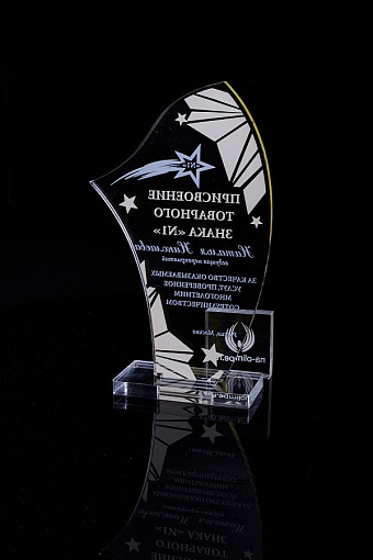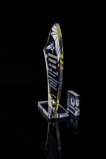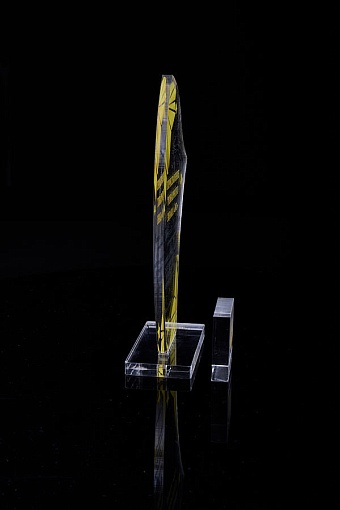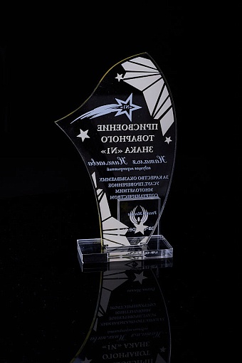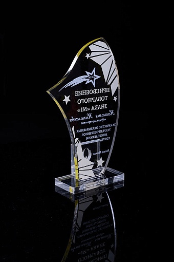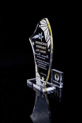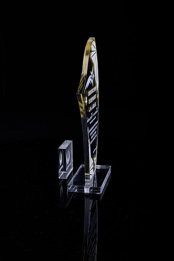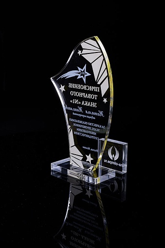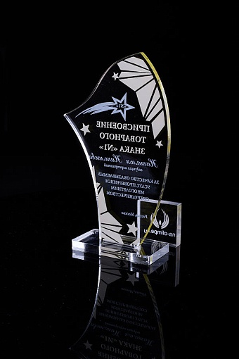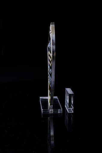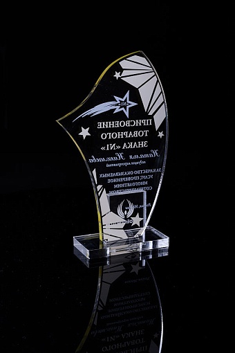 Награда из прозрачного акрила с цветной печатью на постаменте. Акриловая вертикальная основа вставляется в постамент в паз. Такая конструкция проста и надежна в эксплуатации и при транспортировке, так как не имеет склеенных элементов.