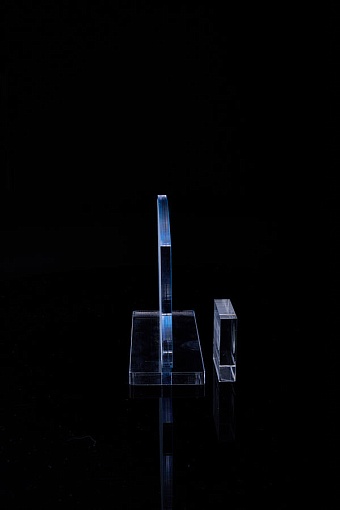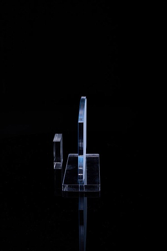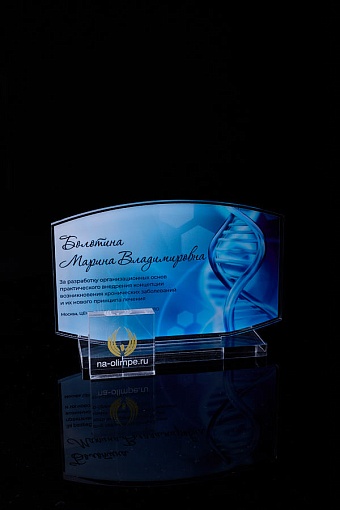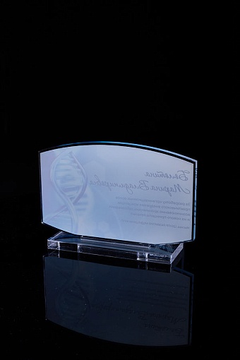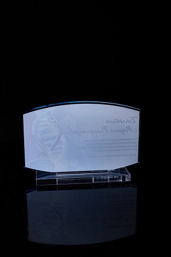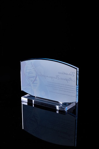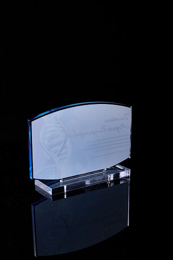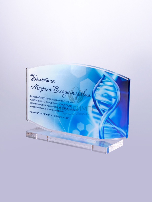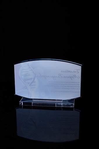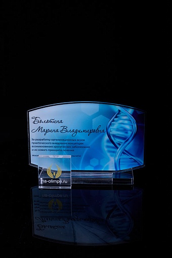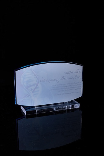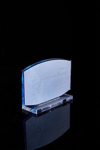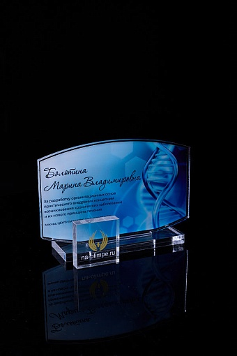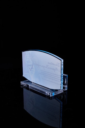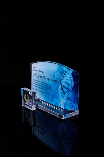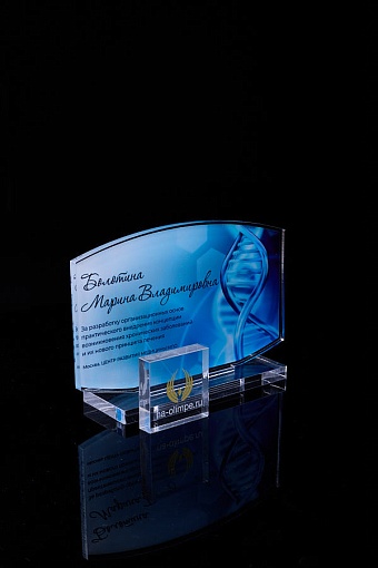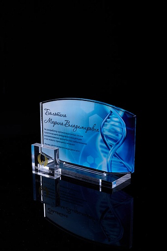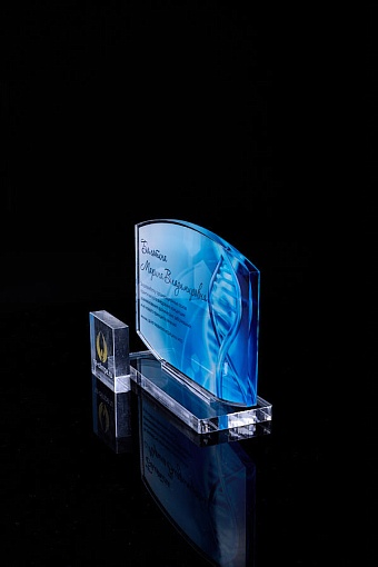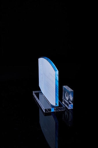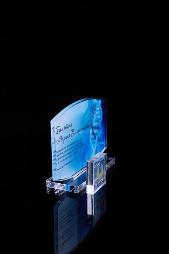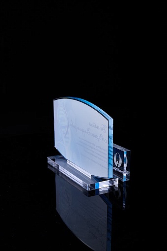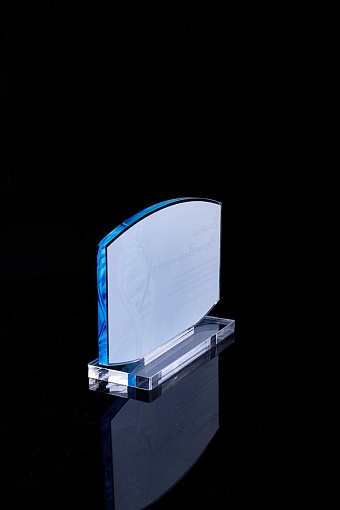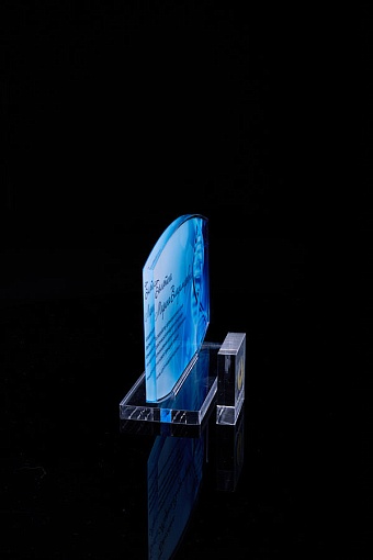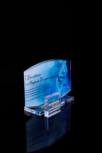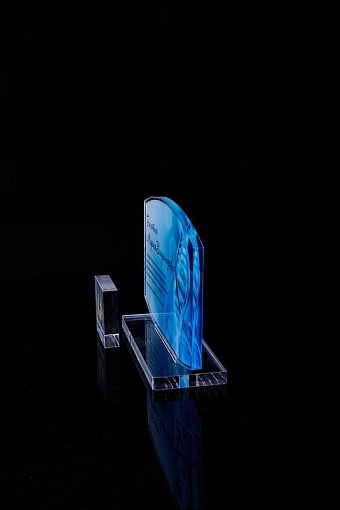 Награда из прозрачного акрила с цветной печатью на постаменте. Акриловая вертикальная основа вставляется в постамент в паз. Такая конструкция проста и надежна в эксплуатации и при транспортировке, так как не имеет склеенных элементов.