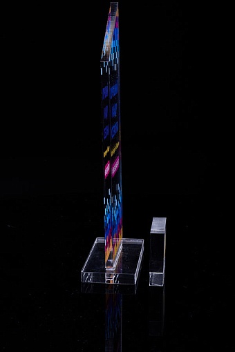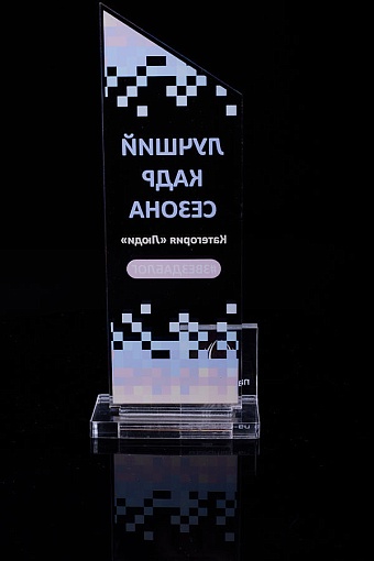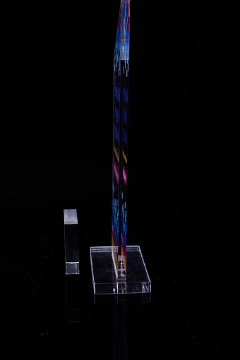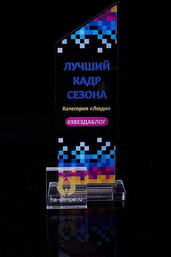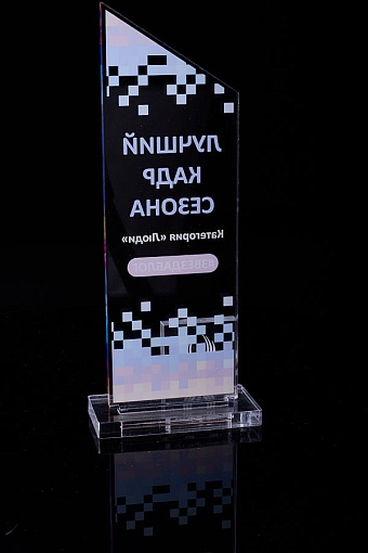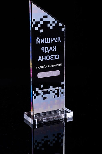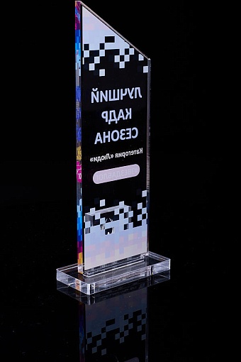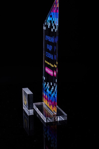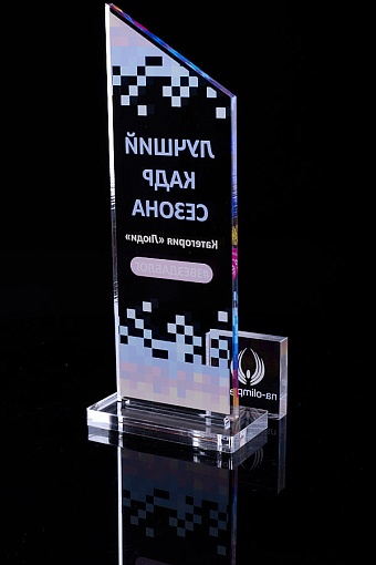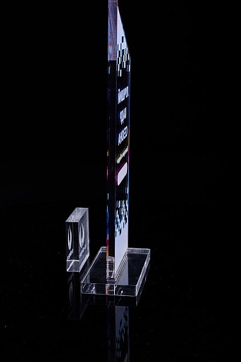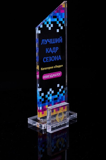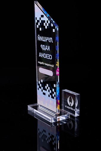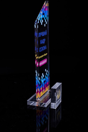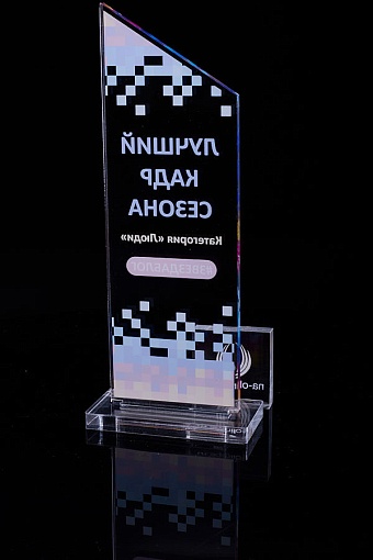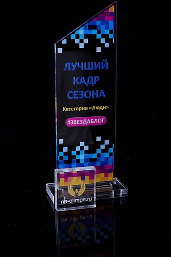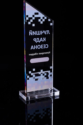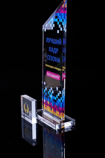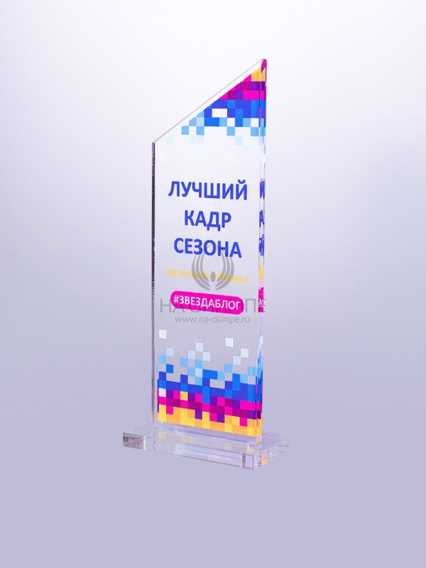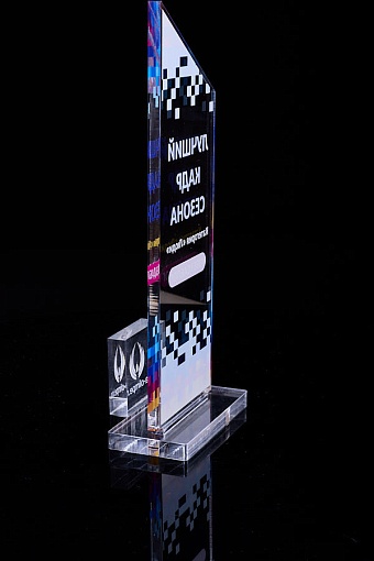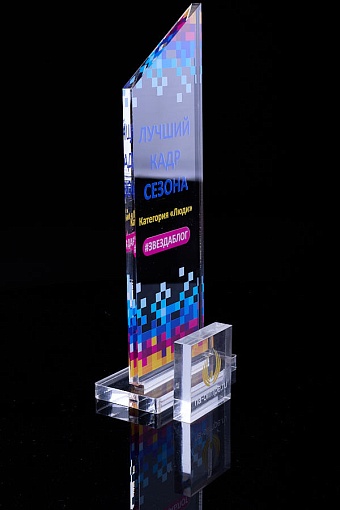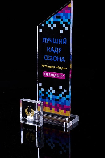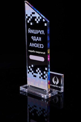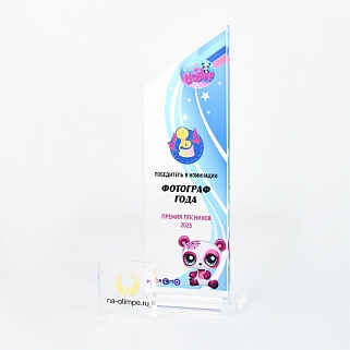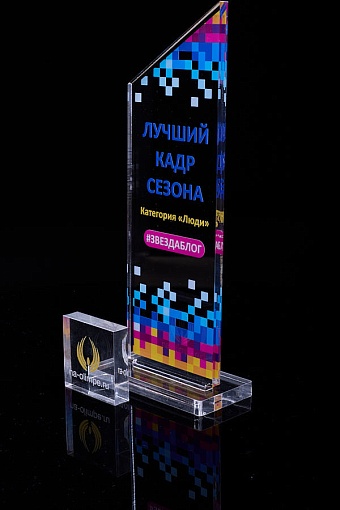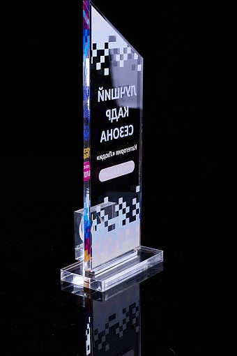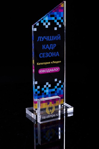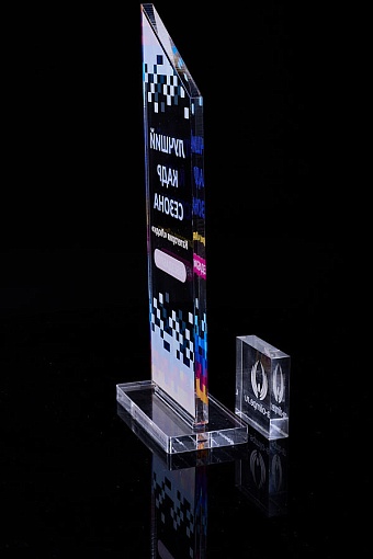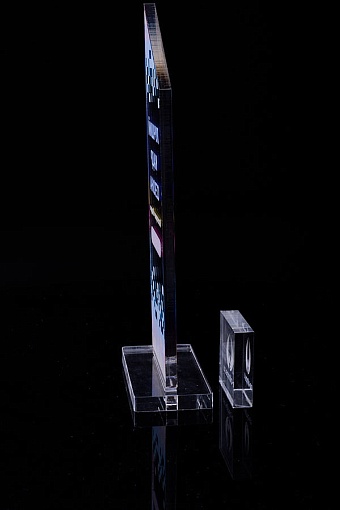 Награда из прозрачного акрила с цветной печатью на постаменте. Акриловая вертикальная основа вставляется в постамент в паз. Такая конструкция проста и надежна в эксплуатации и при транспортировке, так как не имеет склеенных элементов.