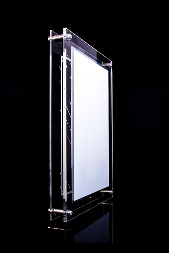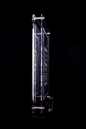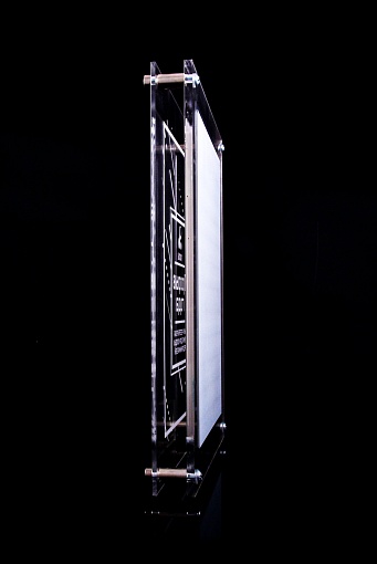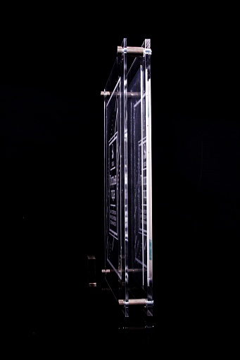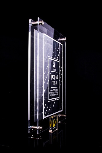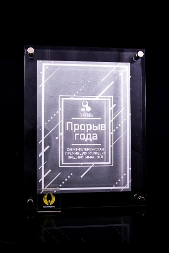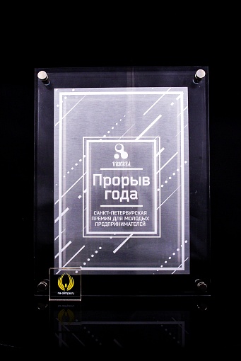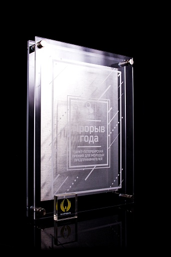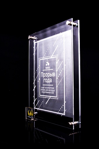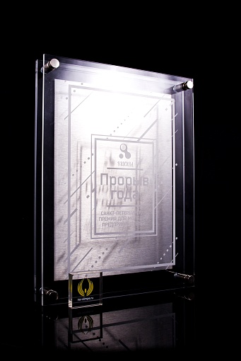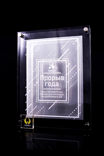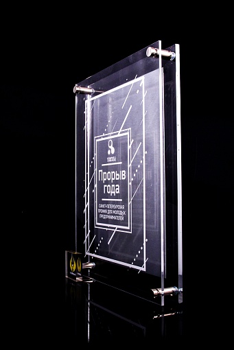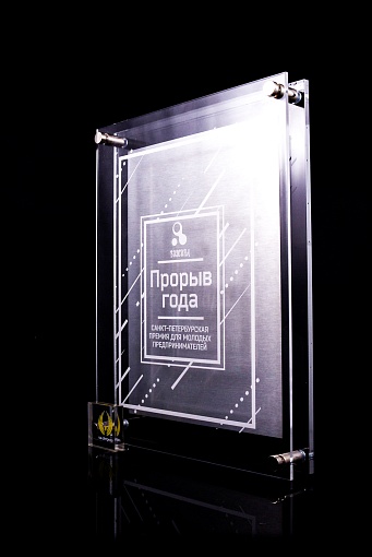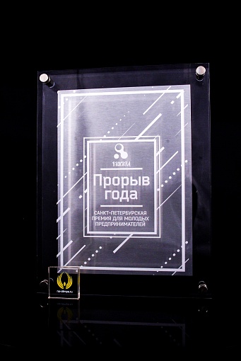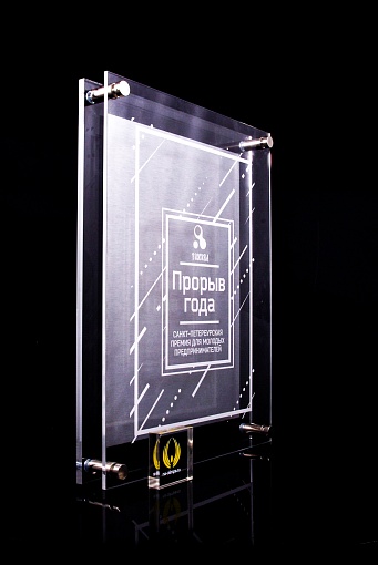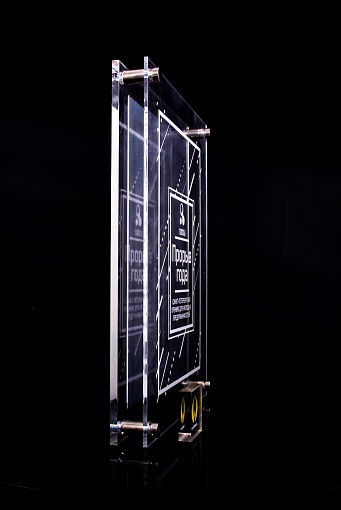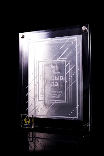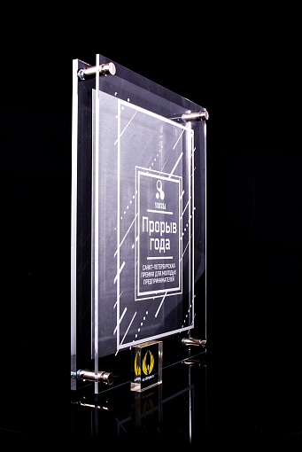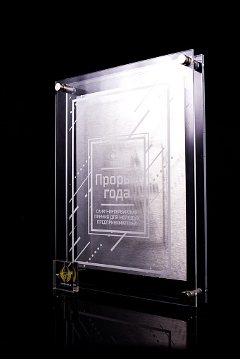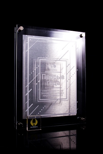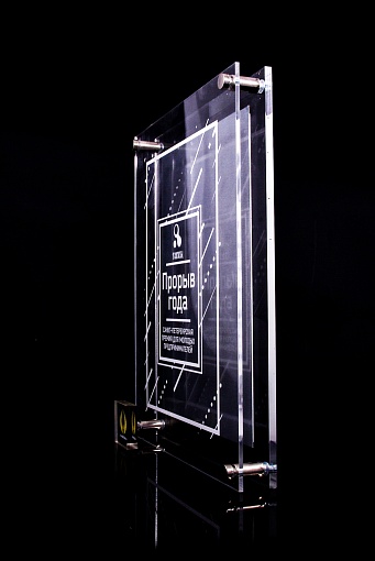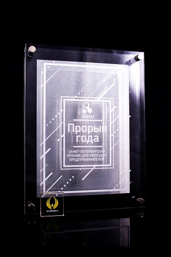 Приз из 2-х листов прозрачного акрила с гравировкой, с дистанционными держателями и подложкой из серебристого матового металла.
