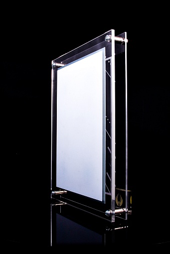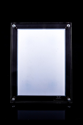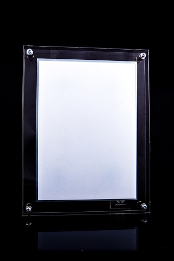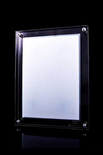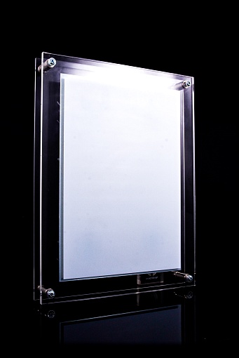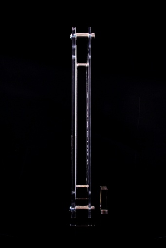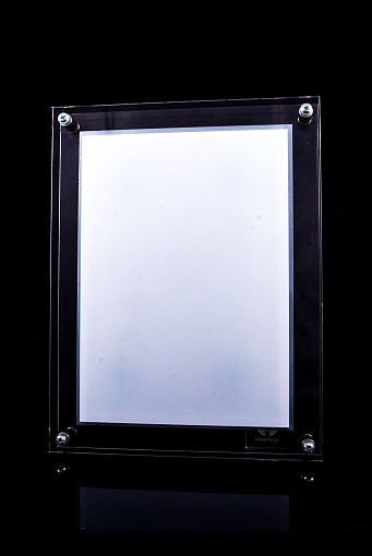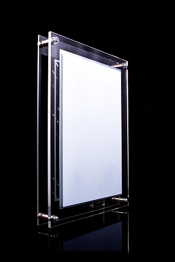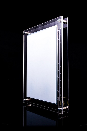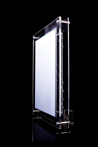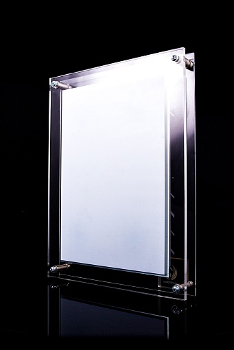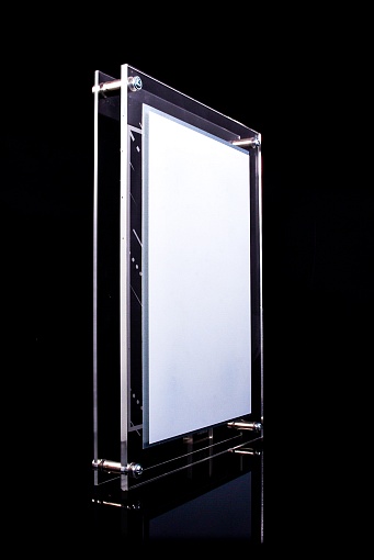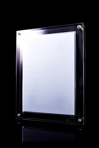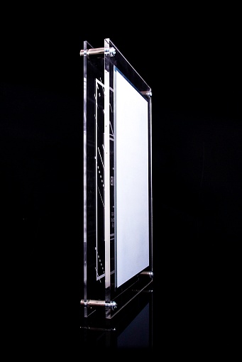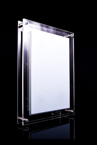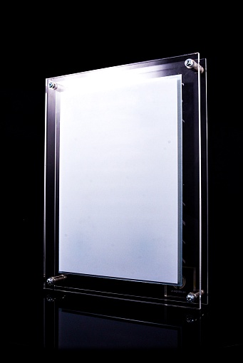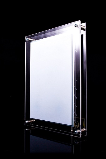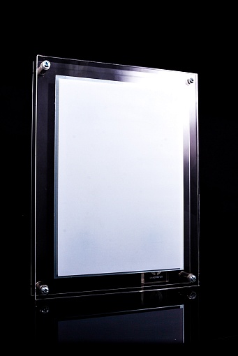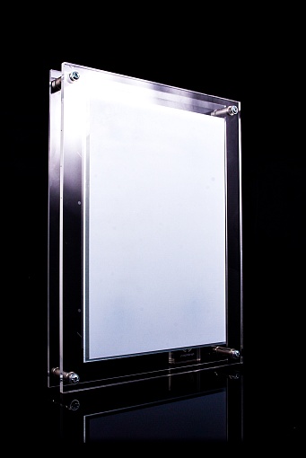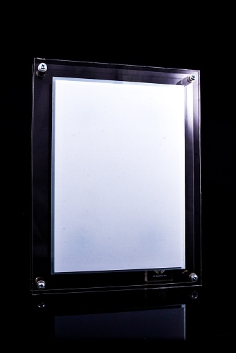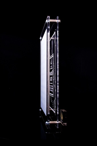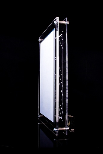Приз из 2-х листов прозрачного акрила с гравировкой, с дистанционными держателями и подложкой из серебристого матового металла.