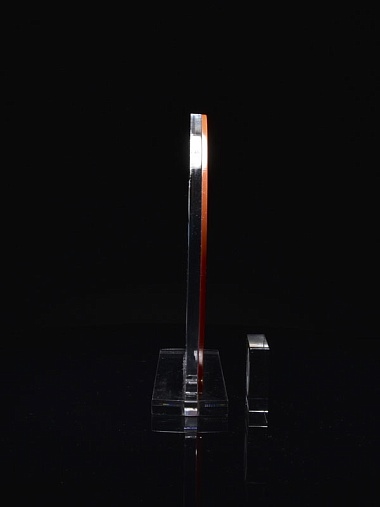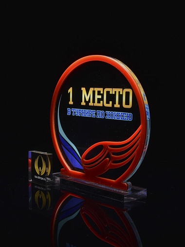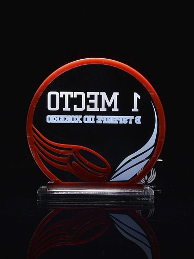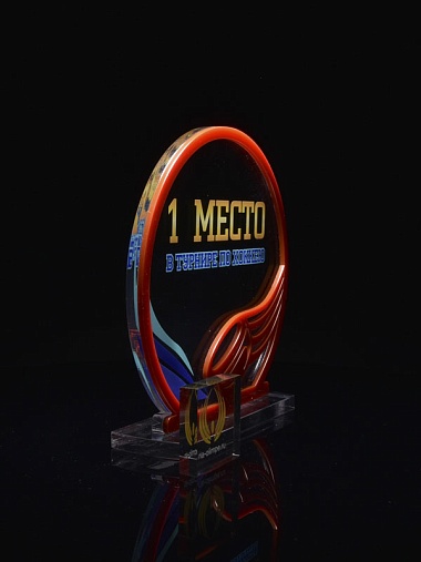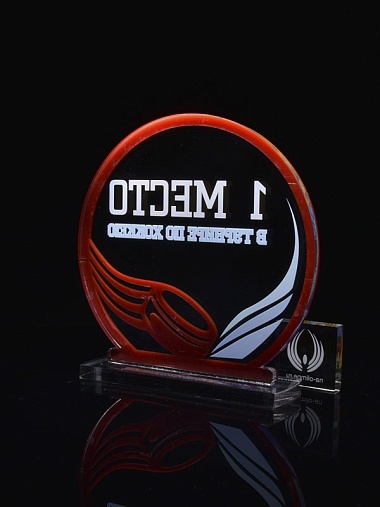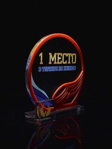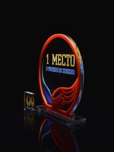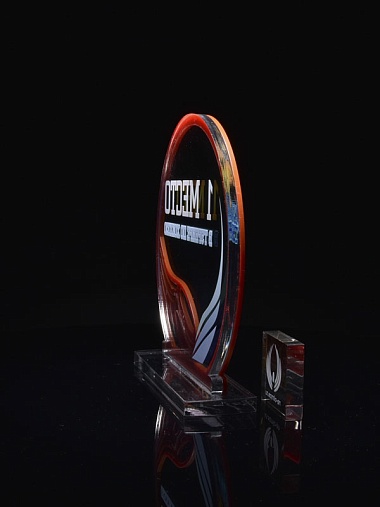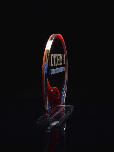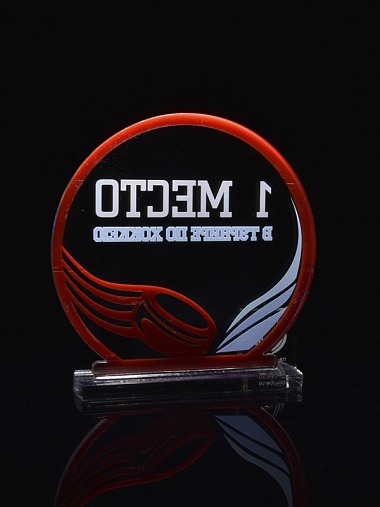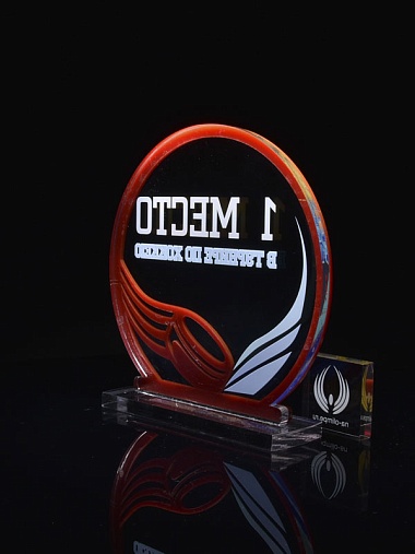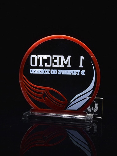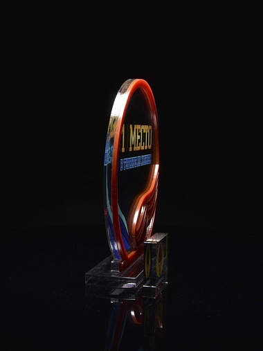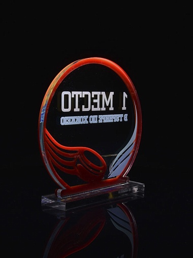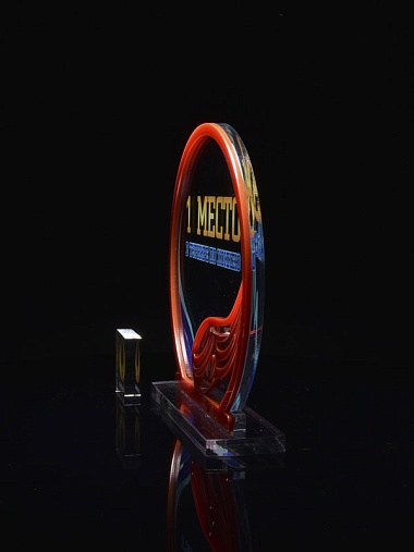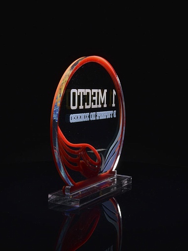 Приз из красного и прозрачного акрила с цветным нанесением.