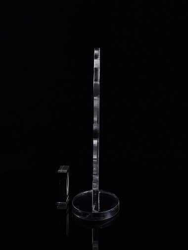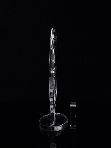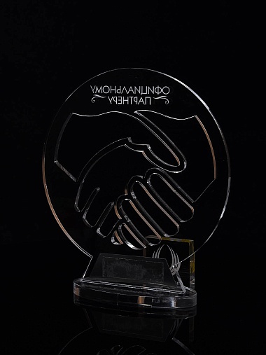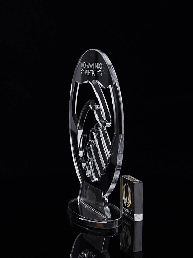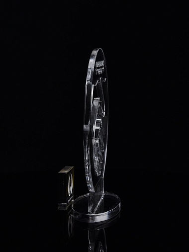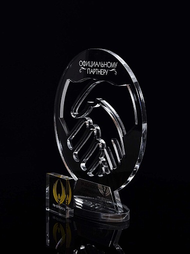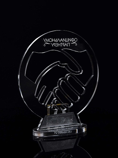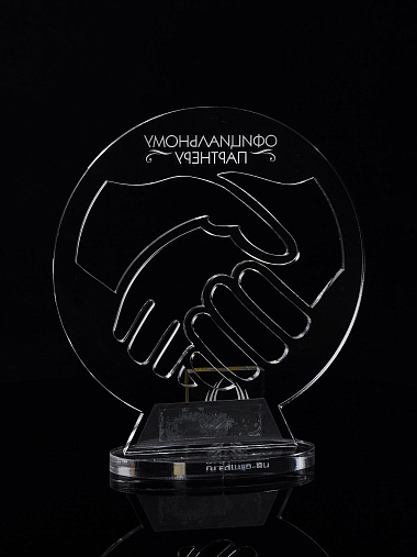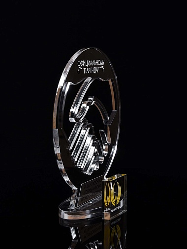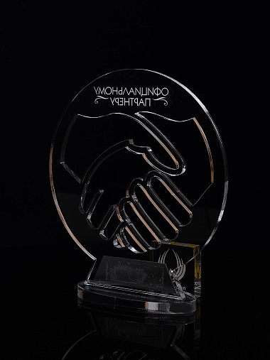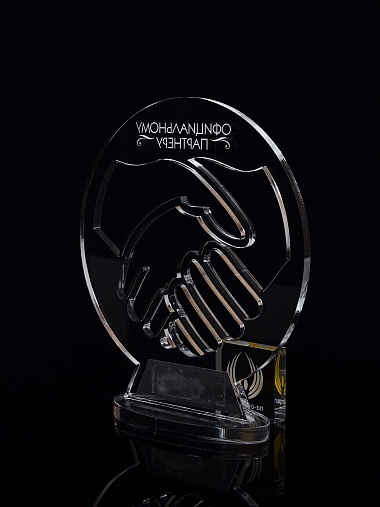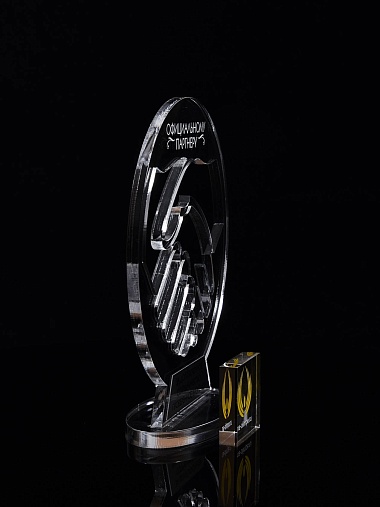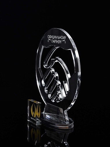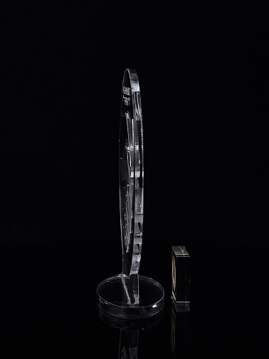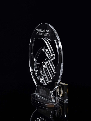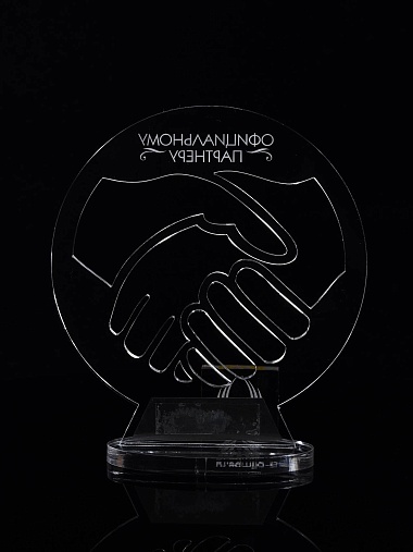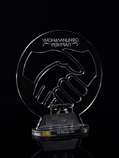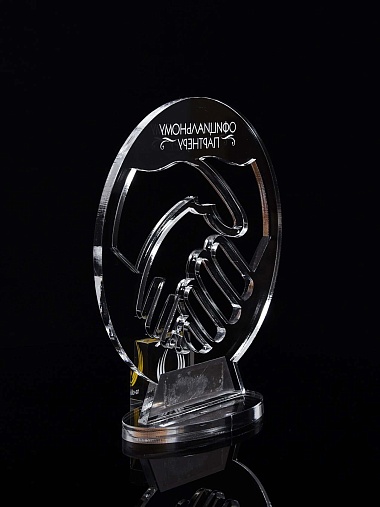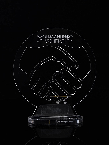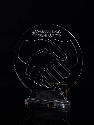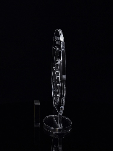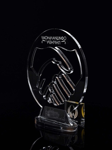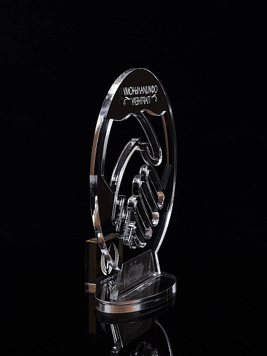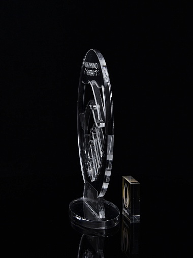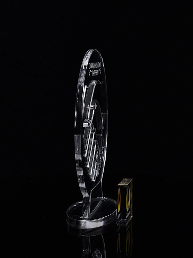 Приз из прозрачного акрила сгравировкой и металлической табличкой.