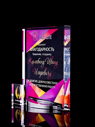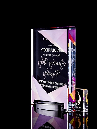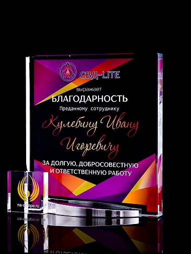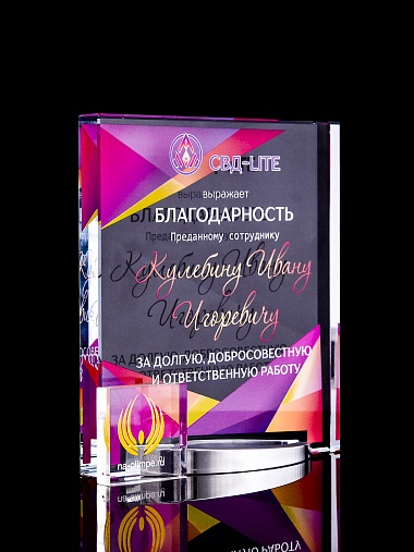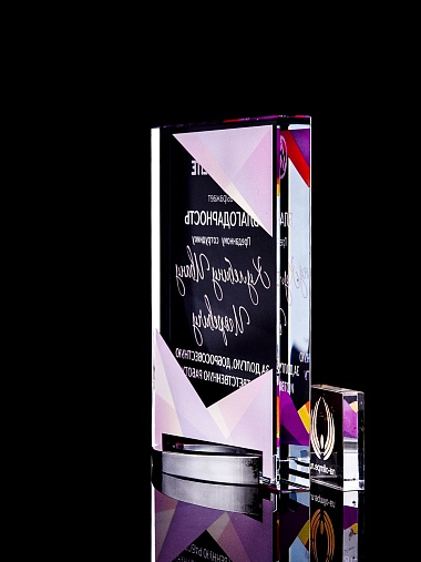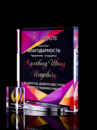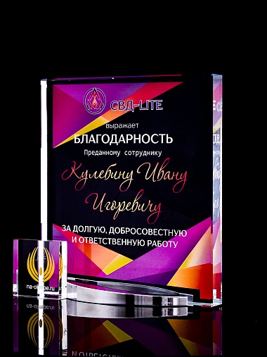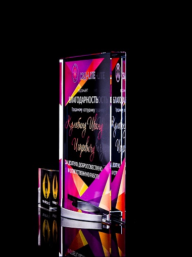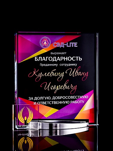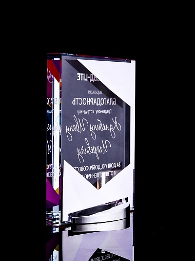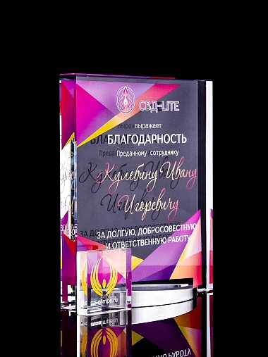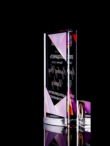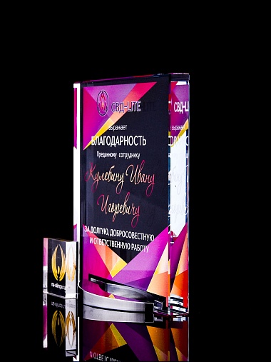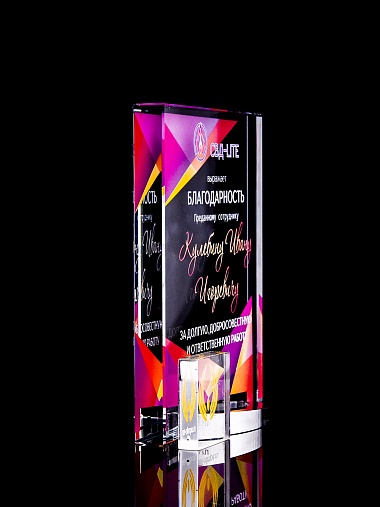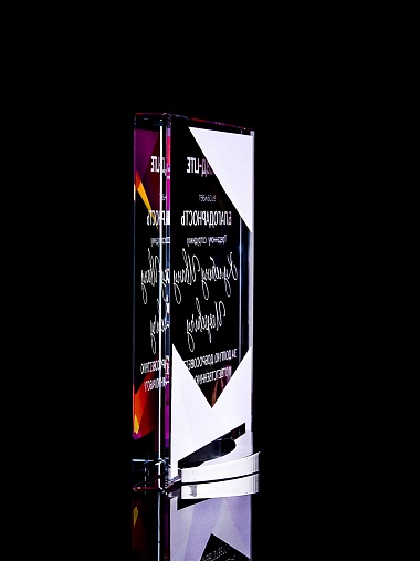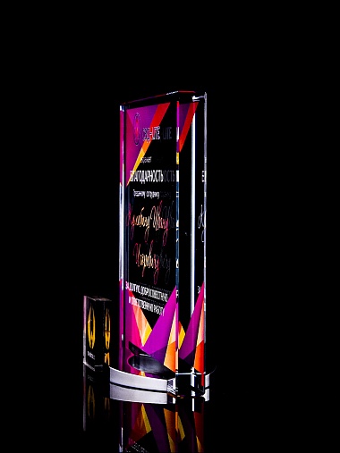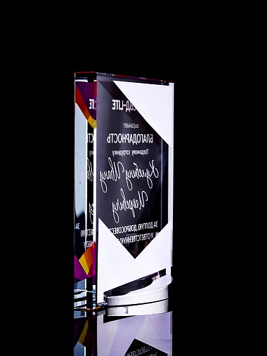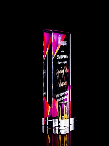 Стеклянная награда с полноцветным нанесением. Толщина стекла 15 мм. Поставляется в комплекте с подарочным футляром. Вес награды без футляра 838гр. Стоимость указана за нанесение на лицевой и оборотной стороне награды. Стоимость указана за нанесение на одной стороне, печать выполняется на задней стенке награды.