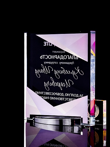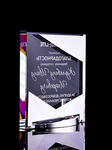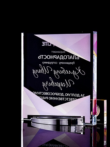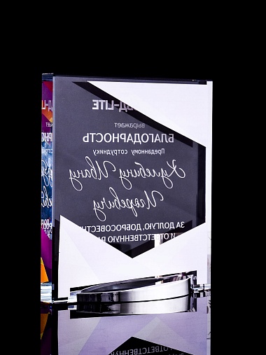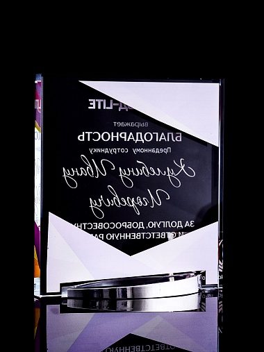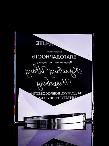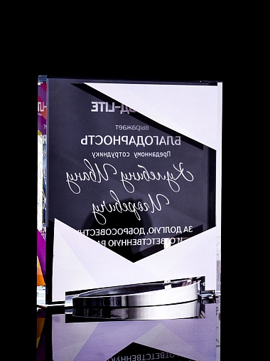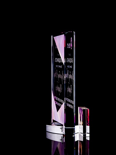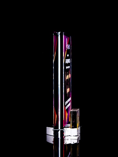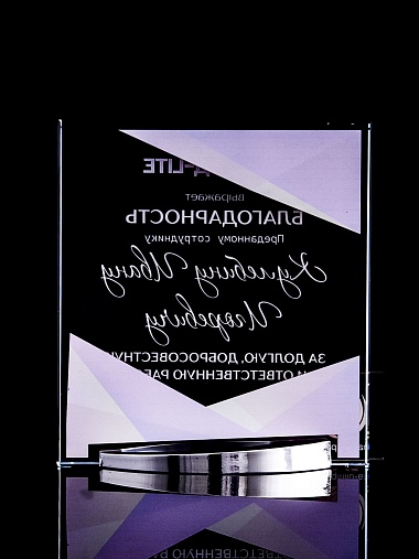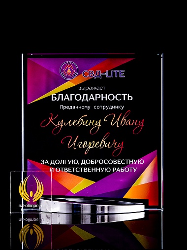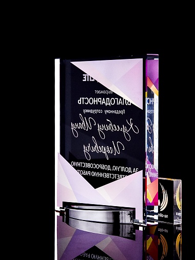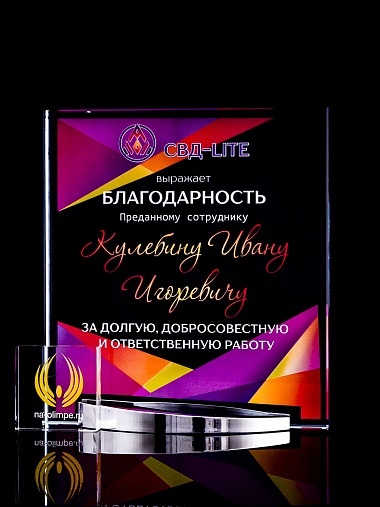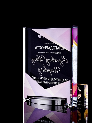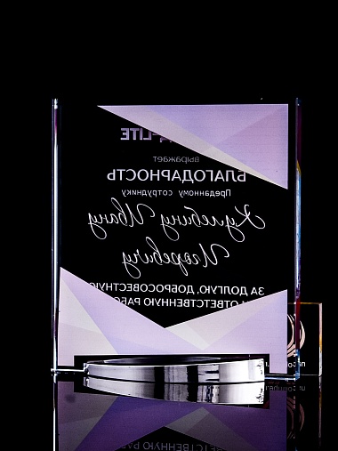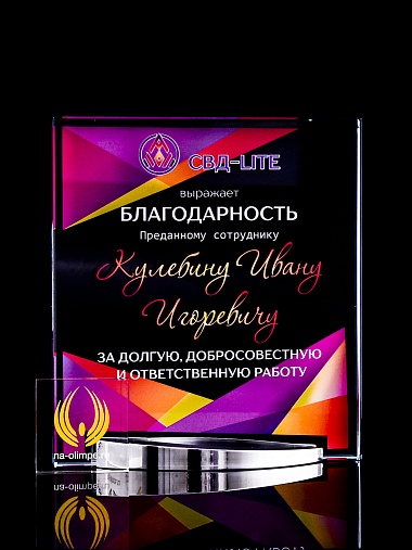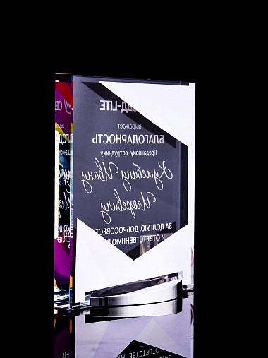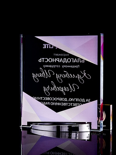 Стеклянная награда с полноцветным нанесением. Толщина стекла 15 мм. Поставляется в комплекте с подарочным футляром. Вес награды без футляра 838гр. Стоимость указана за нанесение на лицевой и оборотной стороне награды. Стоимость указана за нанесение на одной стороне, печать выполняется на задней стенке награды.