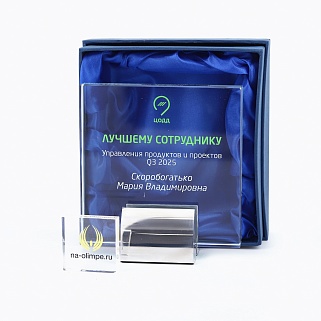 Стеклянная награда с полноцветным нанесением. Толщина стекла 19 мм. Поставляется в комплекте с подарочным футляром. Вес награды без футляра 820гр. Стоимость указана за нанесение на лицевой и оборотной стороне награды.