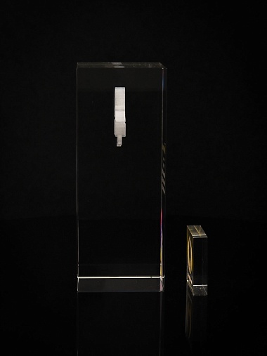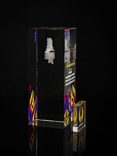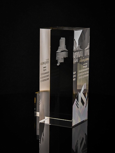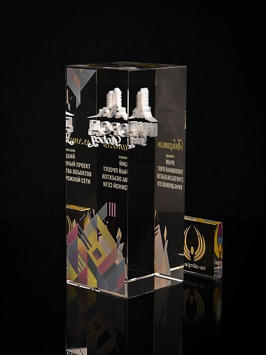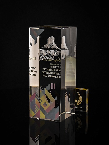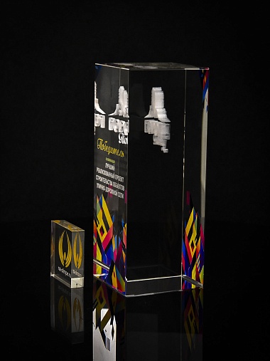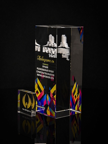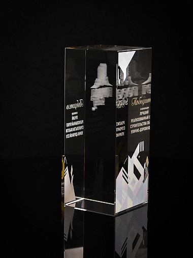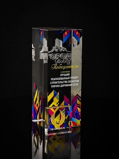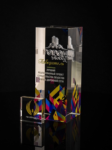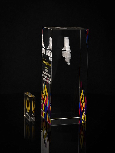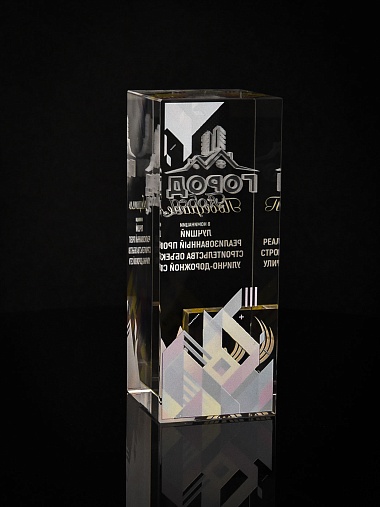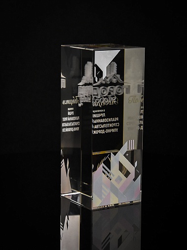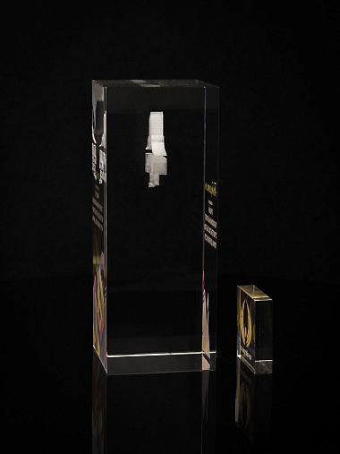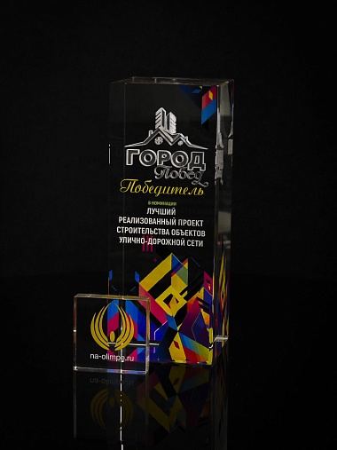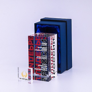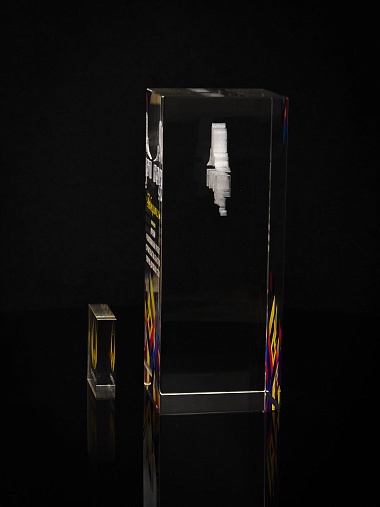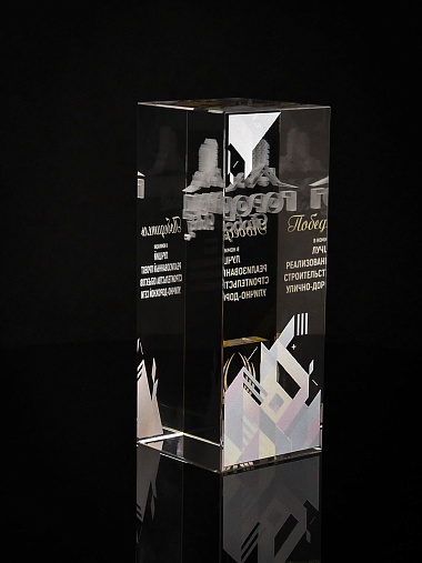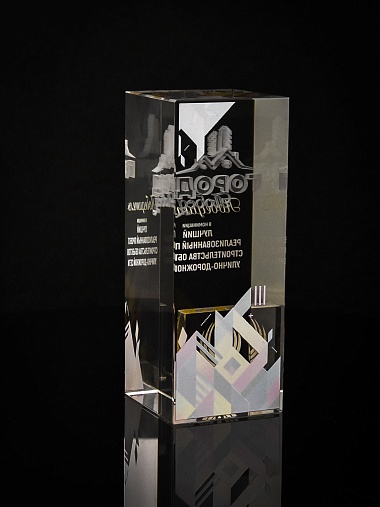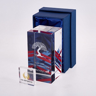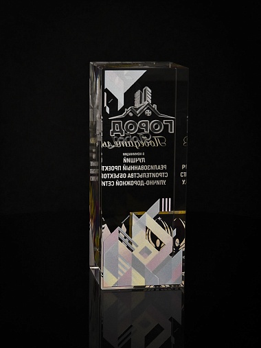 Награда из оптического стекла с 3D гравировкой и цветным нанесением. Поставляется в комплекте с подарочным футляром. Вес награды без футляра 1046гр. Стоимость указана за нанесение на лицевой и оборотной стороне награды. Возможность нанесения на боковые стороны и стоимость этих работ можно уточнить у менеджеров.