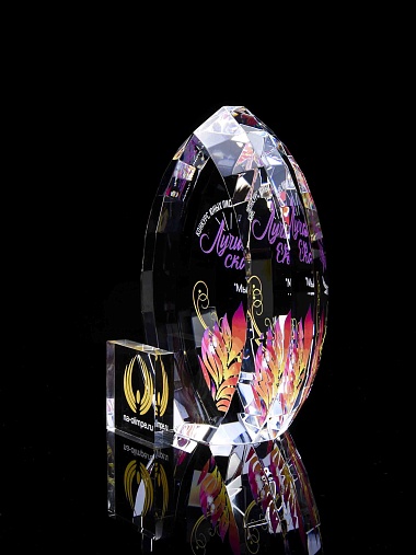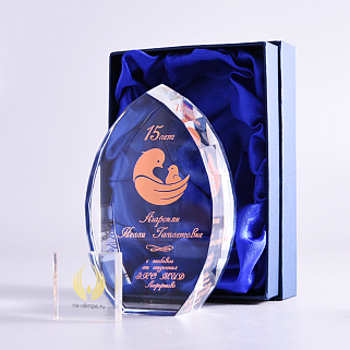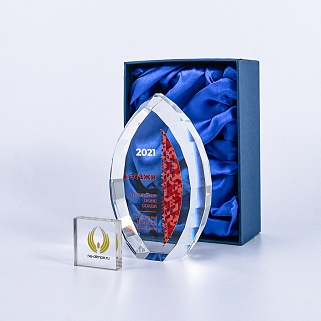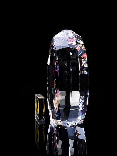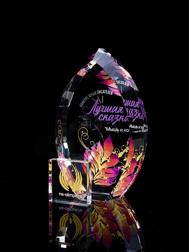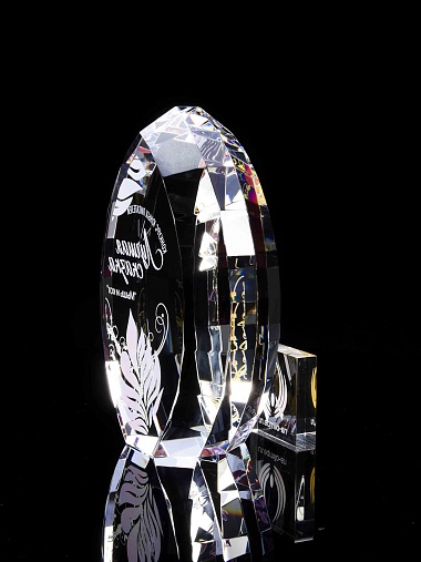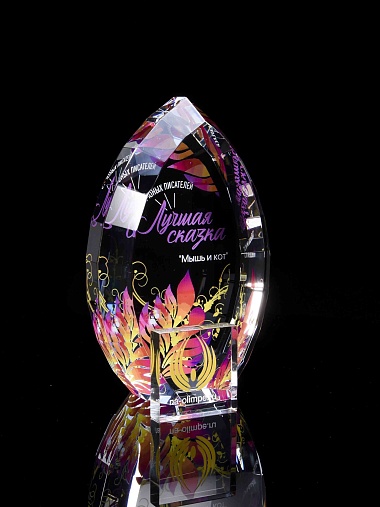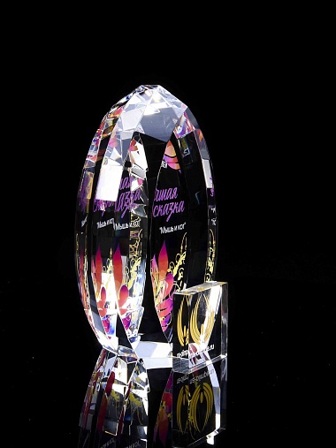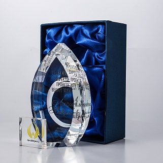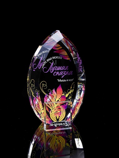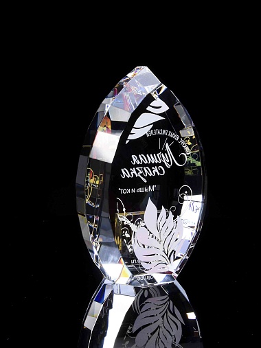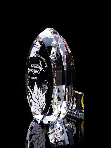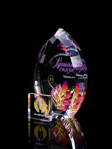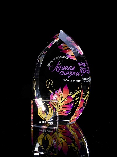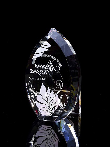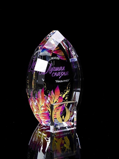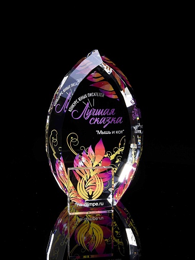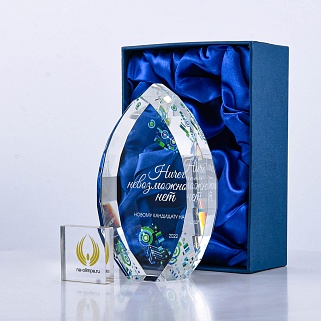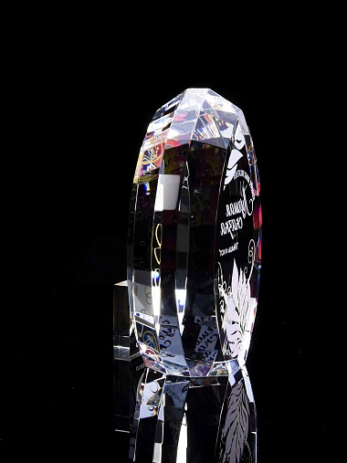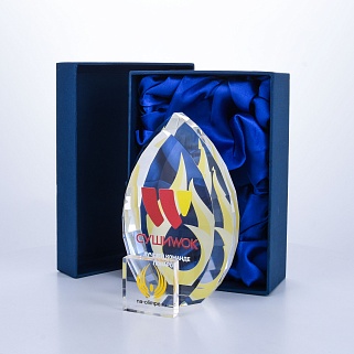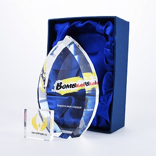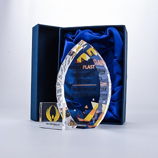 Стеклянная награда с полноцветной печатью. Толщина стекла 45 мм. Поставляется в комплекте с подарочным футляром. Вес награды без футляра 1020гр.Стоимость указана за нанесение на одной стороне, печать выполняется на задней стенке награды.