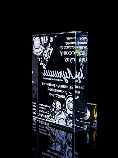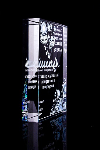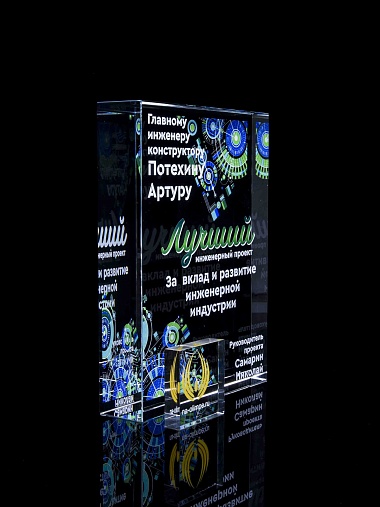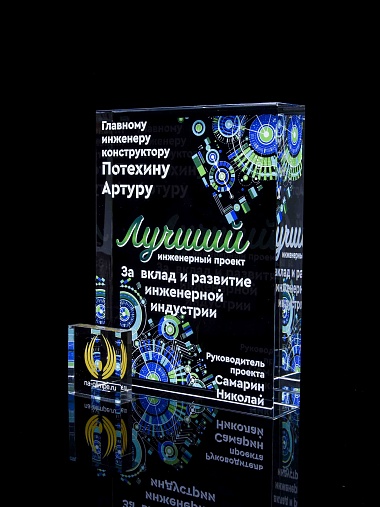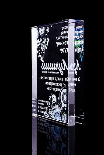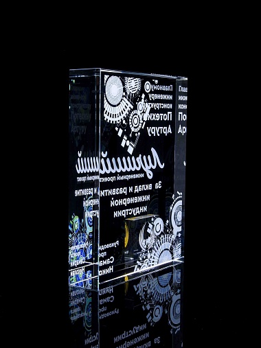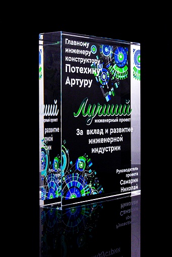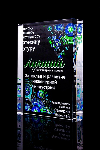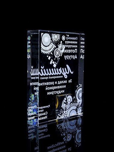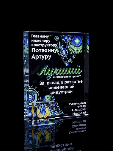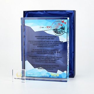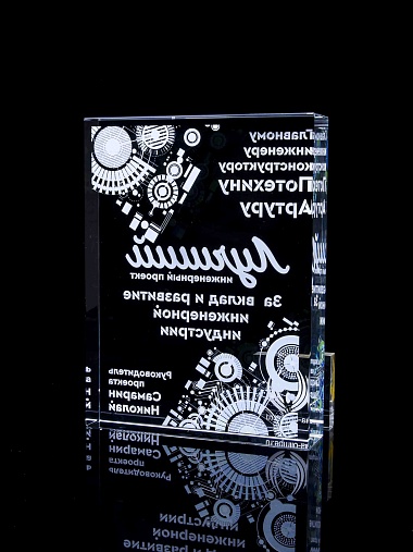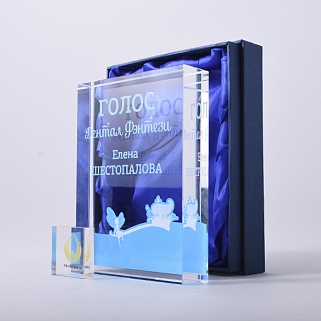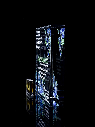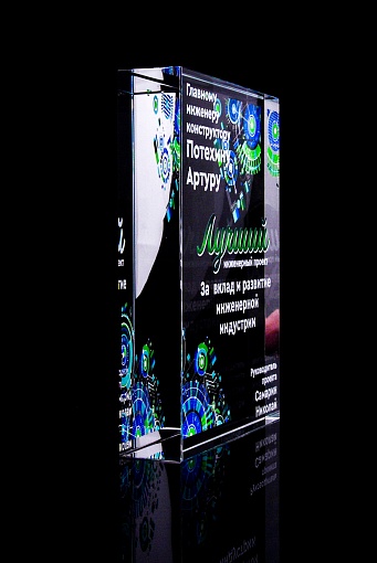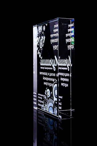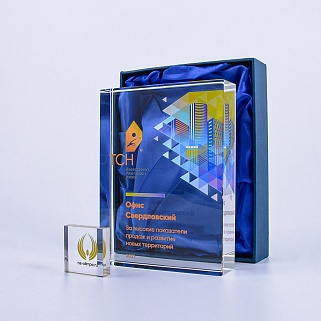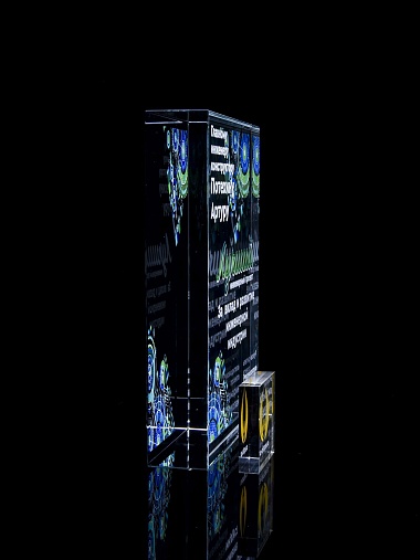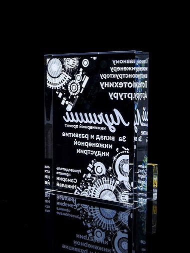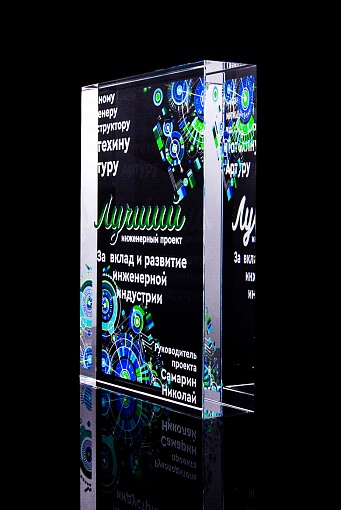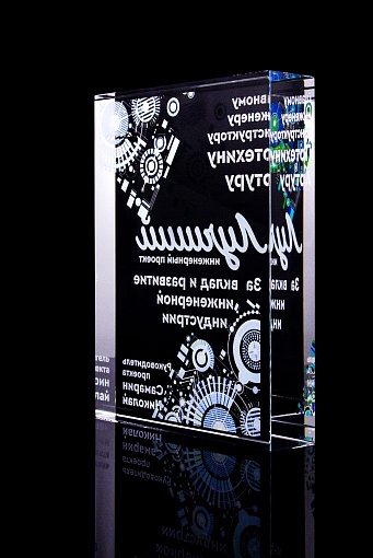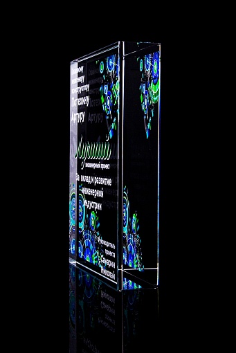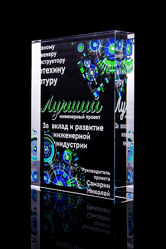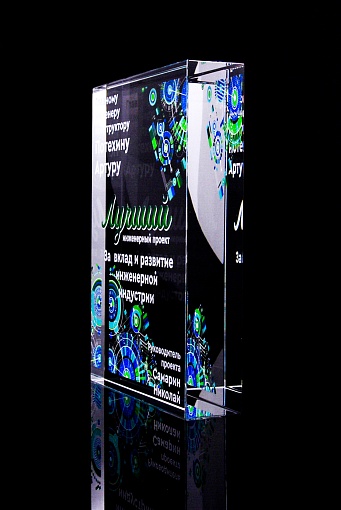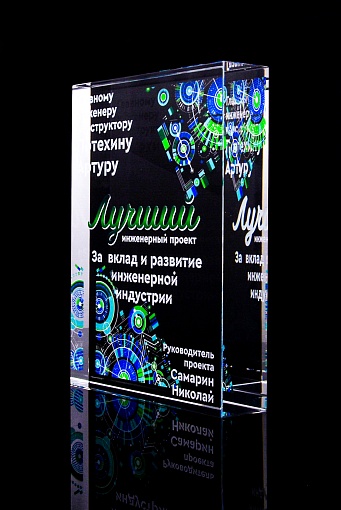 Стеклянная награда с полноцветным нанесением. Толщина стекла 40 мм. Поставляется в комплекте с подарочным футляром. Вес награды без футляра 3050гр.Стоимость указана за нанесение на одной стороне, печать выполняется на задней стенке награды.