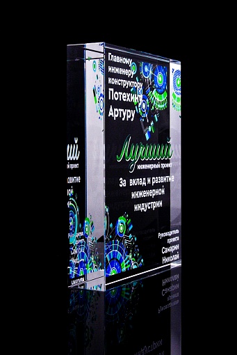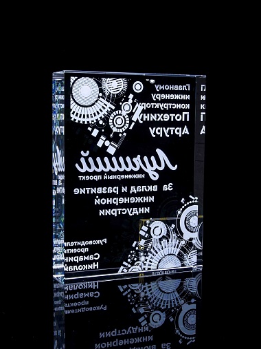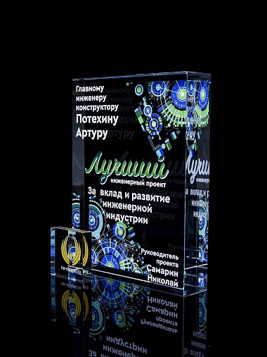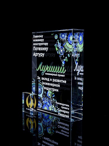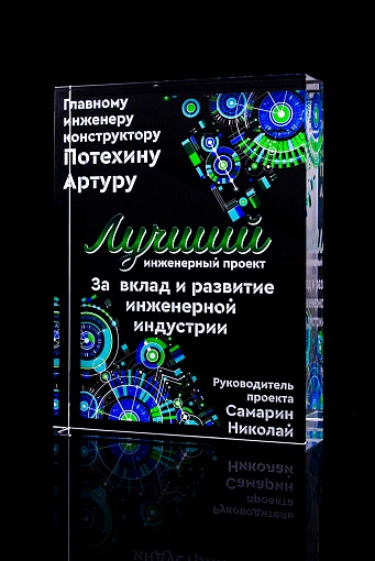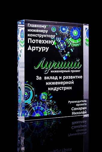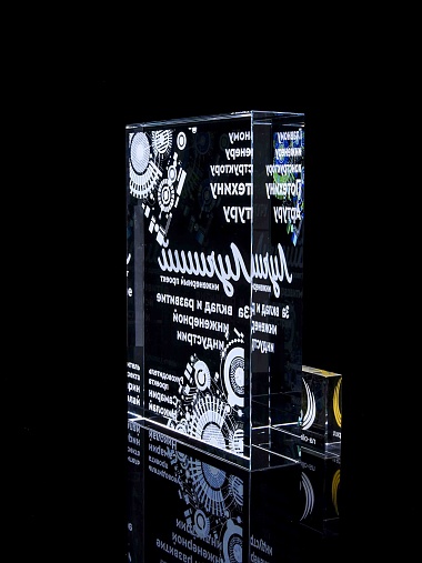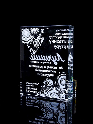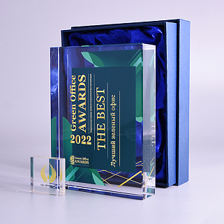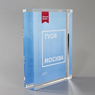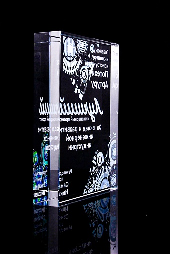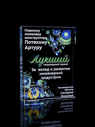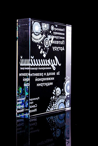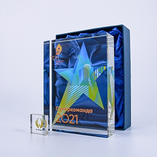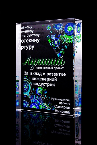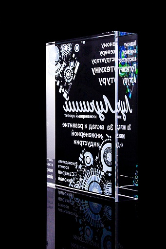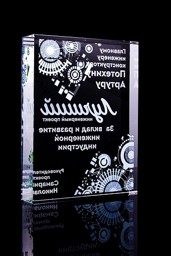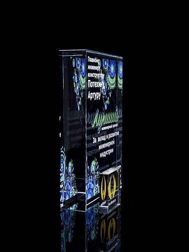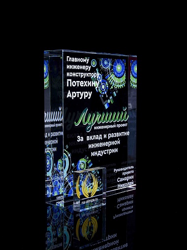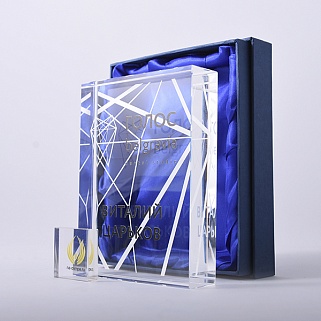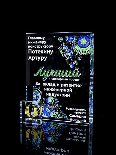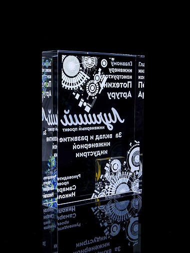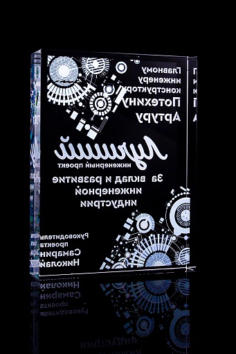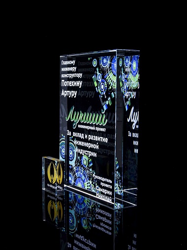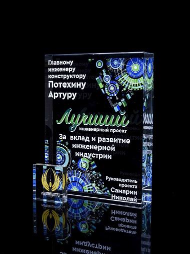 Стеклянная награда с полноцветным нанесением. Толщина стекла 40 мм. Поставляется в комплекте с подарочным футляром. Вес награды без футляра 3050гр.Стоимость указана за нанесение на одной стороне, печать выполняется на задней стенке награды.