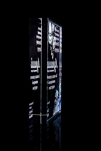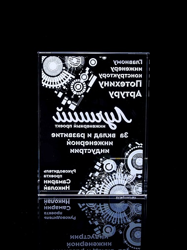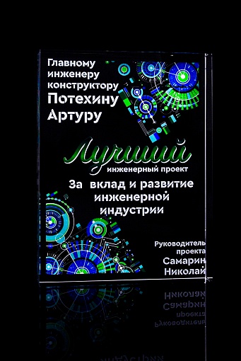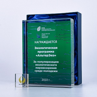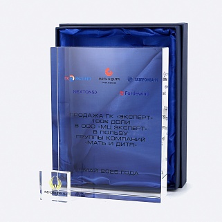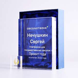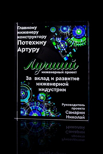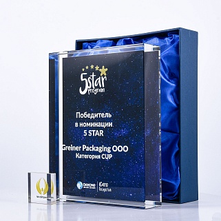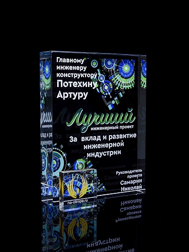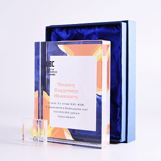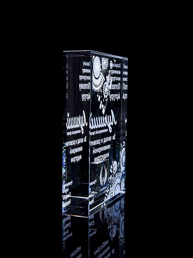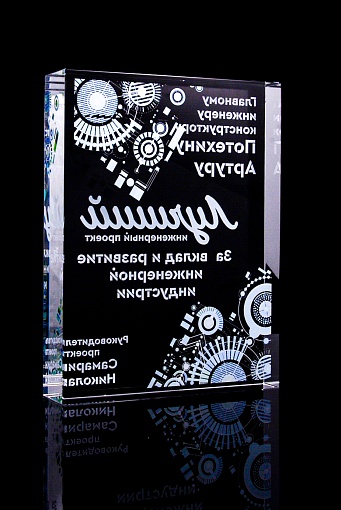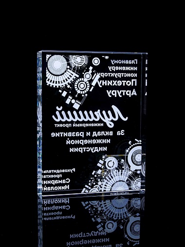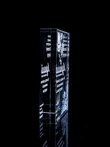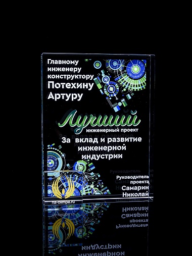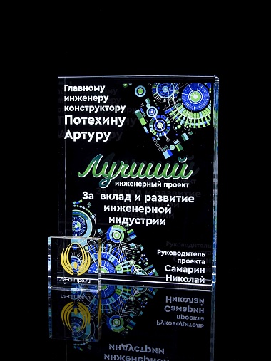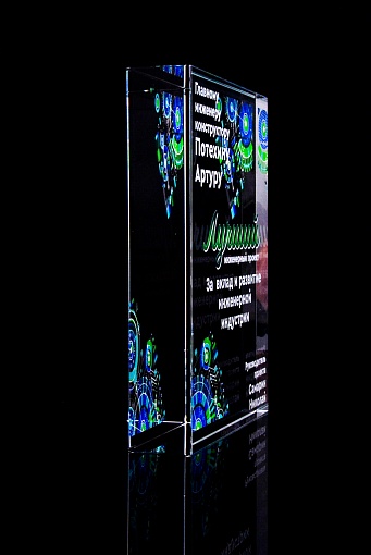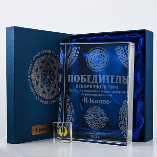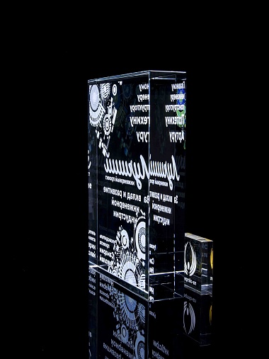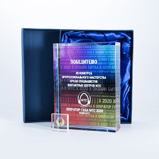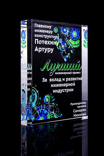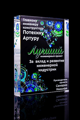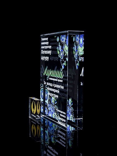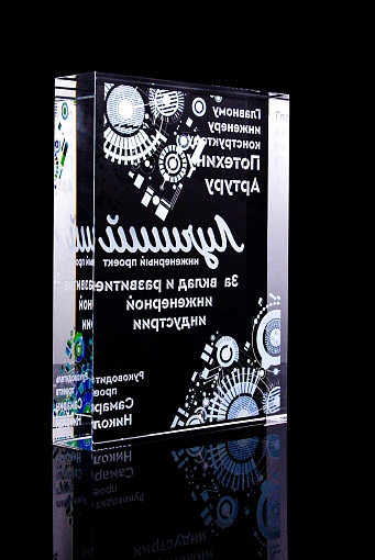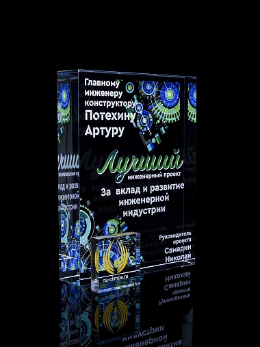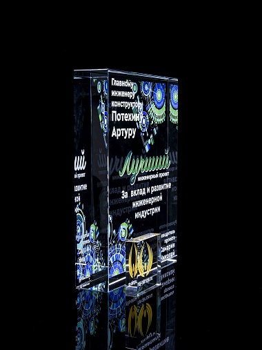 Стеклянная награда с полноцветным нанесением. Толщина стекла 40 мм. Поставляется в комплекте с подарочным футляром. Вес награды без футляра 3050гр.Стоимость указана за нанесение на одной стороне, печать выполняется на задней стенке награды.