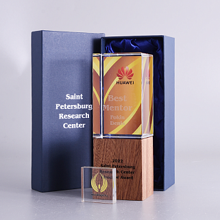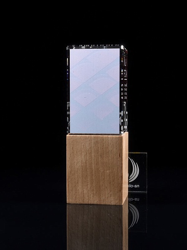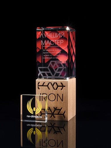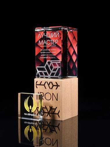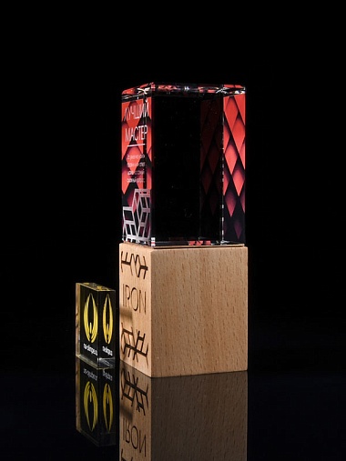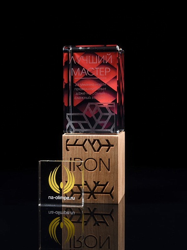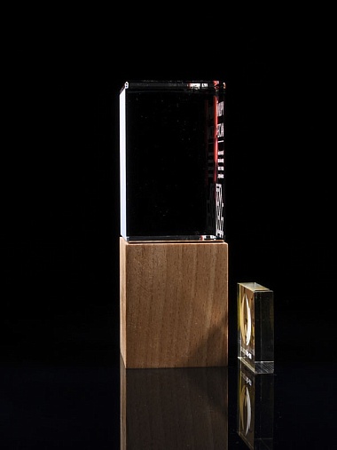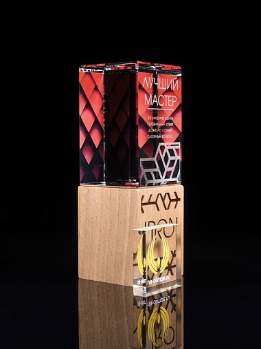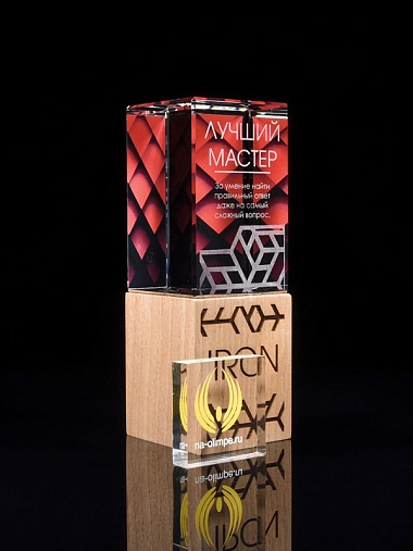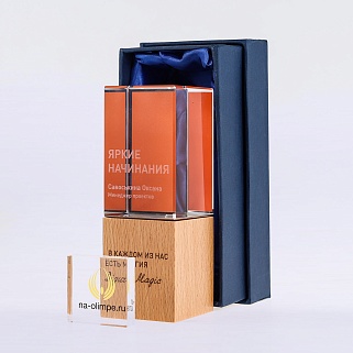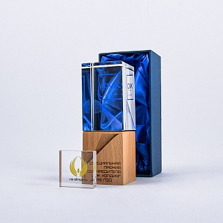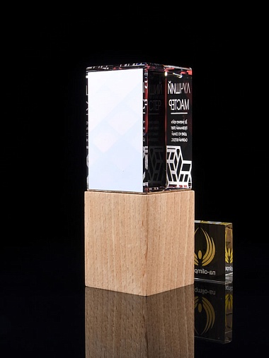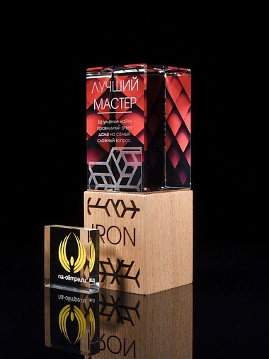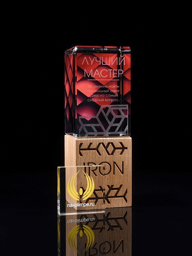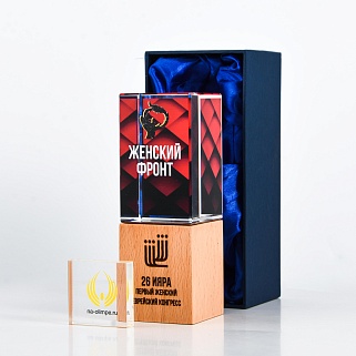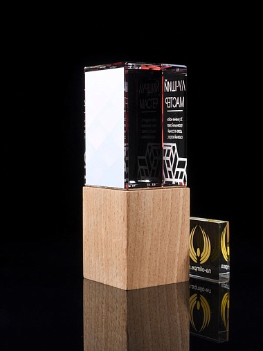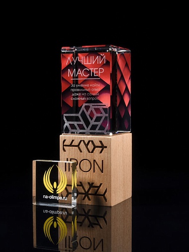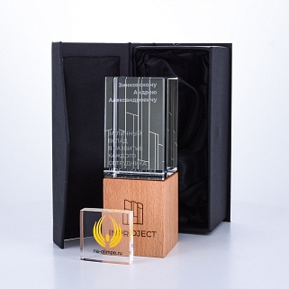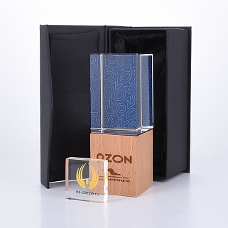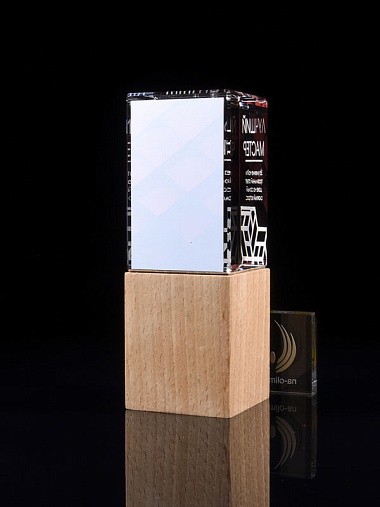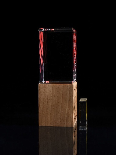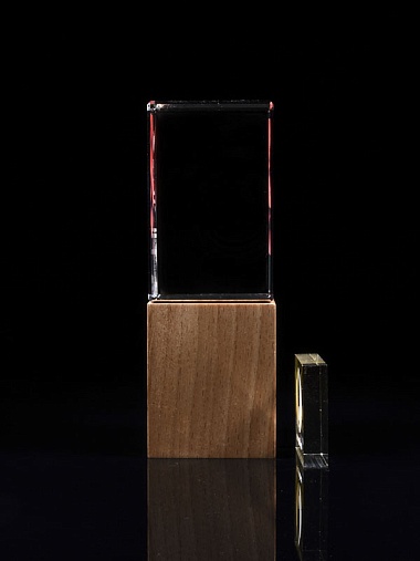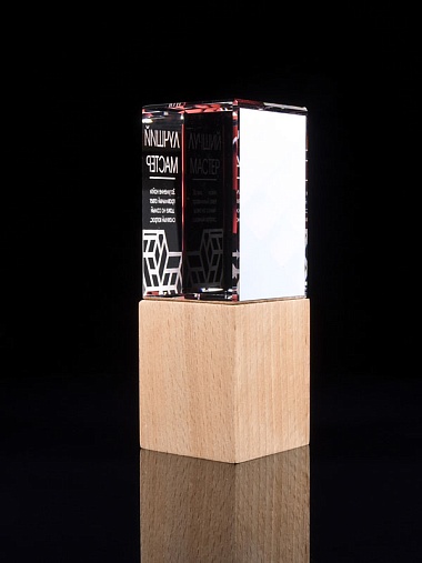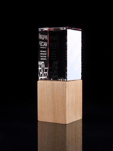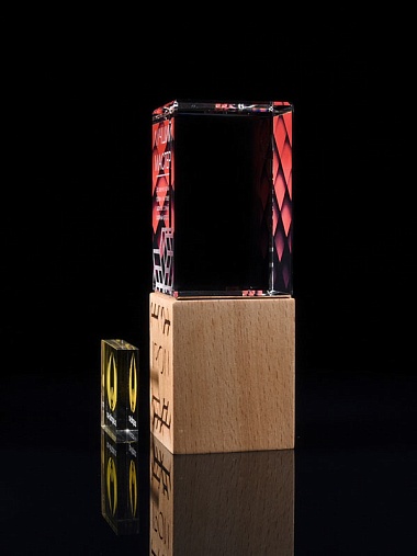 Стеклянная награда с лазерной гравировкой на деревянном постаменте. Поставляется в комплекте с подарочным футляром. Вес награды без футляра 600гр. Стоимость указана за нанесение на лицевой и оборотной стороне награды. Возможность нанесения на боковые стороны и стоимость этих работ можно уточнить у менеджеров.