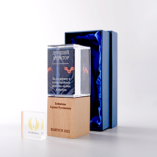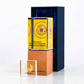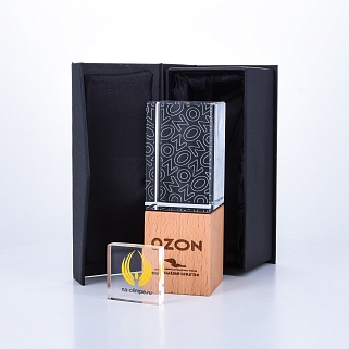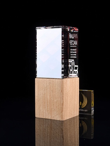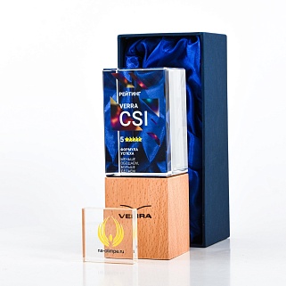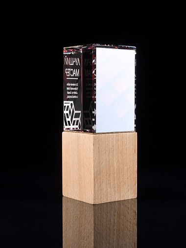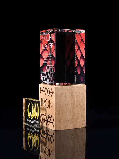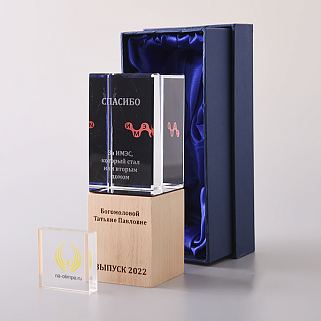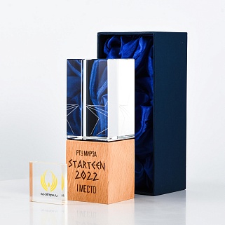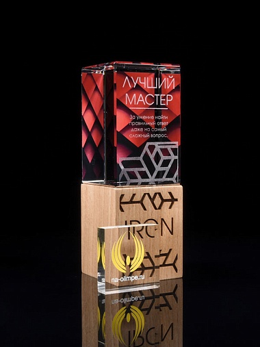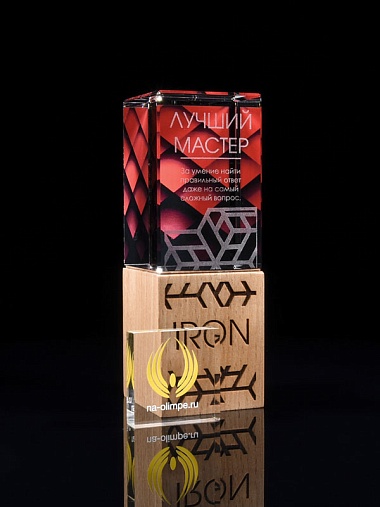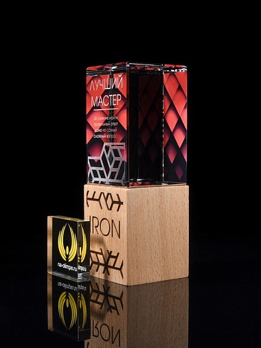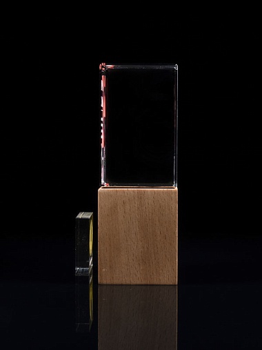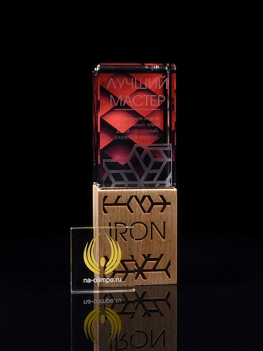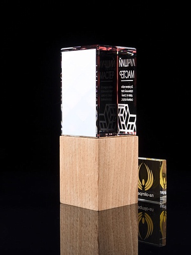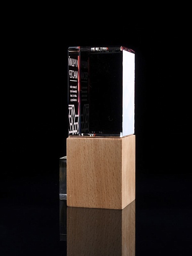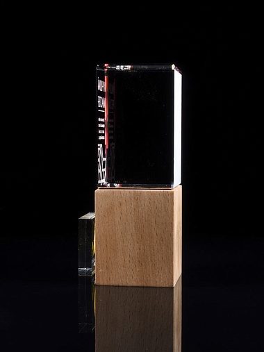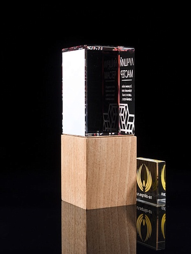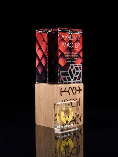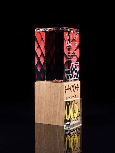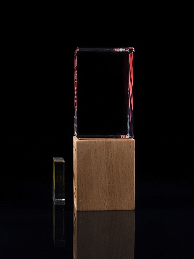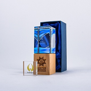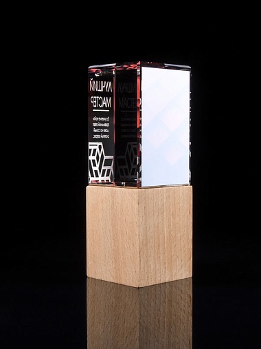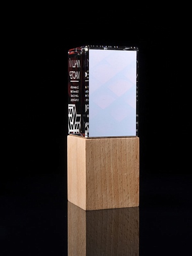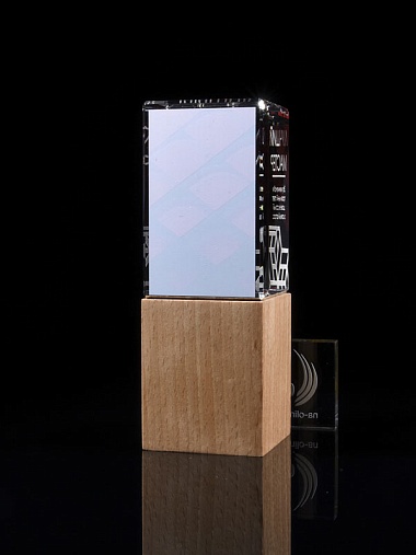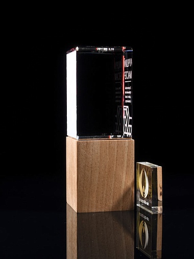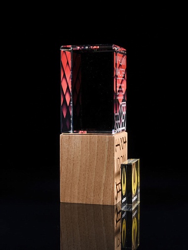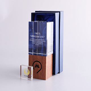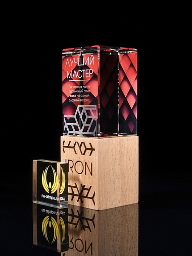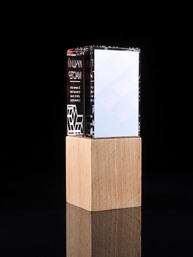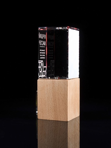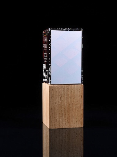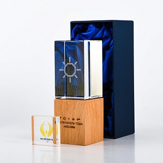 Стеклянная награда с цветным нанесением на деревянном постаменте. Поставляется в комплекте с подарочным футляром. Вес награды без футляра 600гр. Стоимость указана за нанесение на лицевой и оборотной стороне награды. Возможность нанесения на боковые стороны и стоимость этих работ можно уточнить у менеджеров.