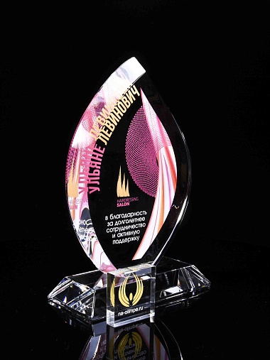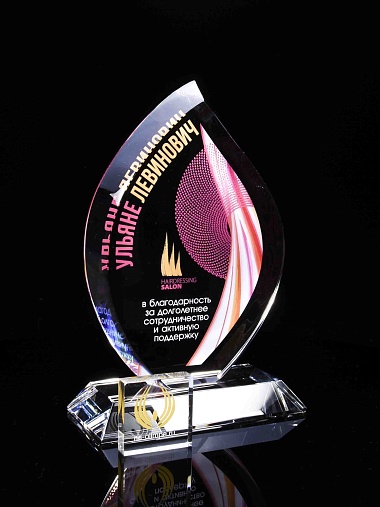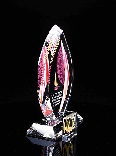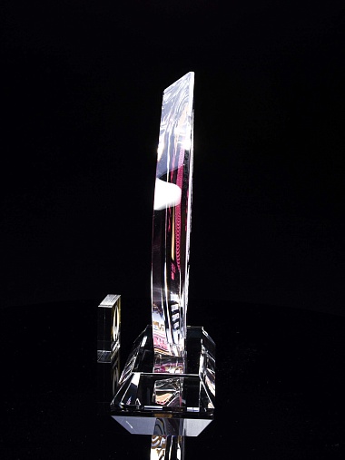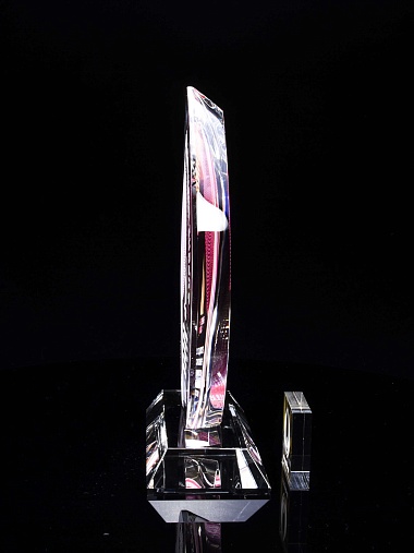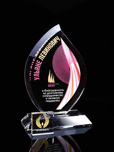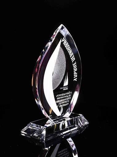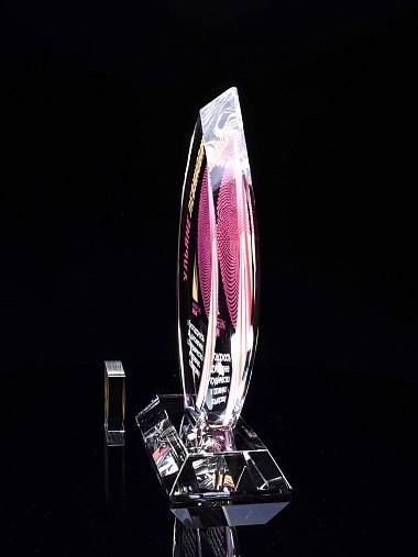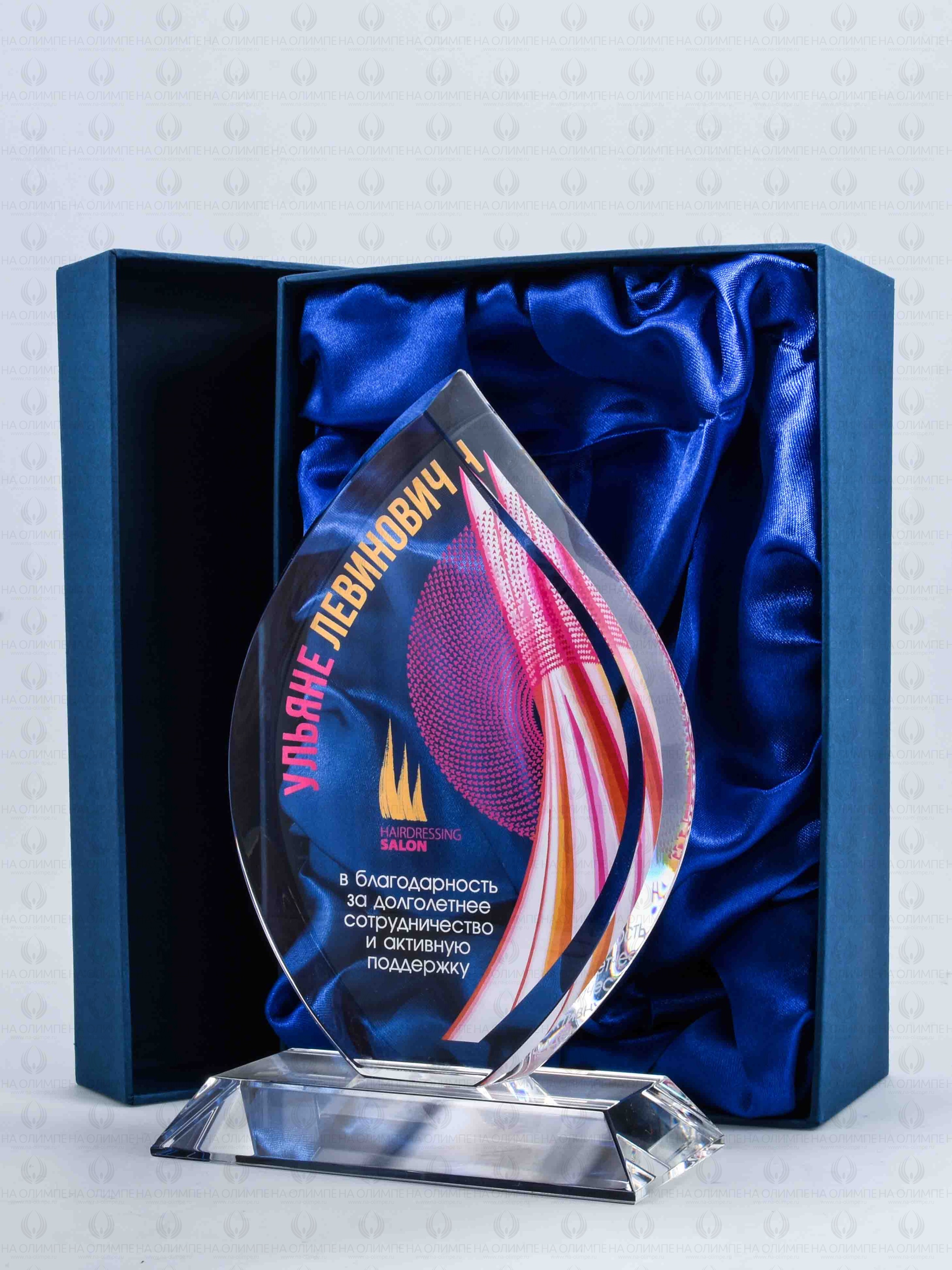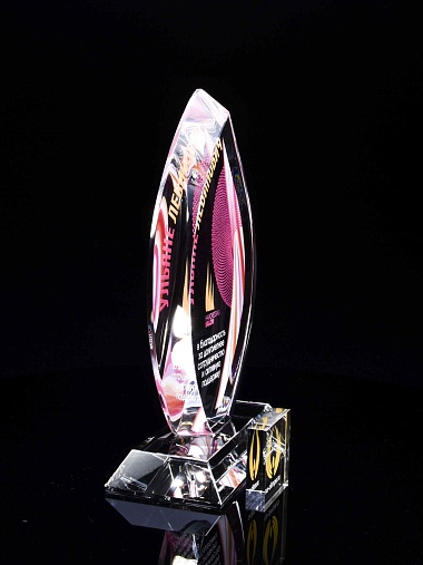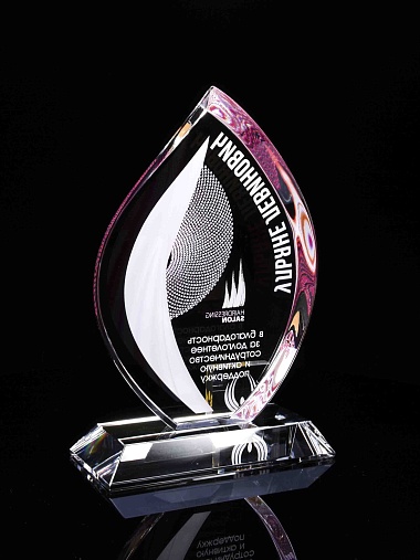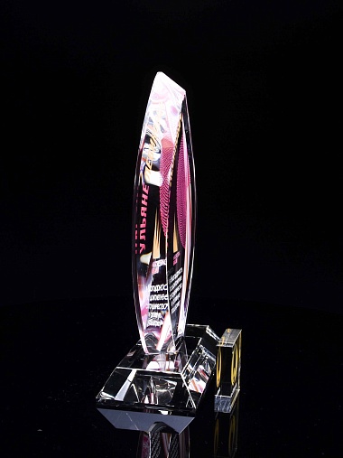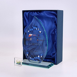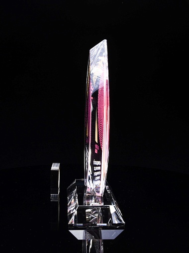 Стеклянная награда с полноцветным нанесением. Толщина стекла 19 мм. Поставляется в комплекте с подарочным футляром. Вес награды без футляра 1020гр.Стоимость указана за нанесение на одной стороне, печать выполняется на задней стенке награды.