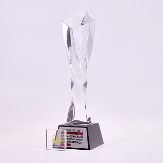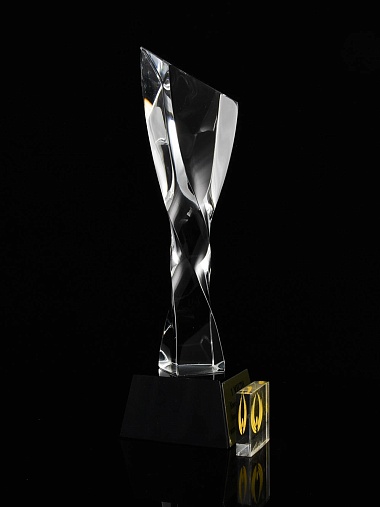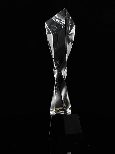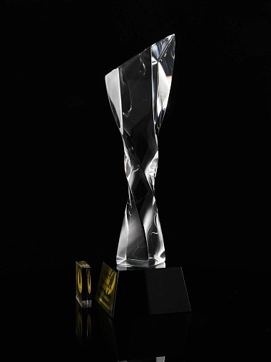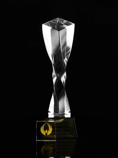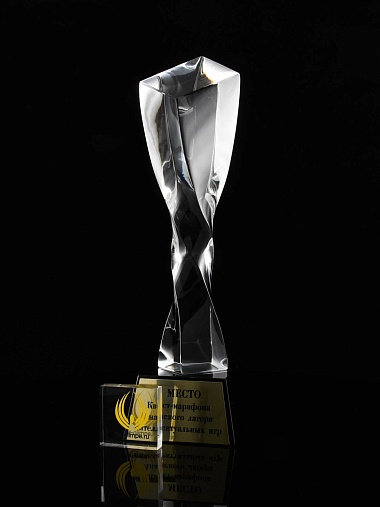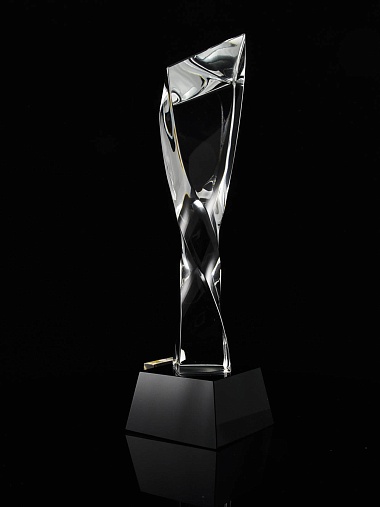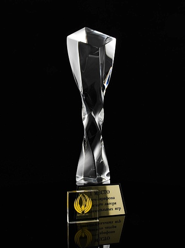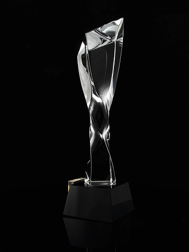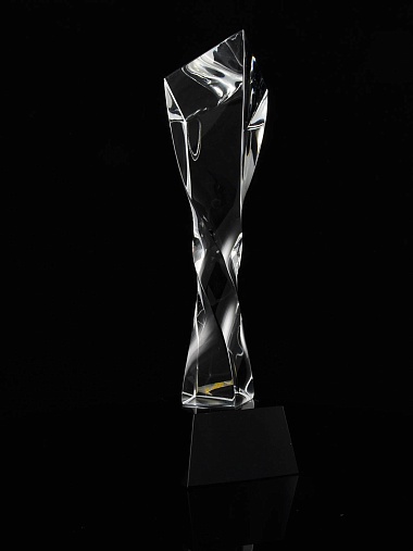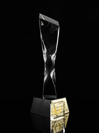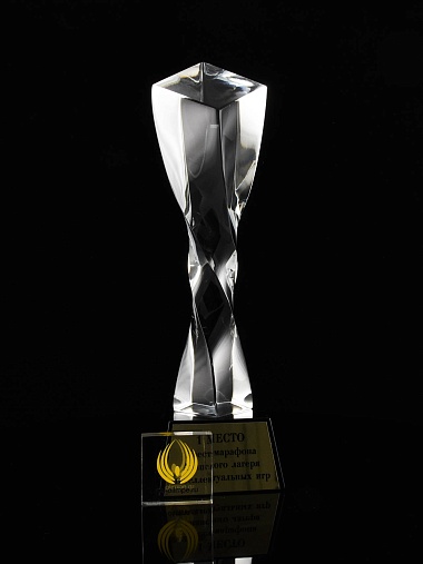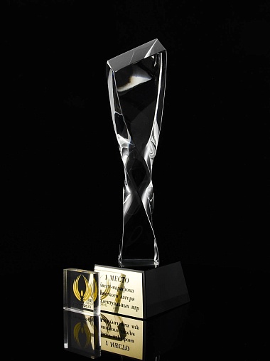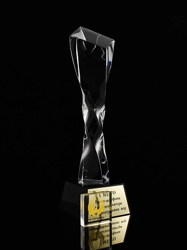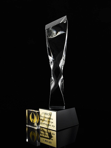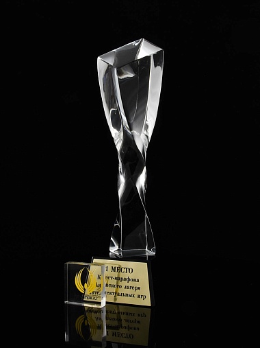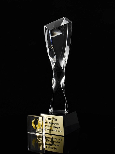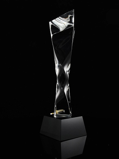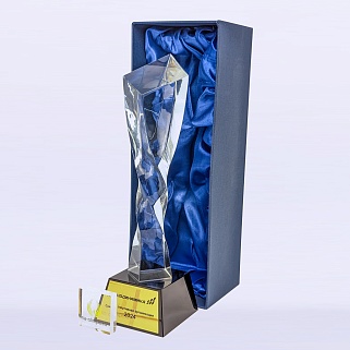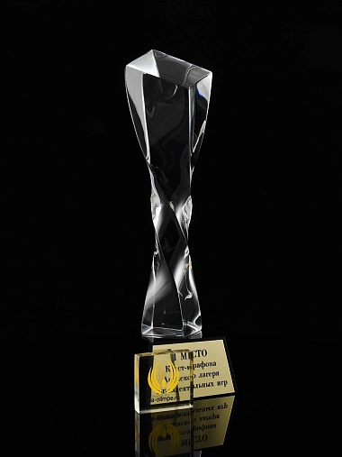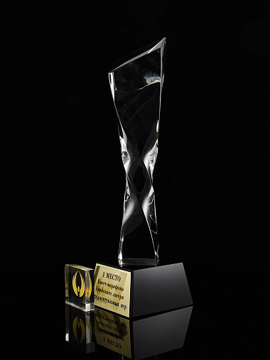 Стеклянная награда на постаменте из черного стекла. Может доукомплектовываться металлической или заливной табличкой с текстом и рисунком. Поставляется в комплекте с подарочным футляром. Табличка в комплект не входит.