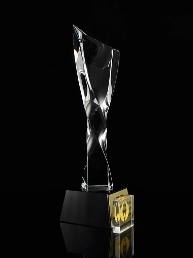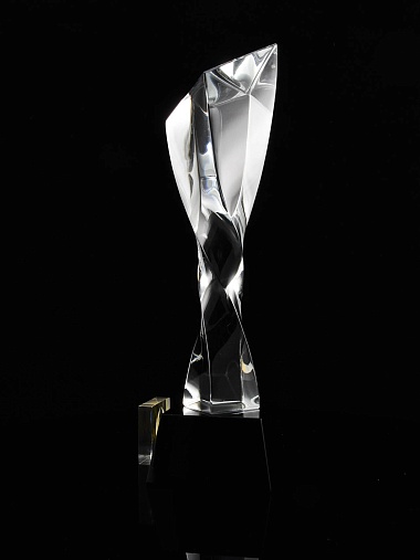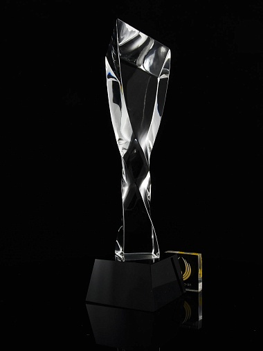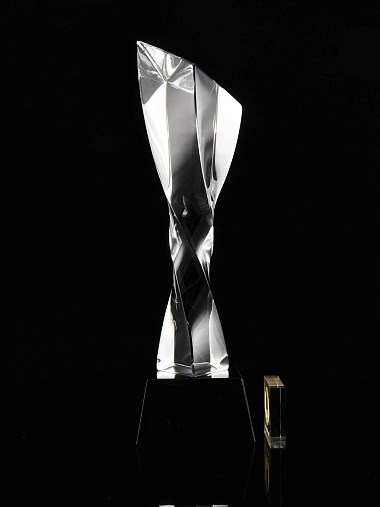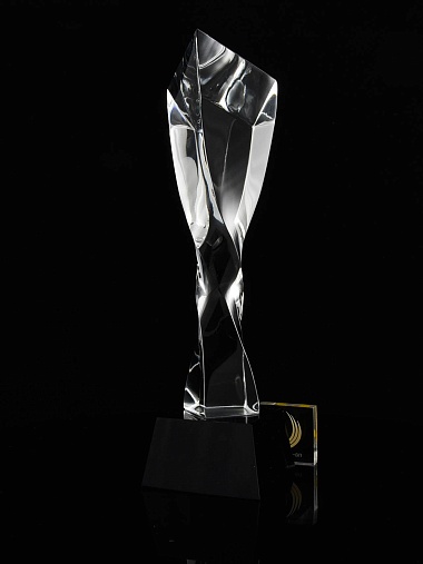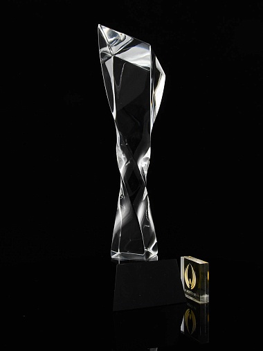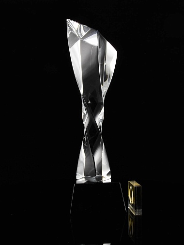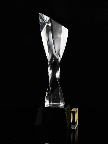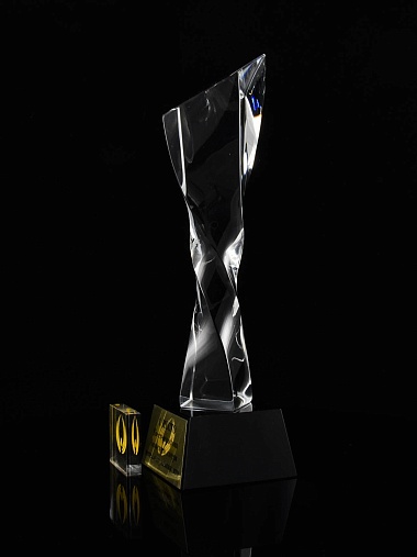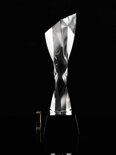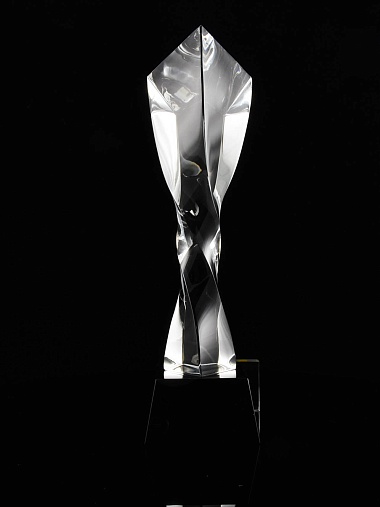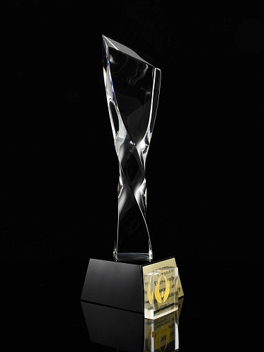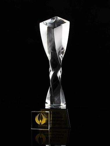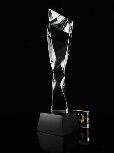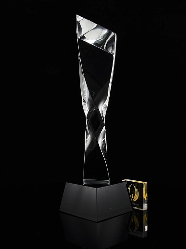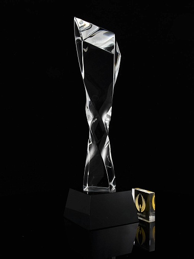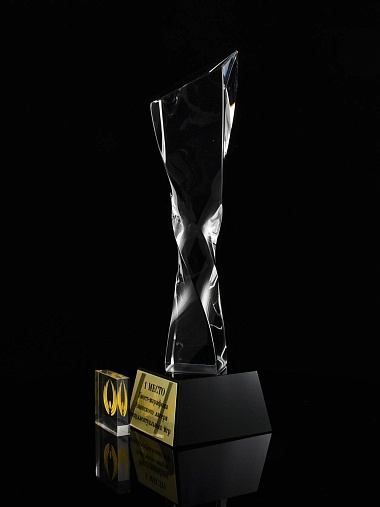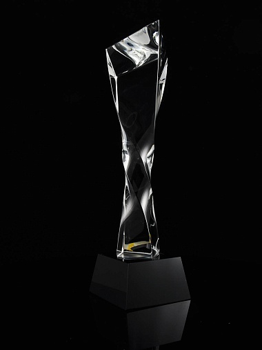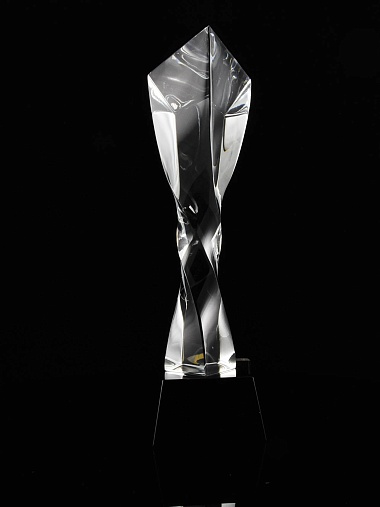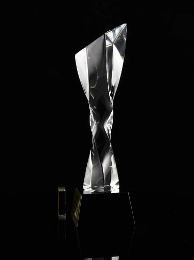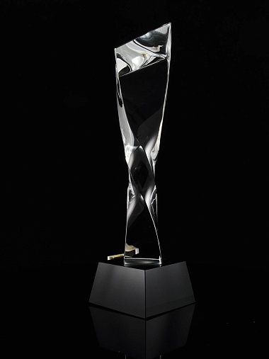 Стеклянная награда на постаменте из черного стекла. Может доукомплектовываться металлической или заливной табличкой с текстом и рисунком. Поставляется в комплекте с подарочным футляром. Табличка в комплект не входит.