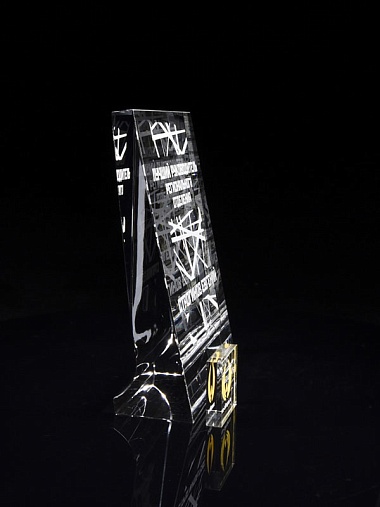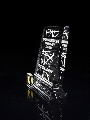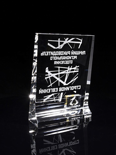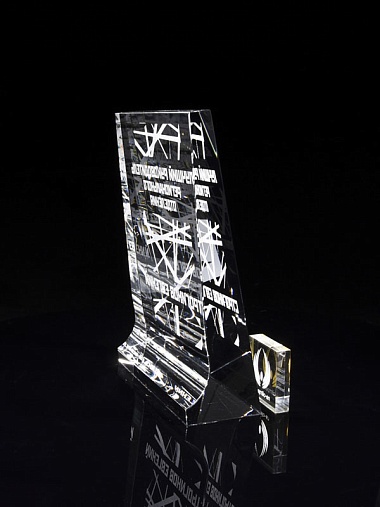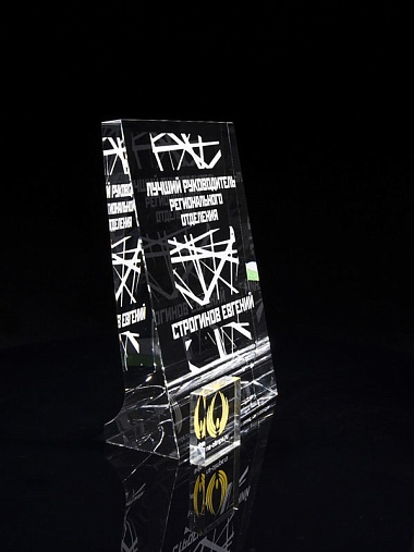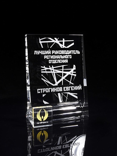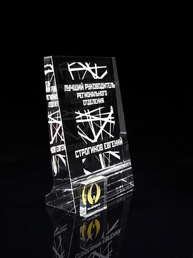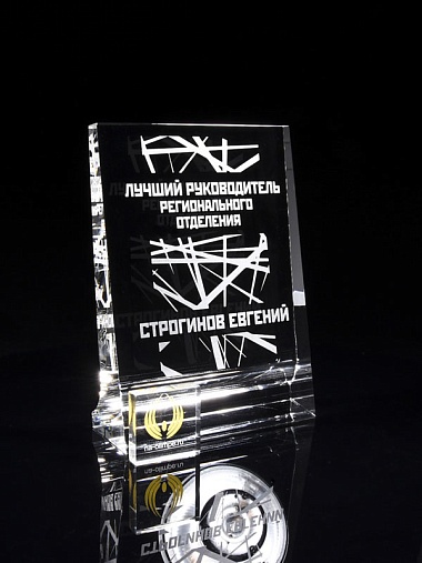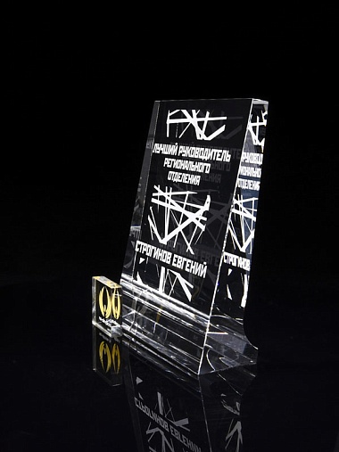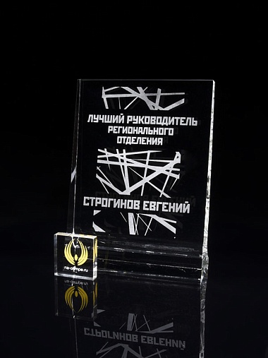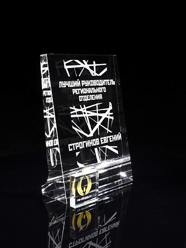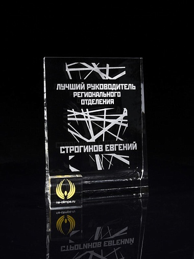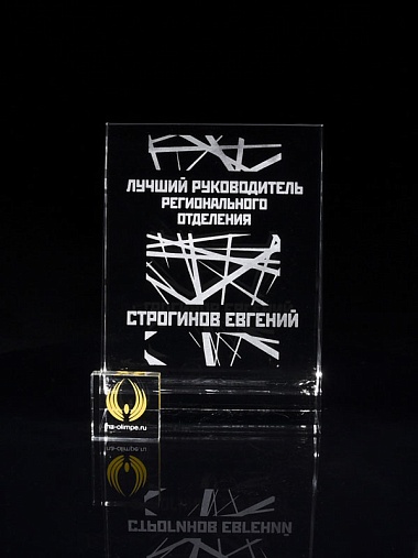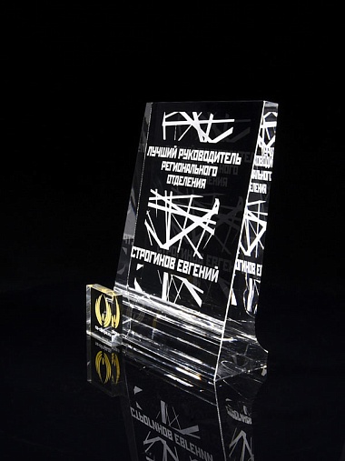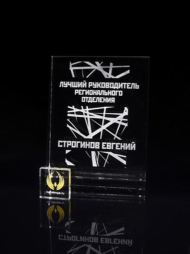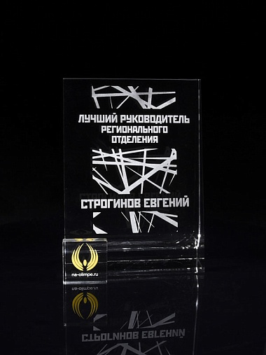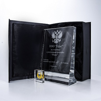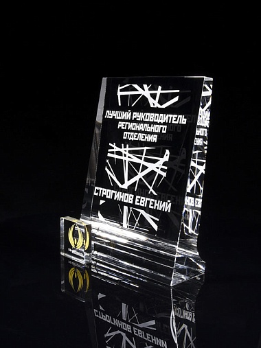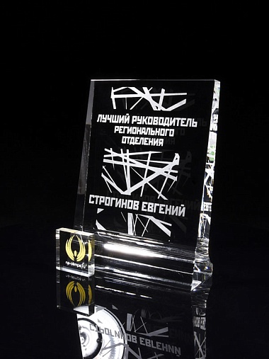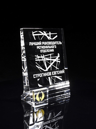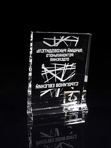 Стеклянная награда с гравировкой. Поставляется в комплекте с подарочным футляром. Стоимость указана за нанесение на одной стороне, гравировка выполняется на задней стенке награды.