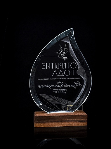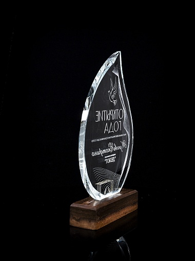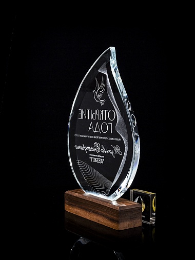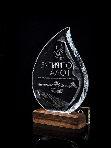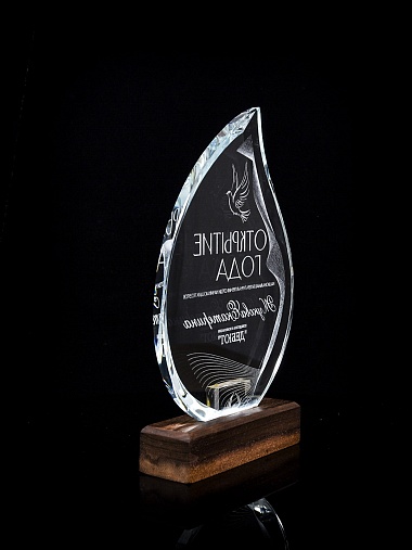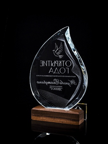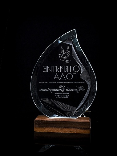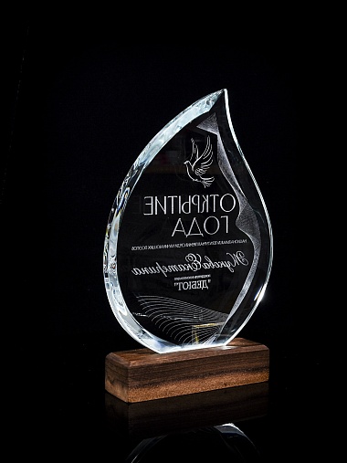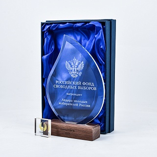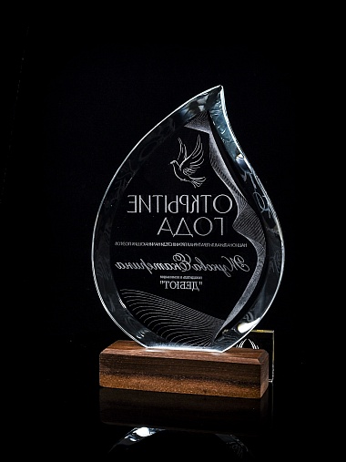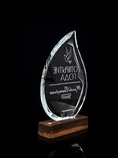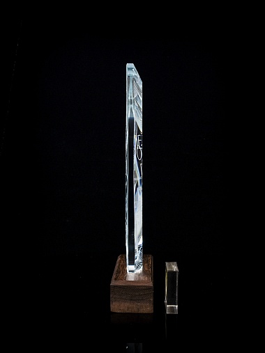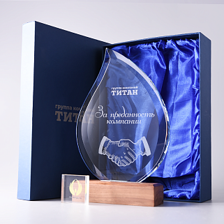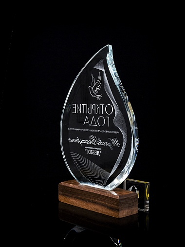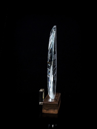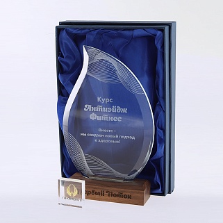Стеклянная награда с гравировкой. Толщина стекла 15 мм. Может доукомплектовываться металлической или заливной табличкой с текстом и рисунком. Табличка в комплект не входит и заказывается отдельно. Награда поставляется в комплекте с подарочным футляром. Вес награды без футляра 800гр. Стоимость указана за нанесение на одной стороне, гравировка выполняется на задней стенке награды.