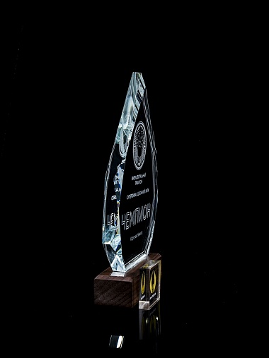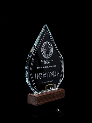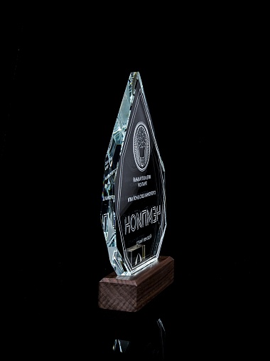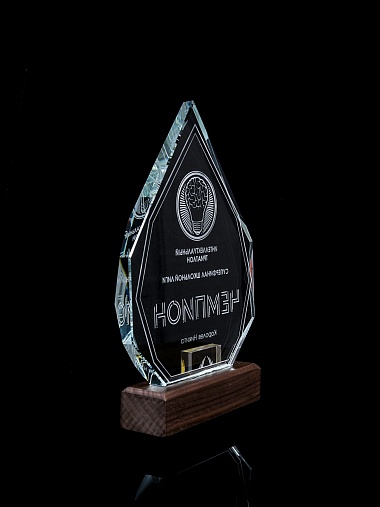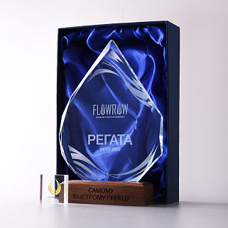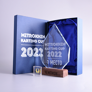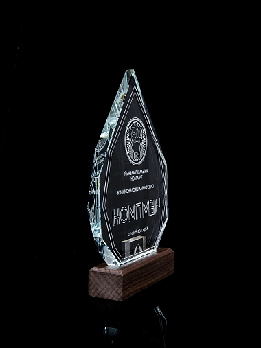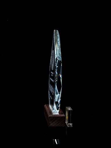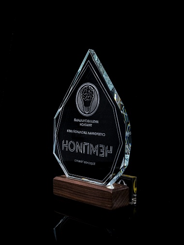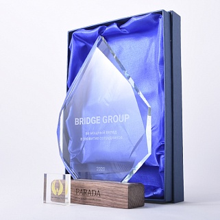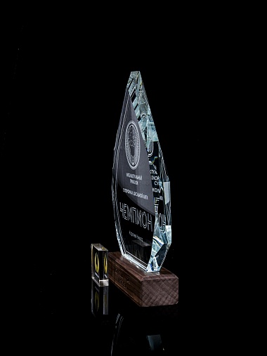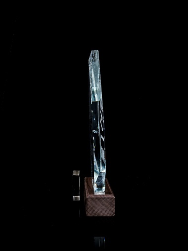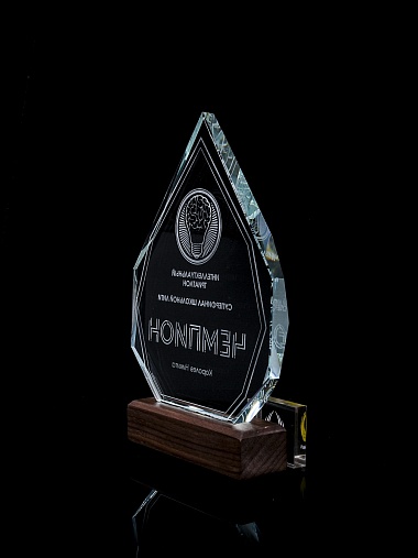 Стеклянная награда с гравировкой. Толщина стекла 15 мм. Поставляется в комплекте с подарочным футляром. Вес награды без футляра 860гр. Стоимость указана за нанесение на одной стороне, гравировка выполняется на задней стенке награды.