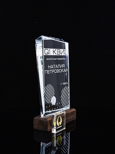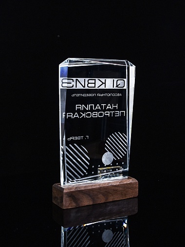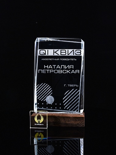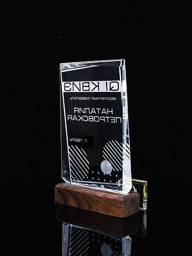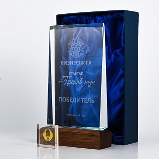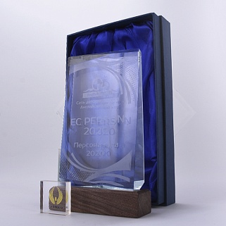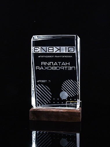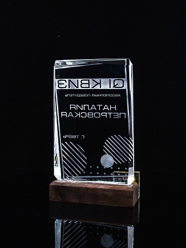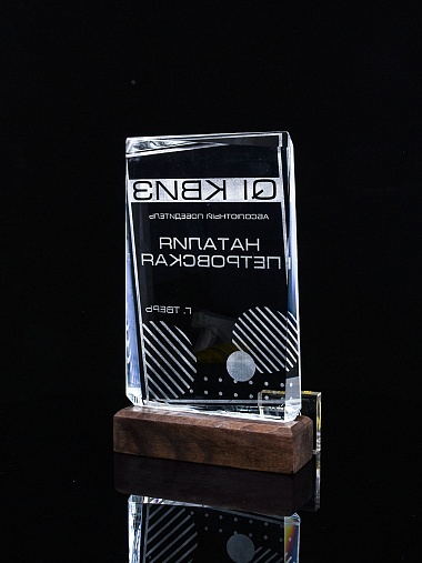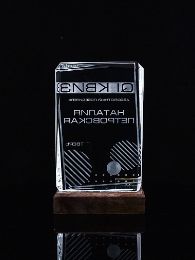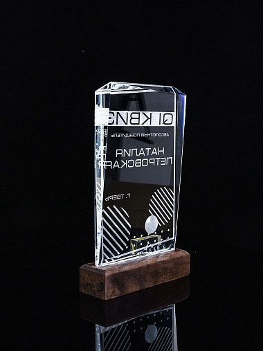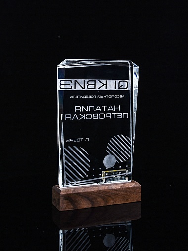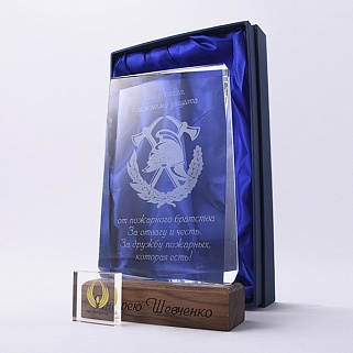 Стеклянная награда с гравировкой. Толщина стекла 15 мм. Может доукомплектовываться металлической или заливной табличкой с текстом и рисунком. Табличка в комплект не входит и заказывается отдельно. Поставляется в комплекте с подарочным футляром. Вес награды без футляра 830гр. Стоимость указана за нанесение на одной стороне, гравировка выполняется на задней стенке награды.