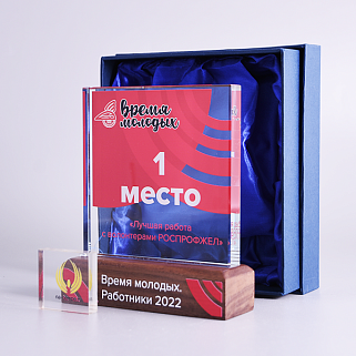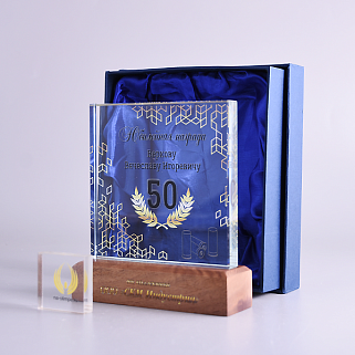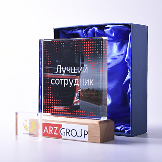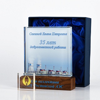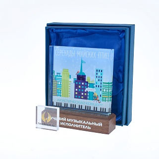 Стеклянная награда с полноцветным нанесением. Толщина стекла 15 мм. Может доукомплектовываться металлической или заливной табличкой с текстом и рисунком. Табличка в комплект не входит и заказывается отдельно. Поставляется в комплекте с подарочным футляром. Вес награды без футляра 585гр. Стоимость указана за нанесение на одной стороне, печать выполняется на задней стенке награды.