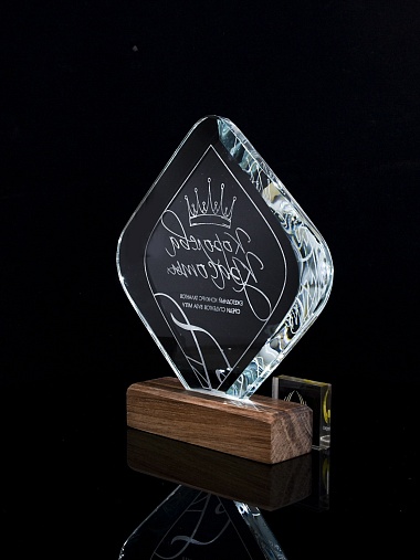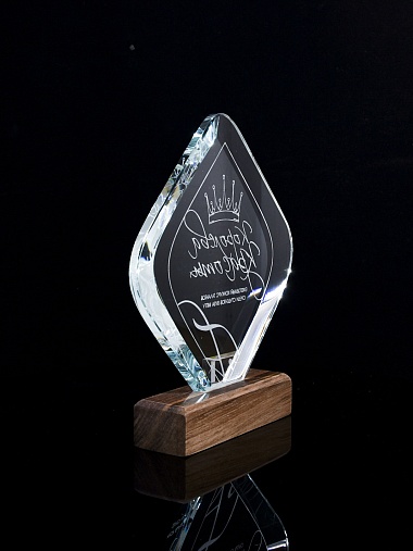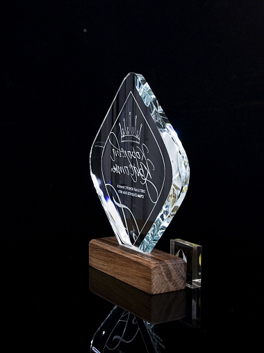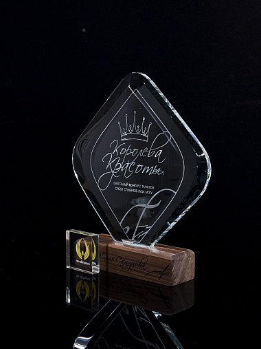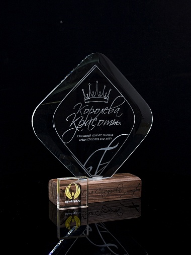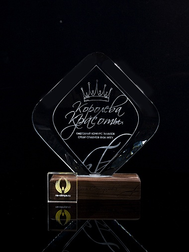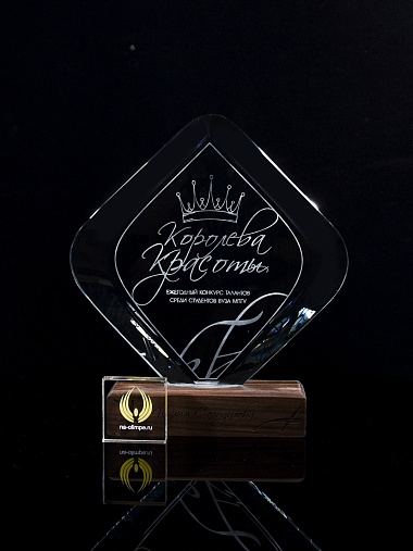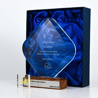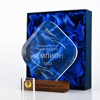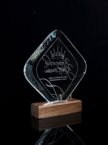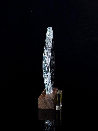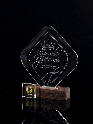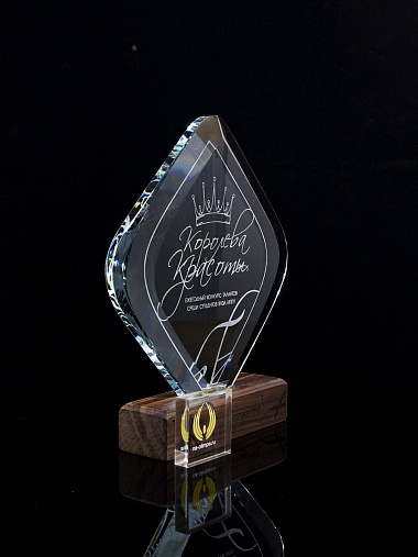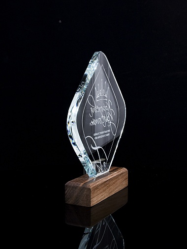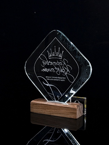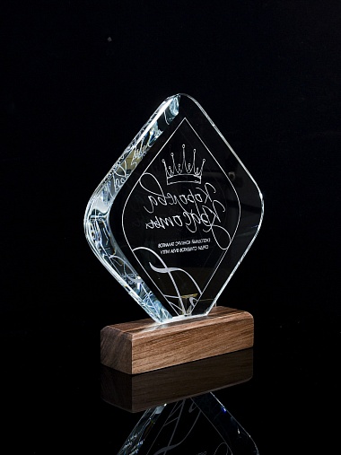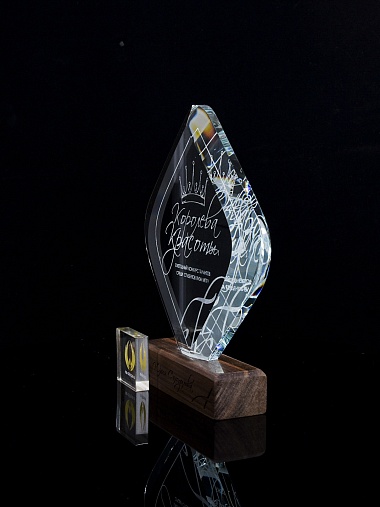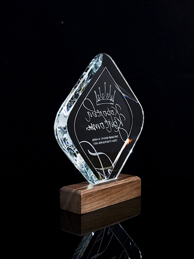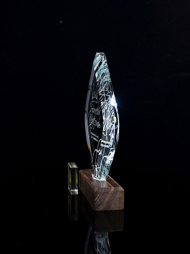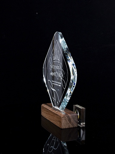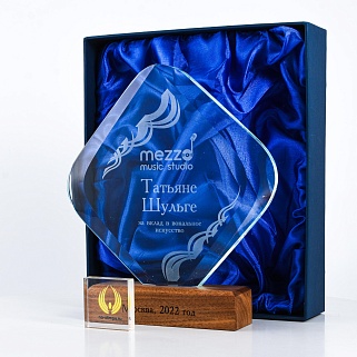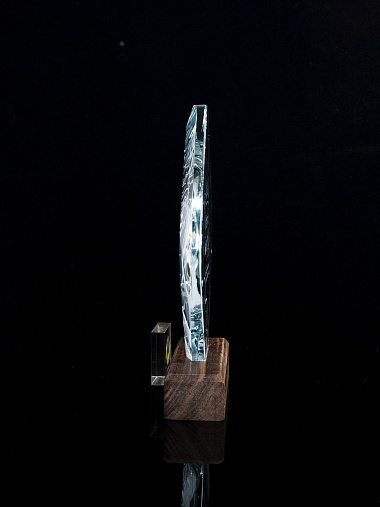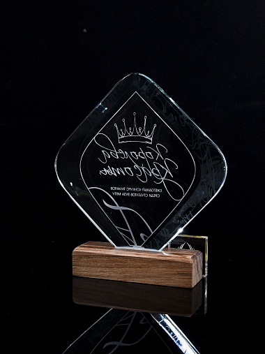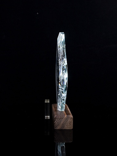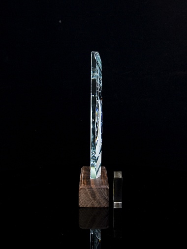 Стеклянная награда с гравировкой. Толщина стекла 15 мм. Награду можно доукомплектовывать металлической или заливной табличкой с текстом и рисунком. Табличка в комплект не входит и заказывается отдельно.Поставляется в комплекте с подарочным футляром. Вес награды без футляра 740гр. Стоимость указана за нанесение на одной стороне, гравировка выполняется на задней стенке награды.