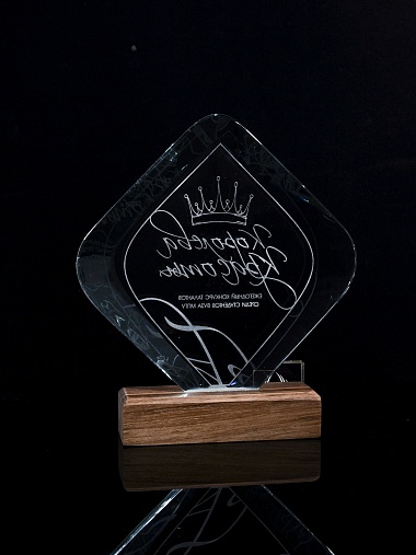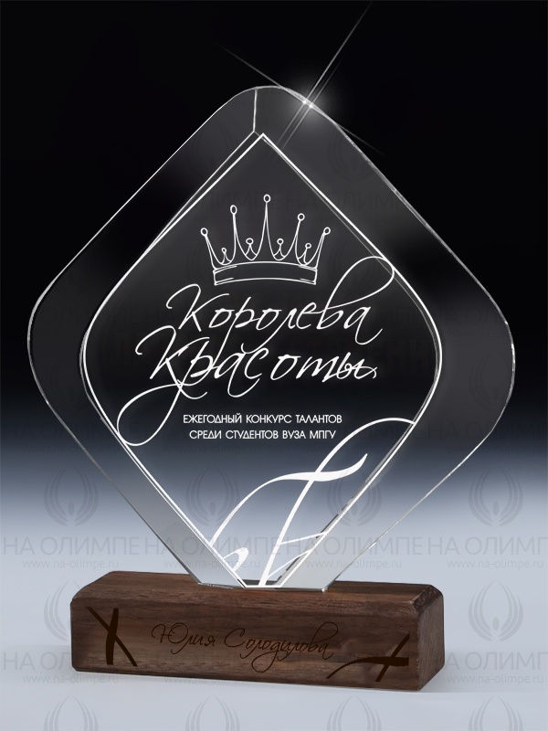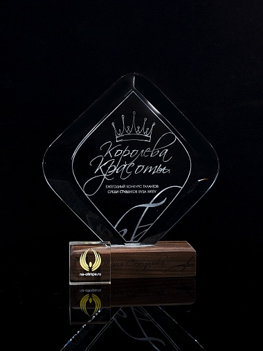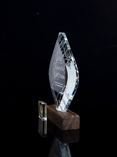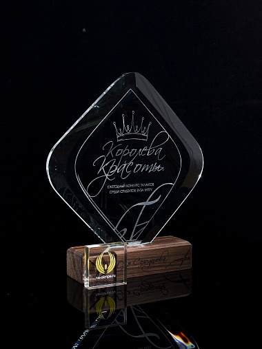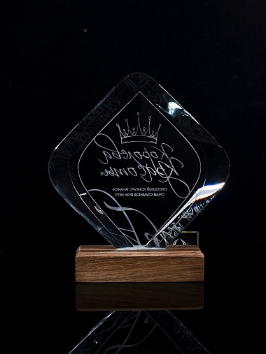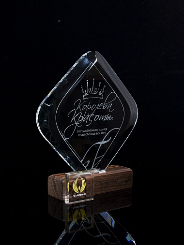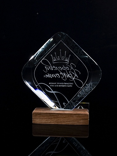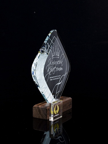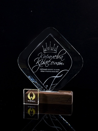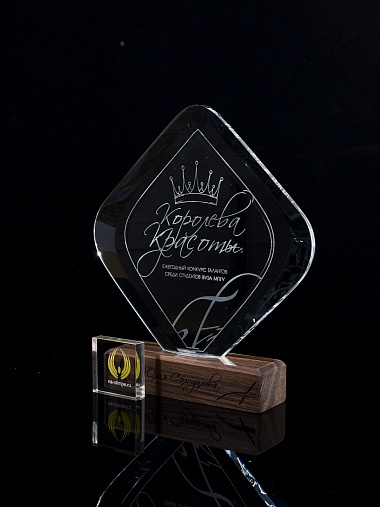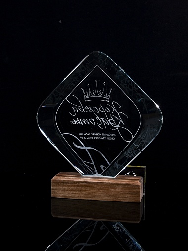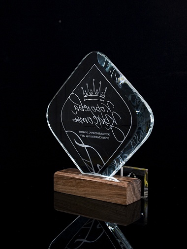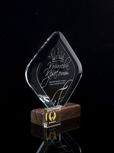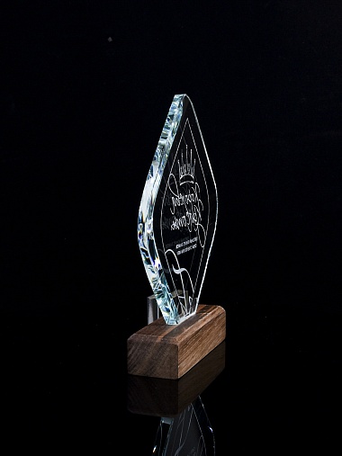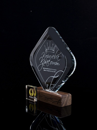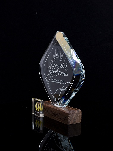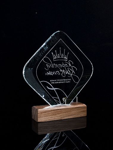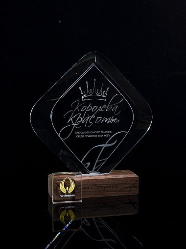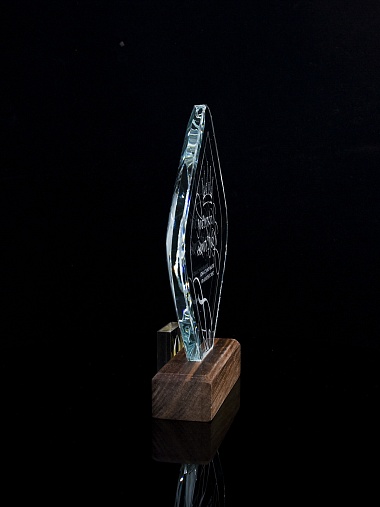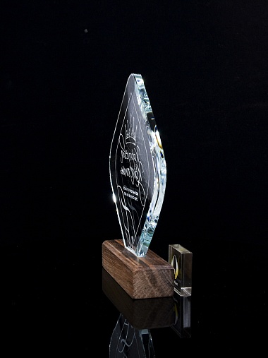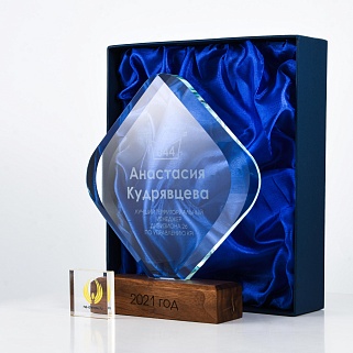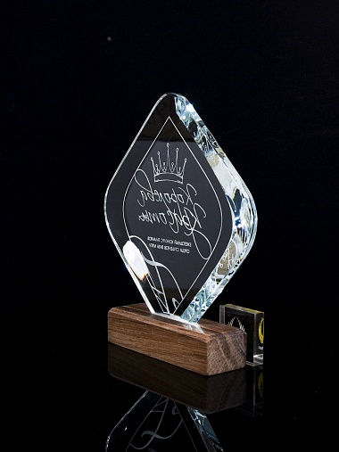 Стеклянная награда с гравировкой. Толщина стекла 15 мм. Награду можно доукомплектовывать металлической или заливной табличкой с текстом и рисунком. Табличка в комплект не входит и заказывается отдельно.Поставляется в комплекте с подарочным футляром. Вес награды без футляра 740гр. Стоимость указана за нанесение на одной стороне, гравировка выполняется на задней стенке награды.