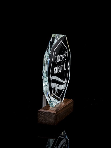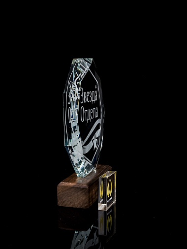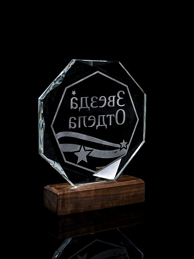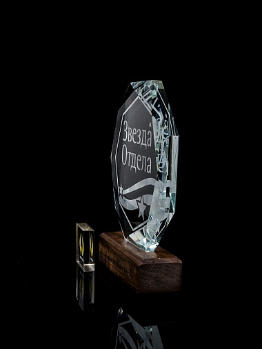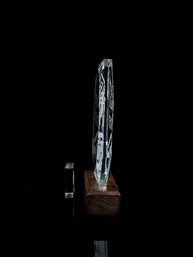 Стеклянная награда с гравировкой. Толщина стекла 15 мм. Награду можно доукомплектовывать металлической или заливной табличкой с текстом и рисунком. Табличка в комплект не входит и заказывается отдельно. Поставляется в комплекте с подарочным футляром. Вес награды без футляра 750гр.  Стоимость указана за нанесение на одной стороне, гравировка выполняется на задней стенке награды.