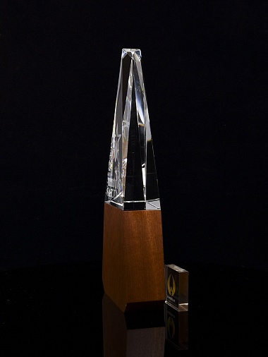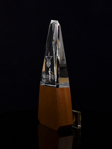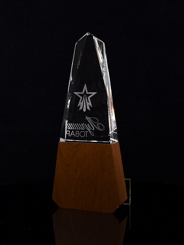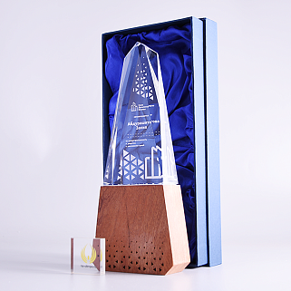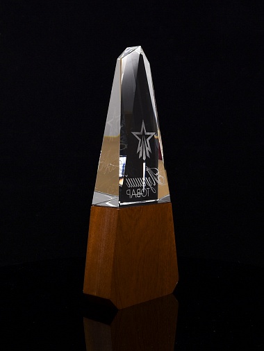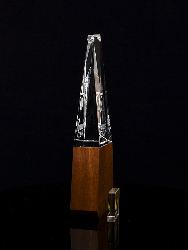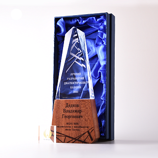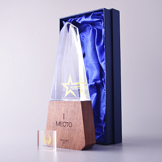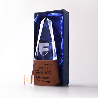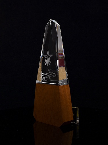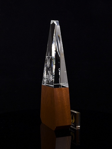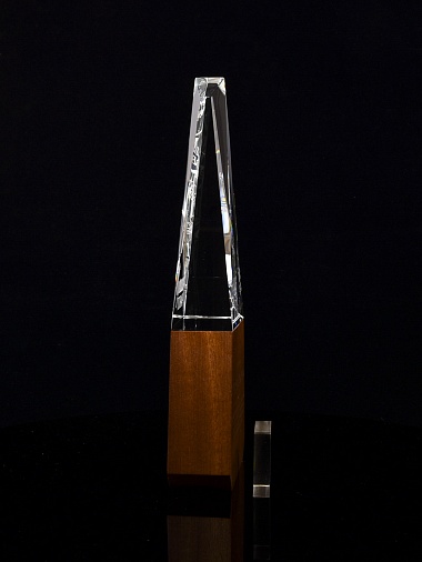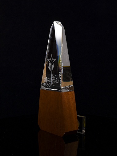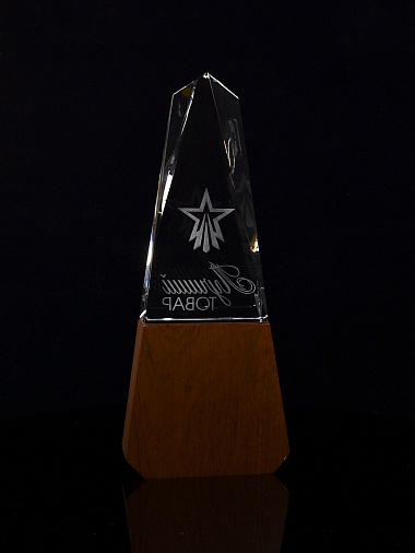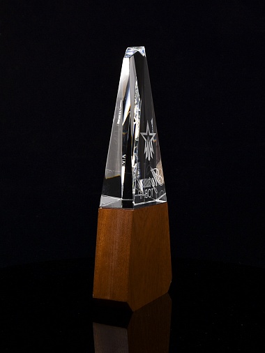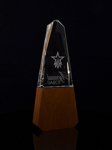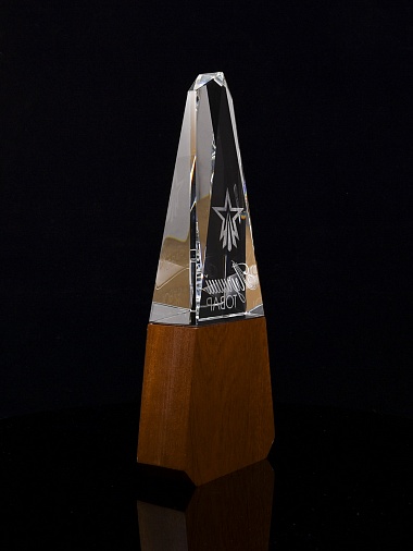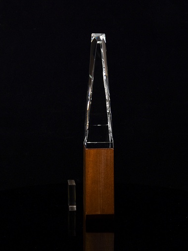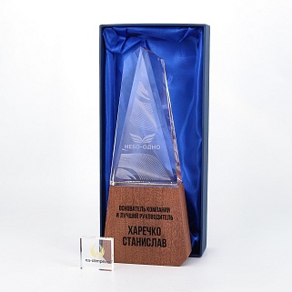 Стеклянная награда на деревянном постаменте с цветным нанесением. Толщина стекла 36 мм. Поставляется в комплекте с подарочным футляром. Вес награды без футляра 1000гр. Стоимость указана за нанесение на одной стороне, гравировка выполняется на передней стенке награды.