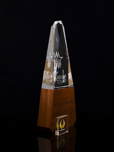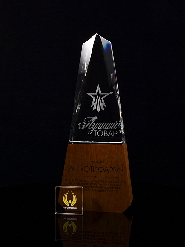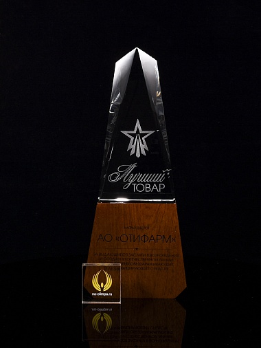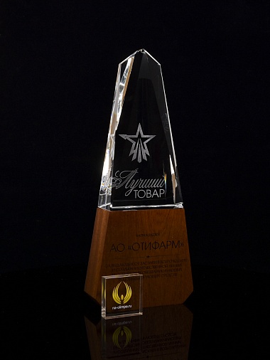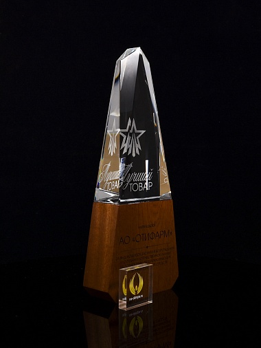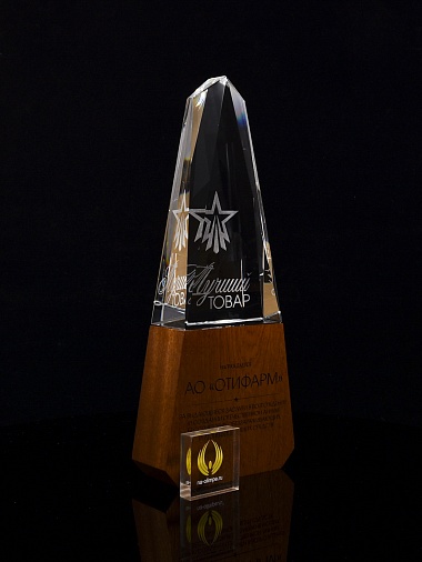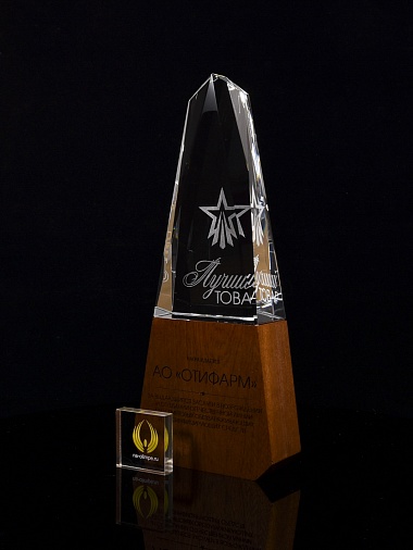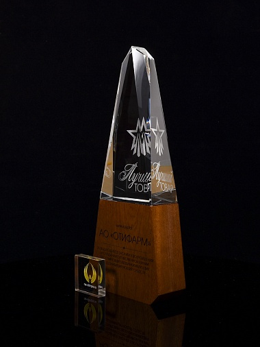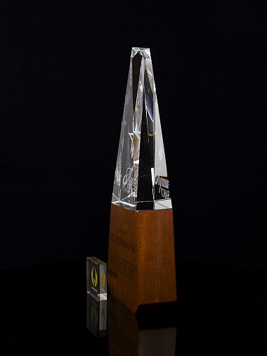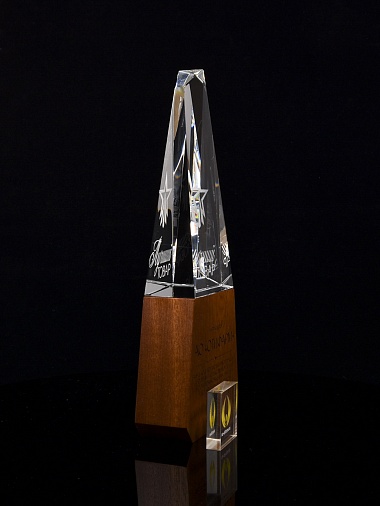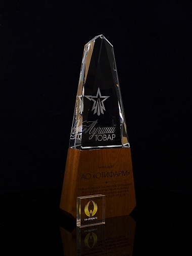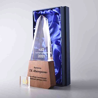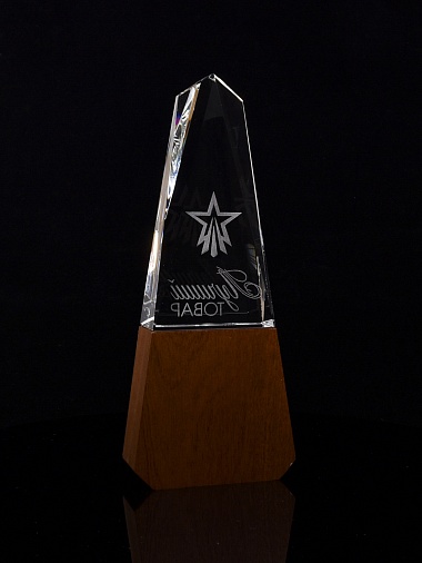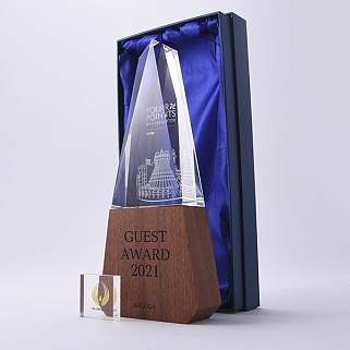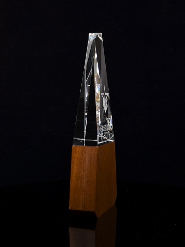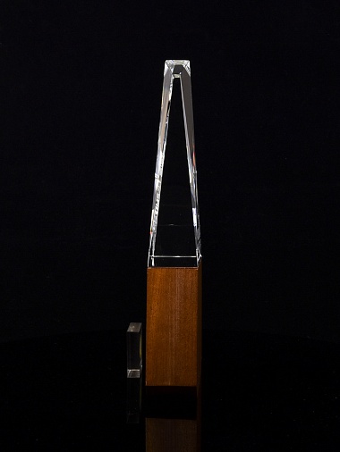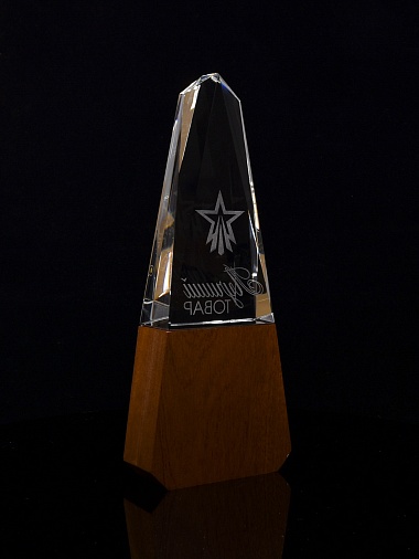 Стеклянная награда на деревянном постаменте с цветным нанесением. Толщина стекла 36 мм. Поставляется в комплекте с подарочным футляром. Вес награды без футляра 1000гр. Стоимость указана за нанесение на одной стороне, гравировка выполняется на передней стенке награды.