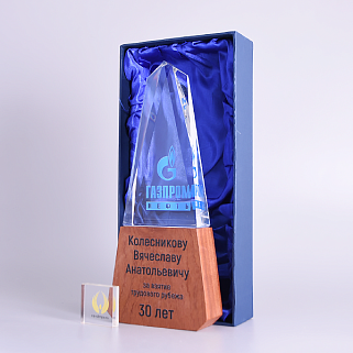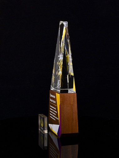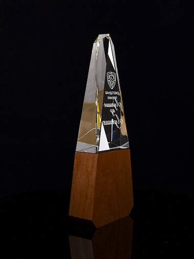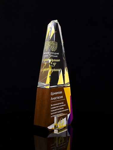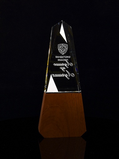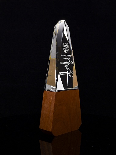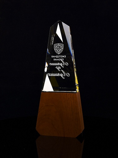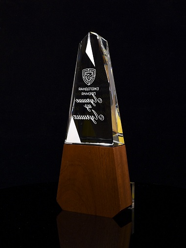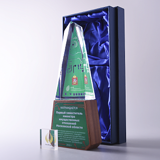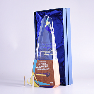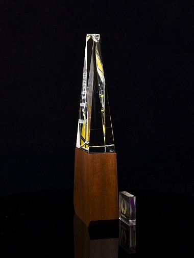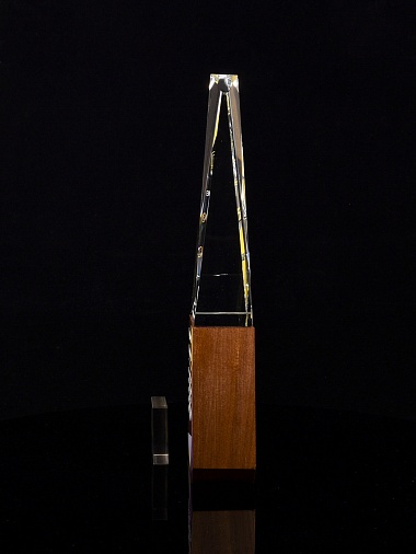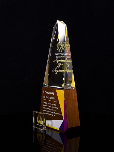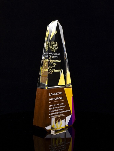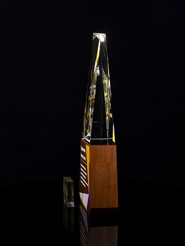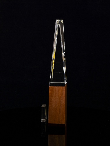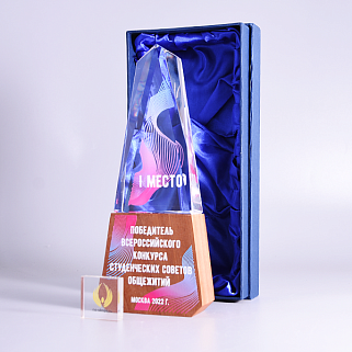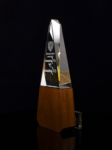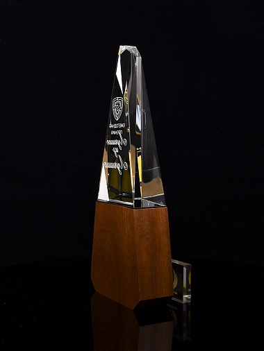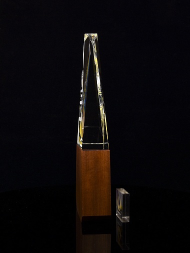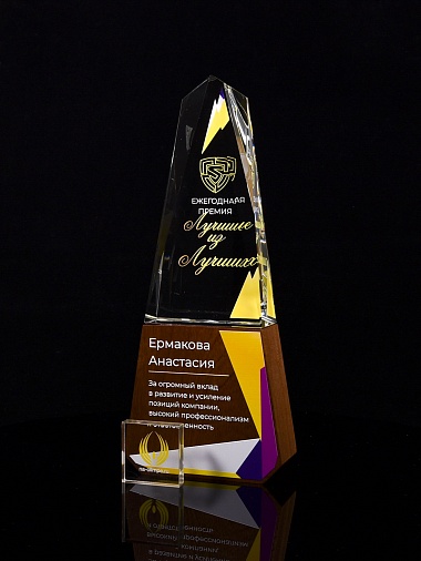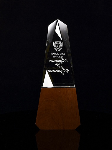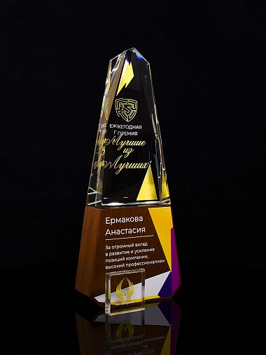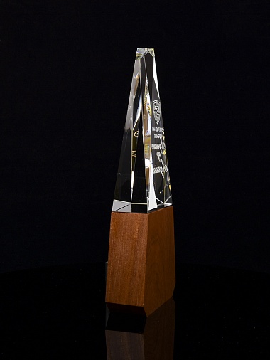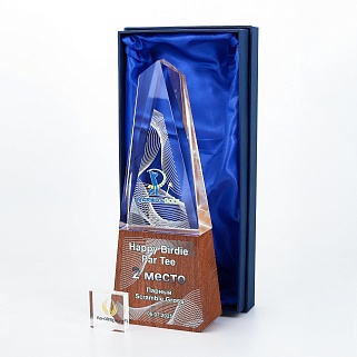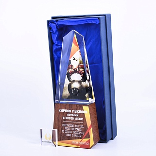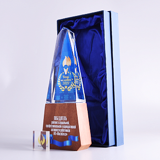 Стеклянная награда на деревянном постаменте с цветным нанесением. Толщина стекла 36 мм. Поставляется в комплекте с подарочным футляром. Вес награды без футляра 1000гр. Стоимость указана за нанесение на лицевой и оборотной стороне награды.