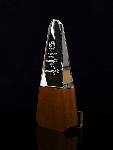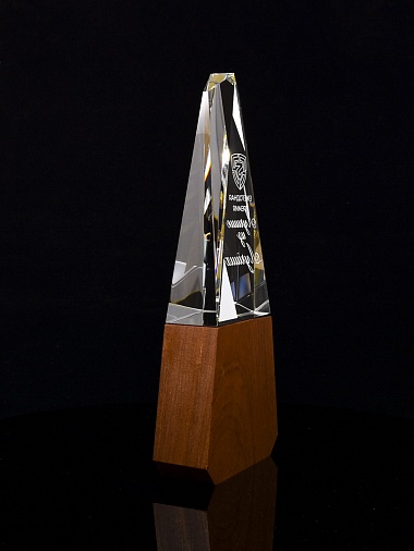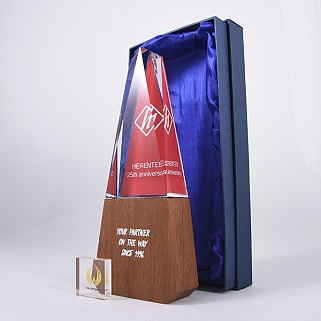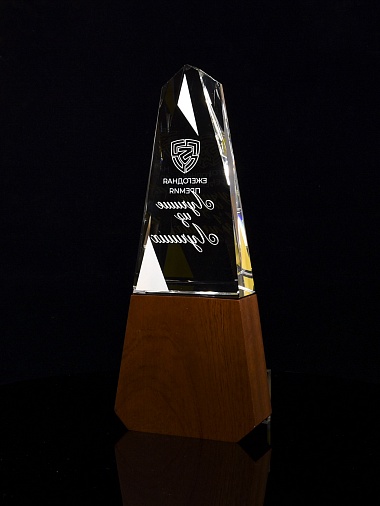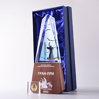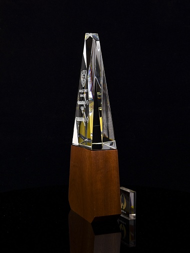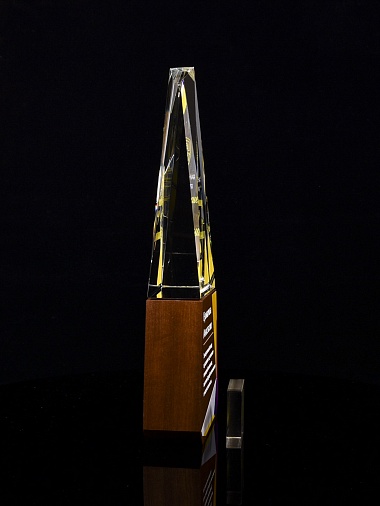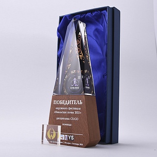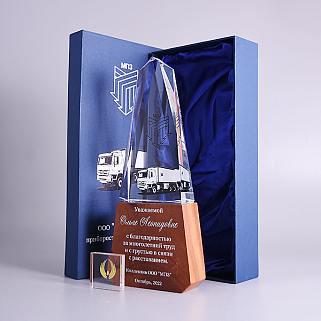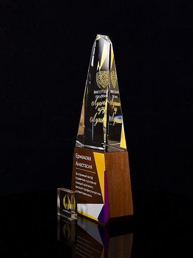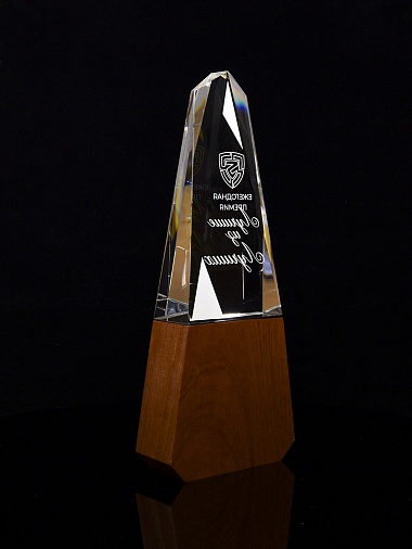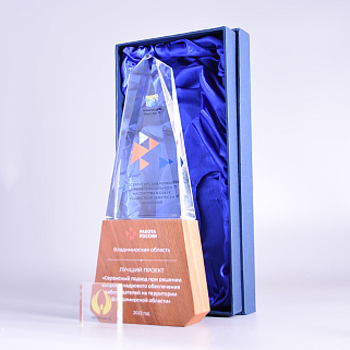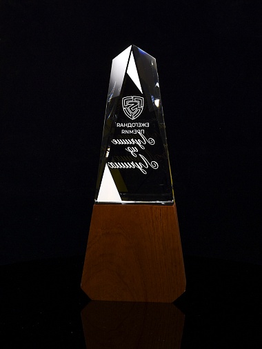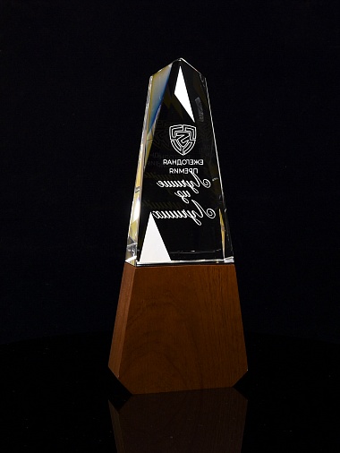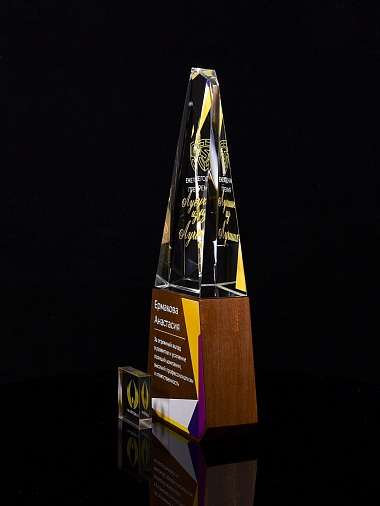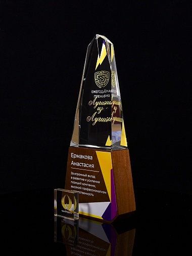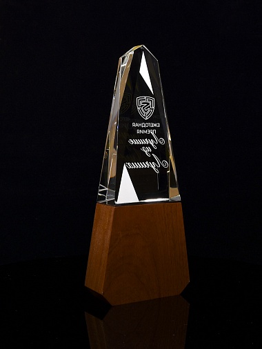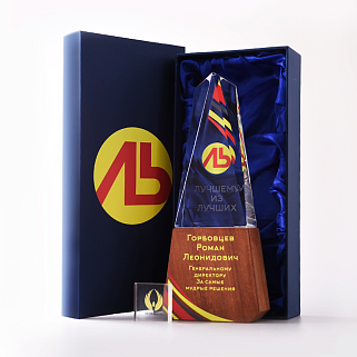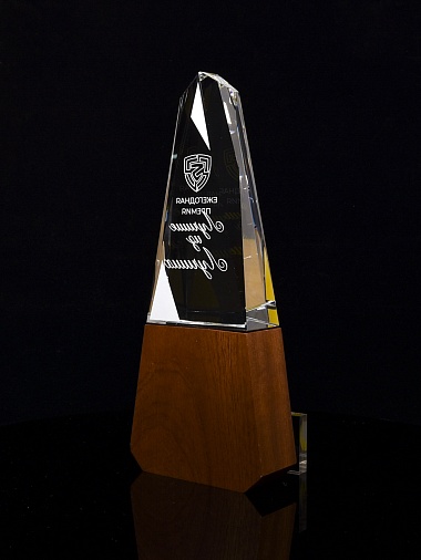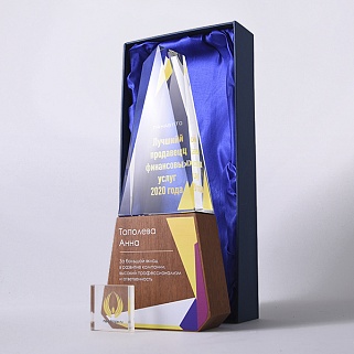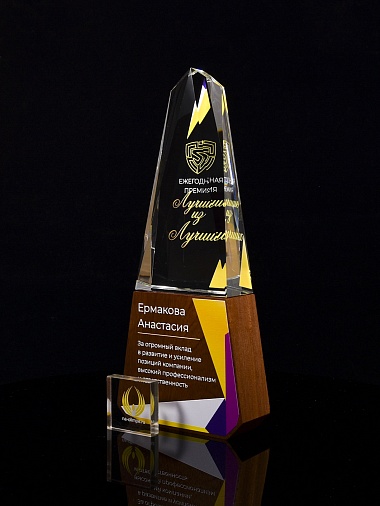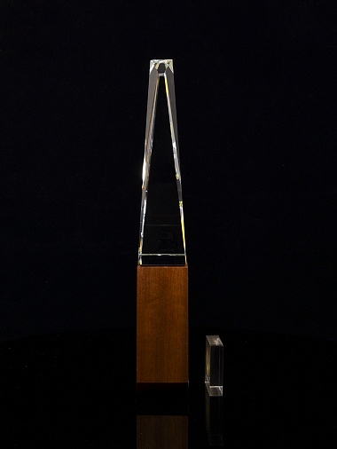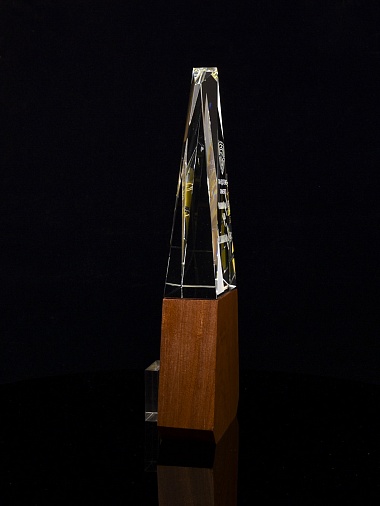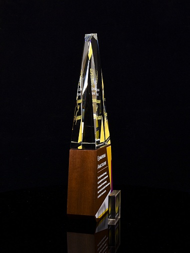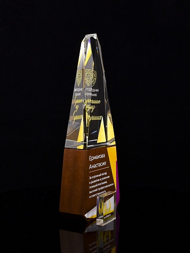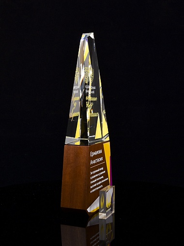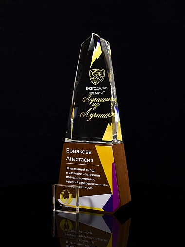 Стеклянная награда на деревянном постаменте с цветным нанесением. Толщина стекла 36 мм. Поставляется в комплекте с подарочным футляром. Вес награды без футляра 1000гр. Стоимость указана за нанесение на лицевой и оборотной стороне награды.