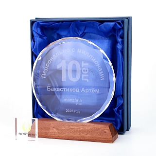 Стеклянная награда с гравировкой. Толщина стекла 21 мм. Может доукомплектовываться металлической или заливной табличкой с текстом и рисунком. Табличка в комплект не входит и заказывается отдельно. Награда поставляется в комплекте с подарочным футляром. Вес награды без футляра 1080гр. Стоимость указана за нанесение на одной стороне, гравировка выполняется на задней стенке награды. Есть возможность цветного нанесения или гравировки на деревянном элементе награды. Стоимость дополнительного нанесения - по запросу у менеджера.