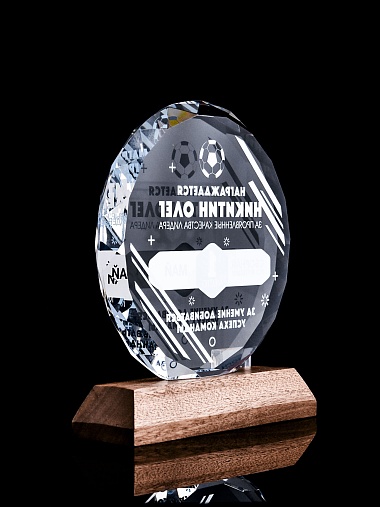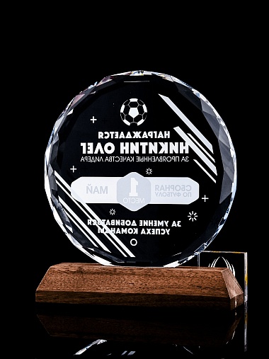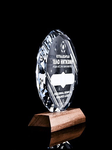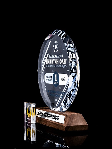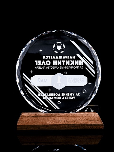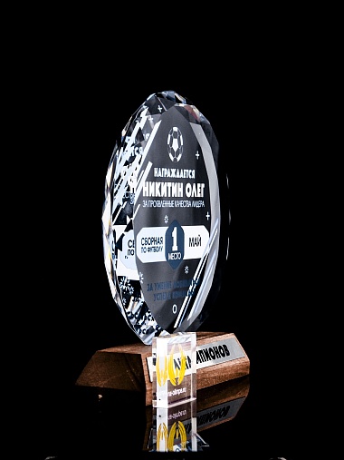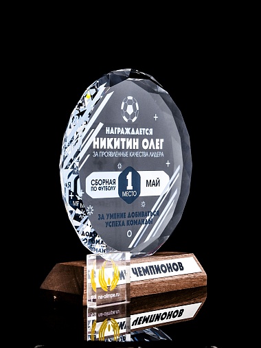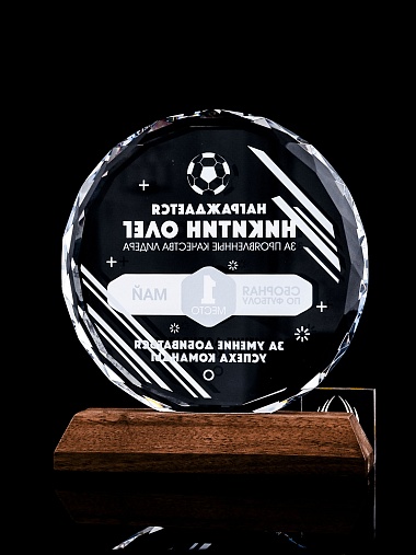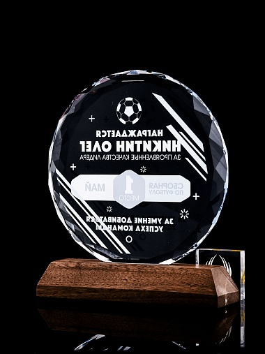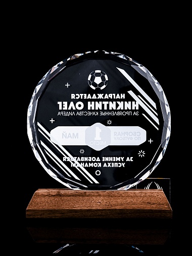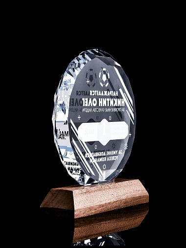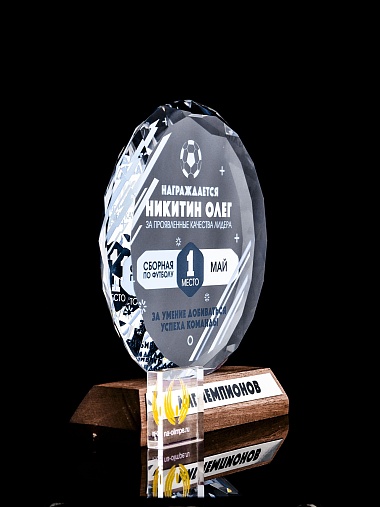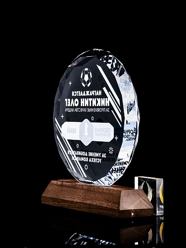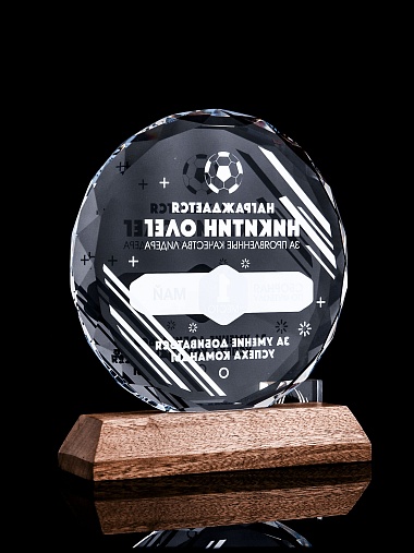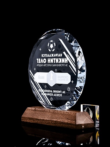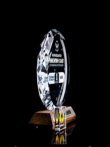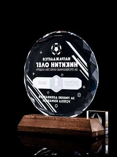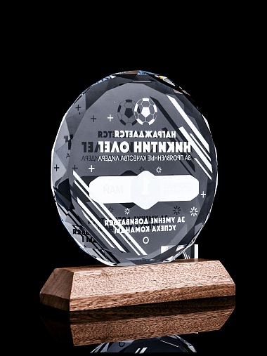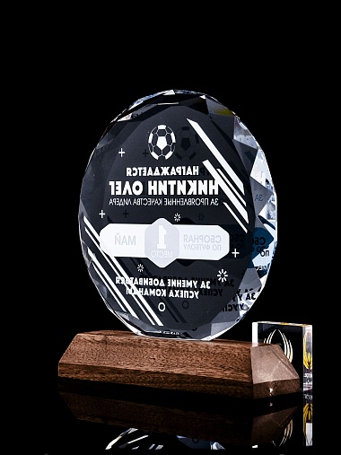 Стеклянная награда с полноцветным нанесением. Толщина стекла 15 мм. Может доукомплектовываться металлической или заливной табличкой с текстом и рисунком. Табличка в комплект не входит и заказывается отдельно. Награда поставляется в комплекте с подарочным футляром. Вес награды без футляра 1080гр. Стоимость указана за нанесение на одной стороне. печать выполняется на задней стенке награды. Есть возможность цветного нанесения или гравировки на деревянном элементе награды. Стоимость дополнительного нанесения - по запросу у менеджера.