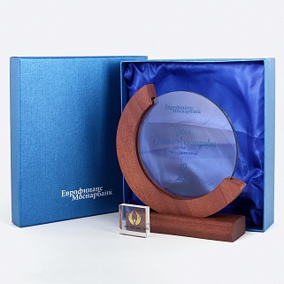 Стеклянная награда с полноцветным нанесением. Толщина стекла 10 мм. Может доукомплектовываться металлической, пластиковой или заливной табличкой с текстом и рисунком. Табличка в комплект не входит и заказывается отдельно. Награда поставляется в комплекте с подарочным футляром. Вес награды без футляра 605гр. Стоимость указана за нанесение на одной стороне, печать выполняется на задней стенке награды Возможность нанесения на дополнительной стороне и стоимость этих работ можно уточнить у менеджеров.