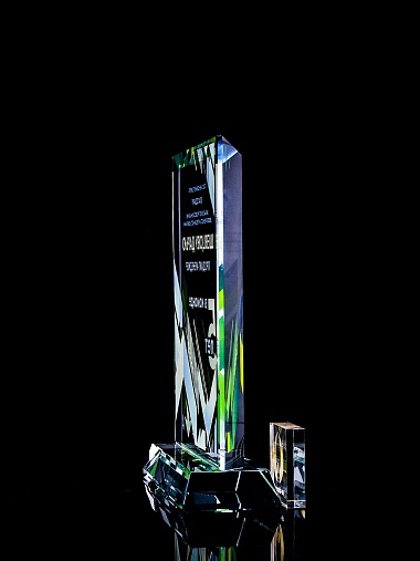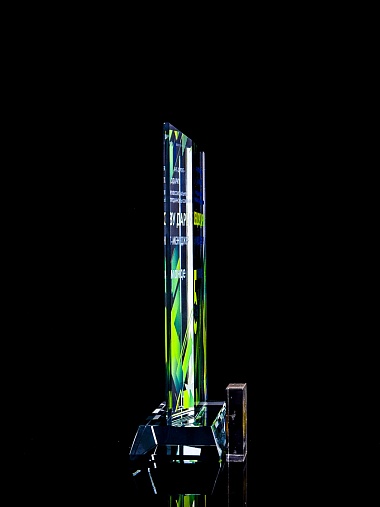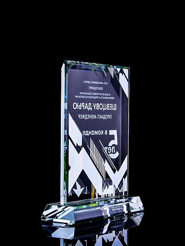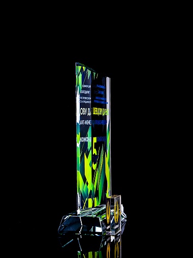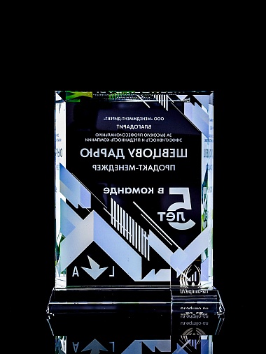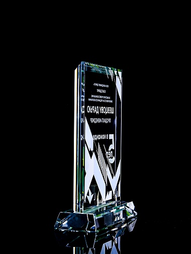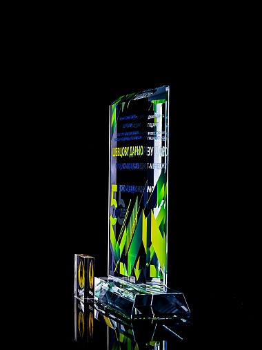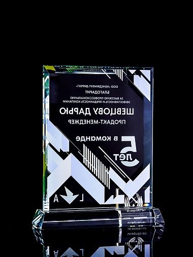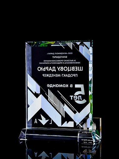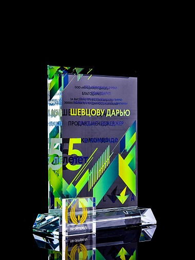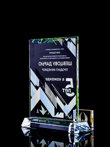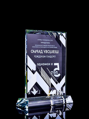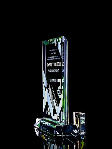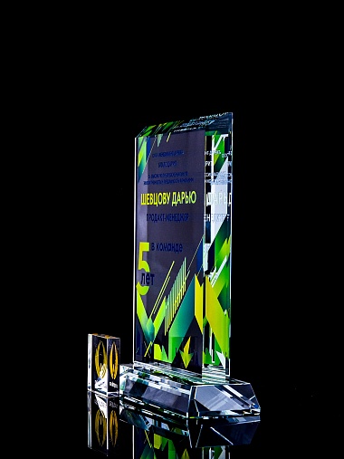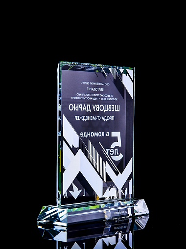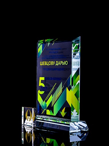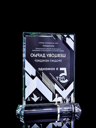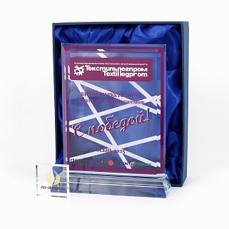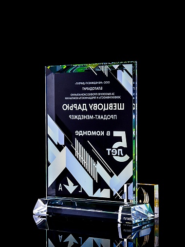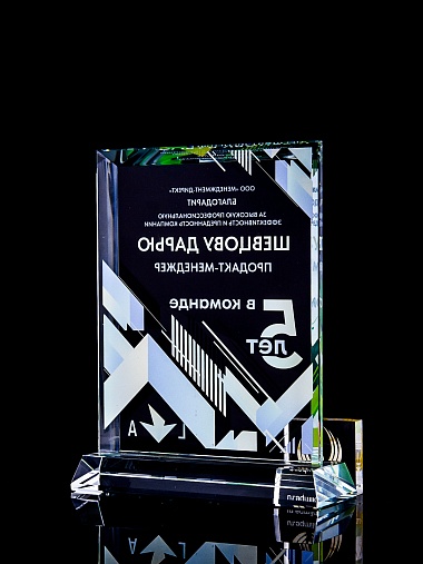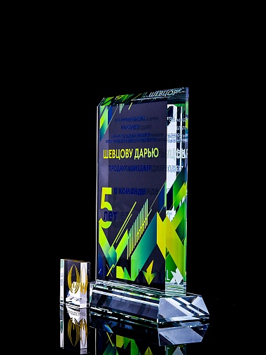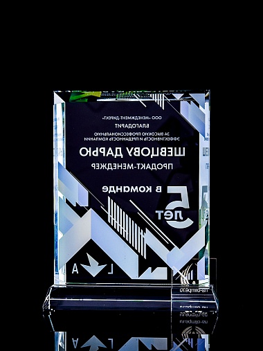 Стеклянная награда с полноцветным нанесением. Толщина стекла 15 мм. Поставляется в комплекте с подарочным футляром. Вес награды без футляра 1065гр. Стоимость указана за нанесение с двух сторон, печать выполняется на задней стенке награды и на лицевой.
