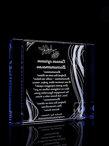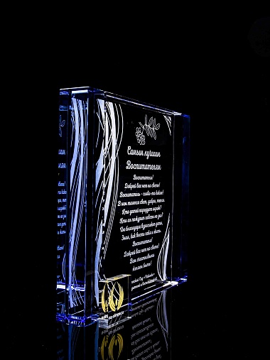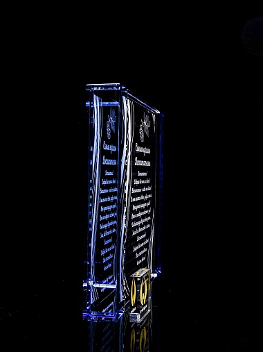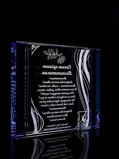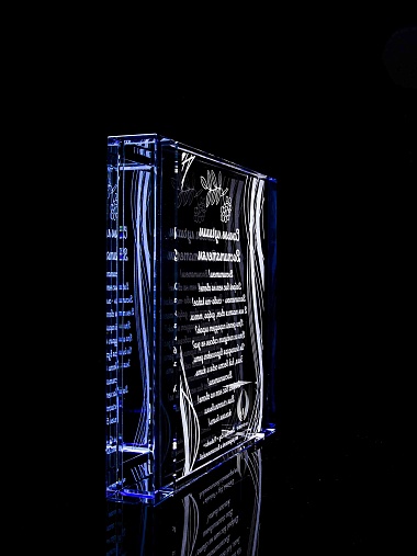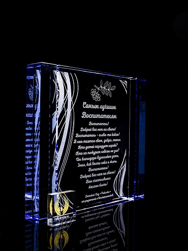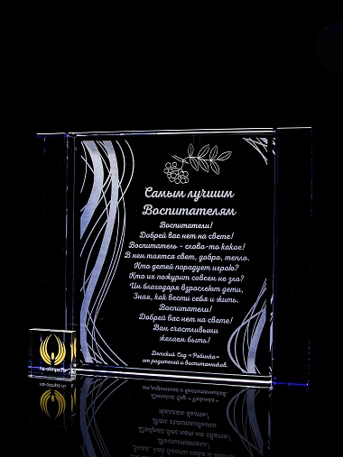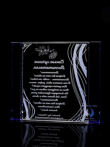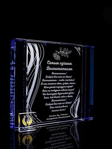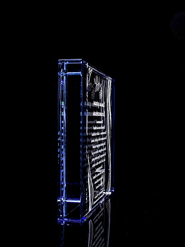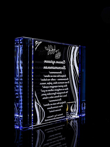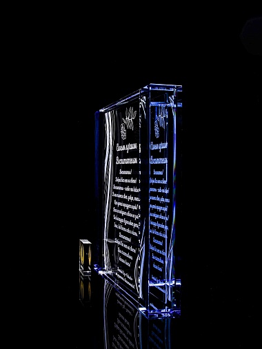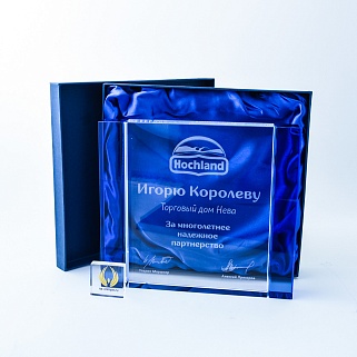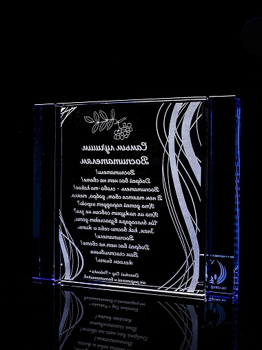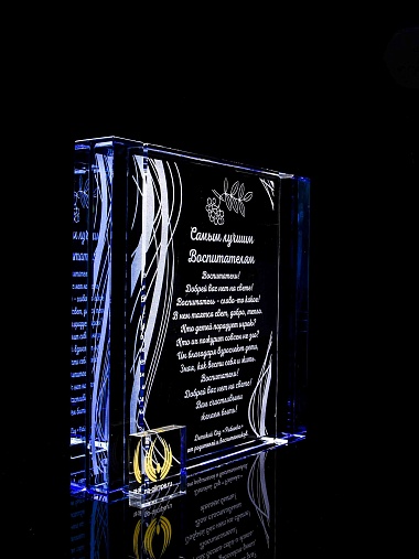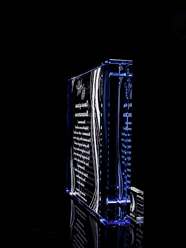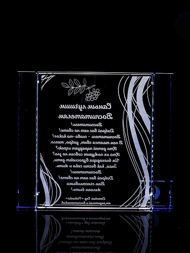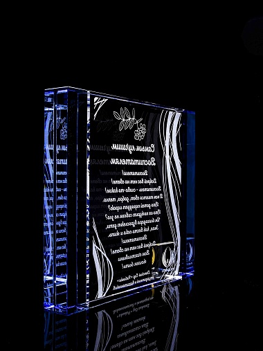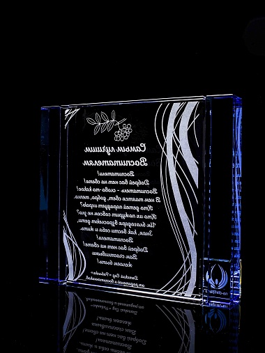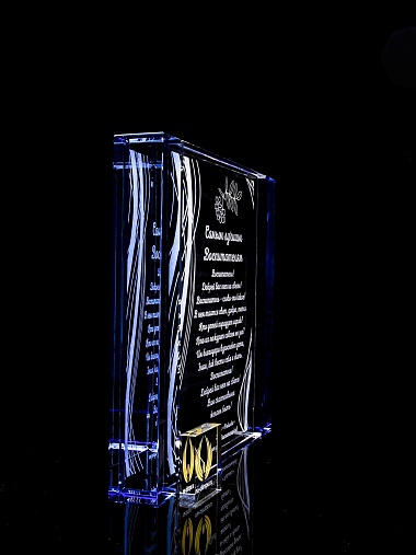 Стеклянная награда с гравировкой. Поставляется в комплекте с подарочным футляром. Толщина стекла 32 мм. Вес награды без футляра 3550гр. Стоимость указана за нанесение на одной стороне, гравировка выполняется на задней стенке награды.