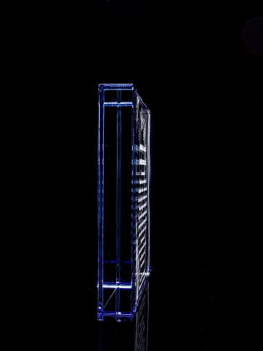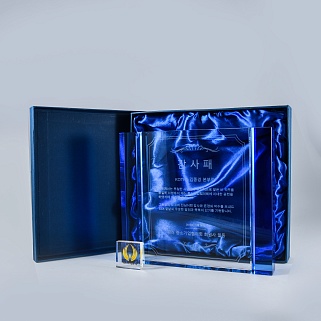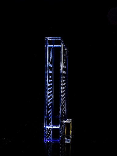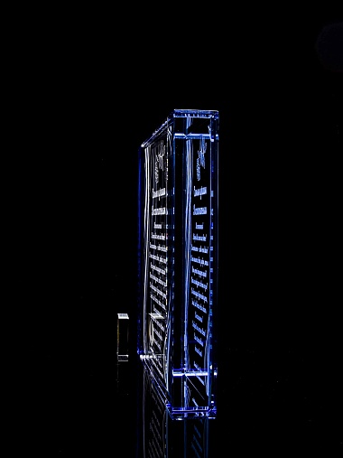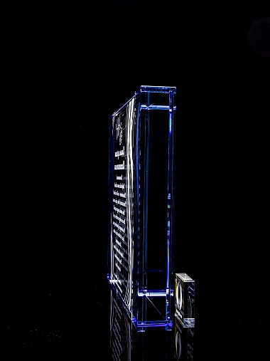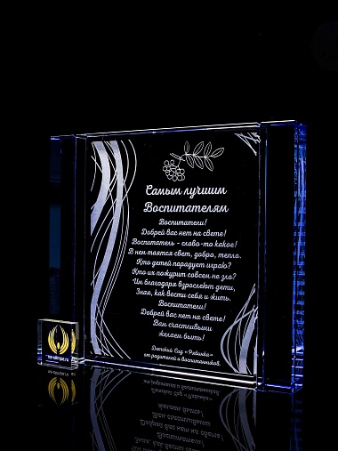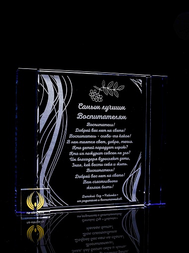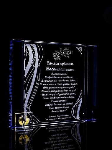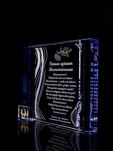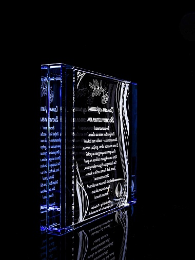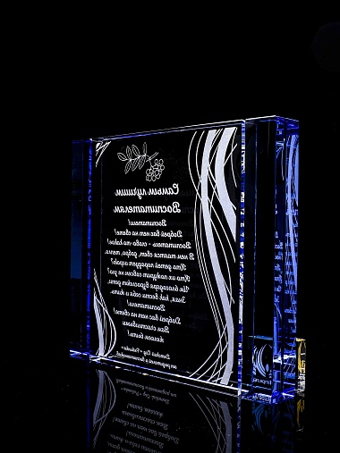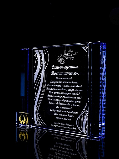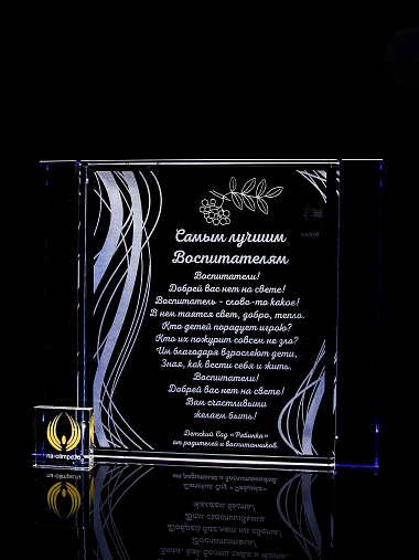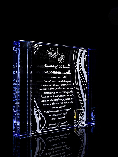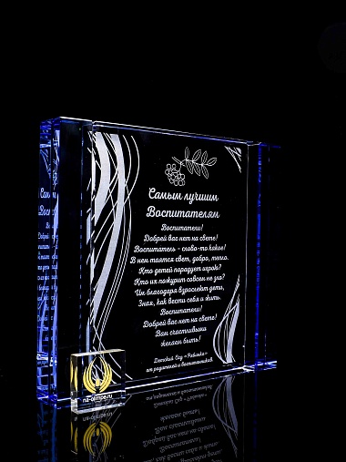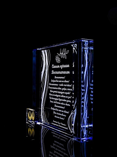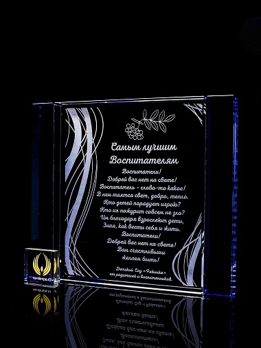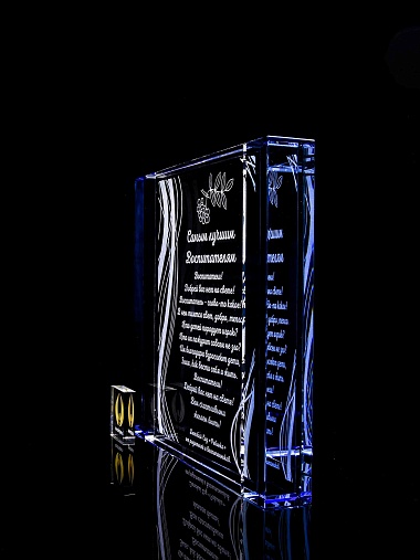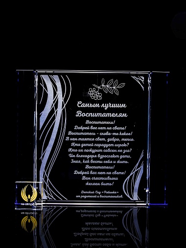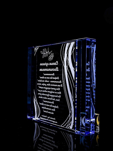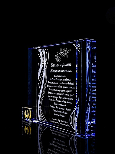 Стеклянная награда с гравировкой. Поставляется в комплекте с подарочным футляром. Толщина стекла 32 мм. Вес награды без футляра 3550гр. Стоимость указана за нанесение на одной стороне, гравировка выполняется на задней стенке награды.