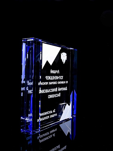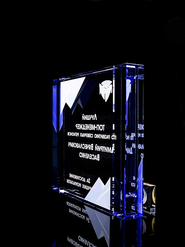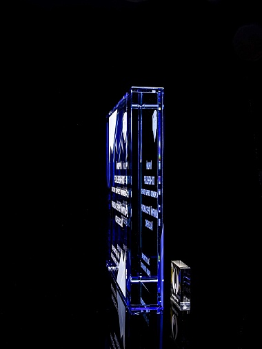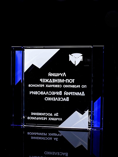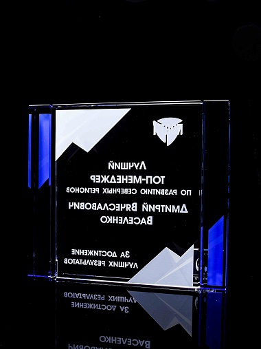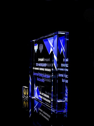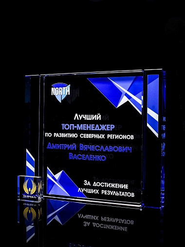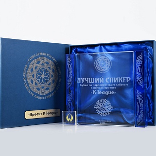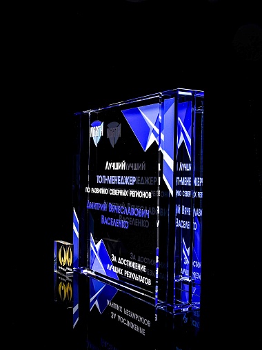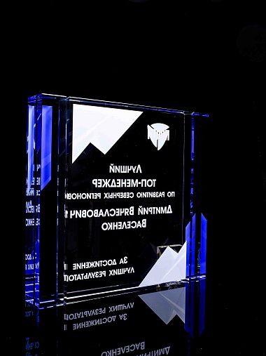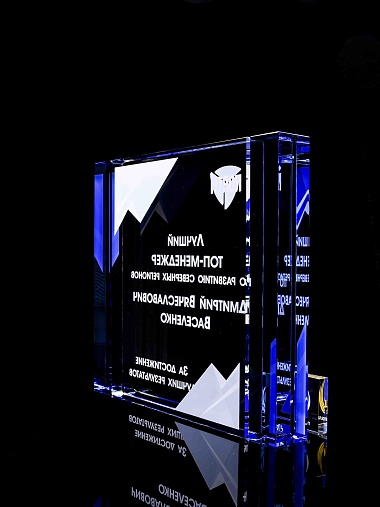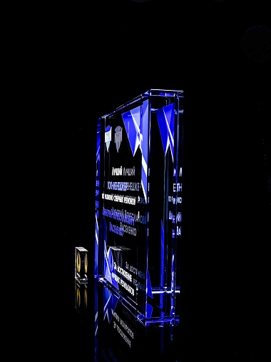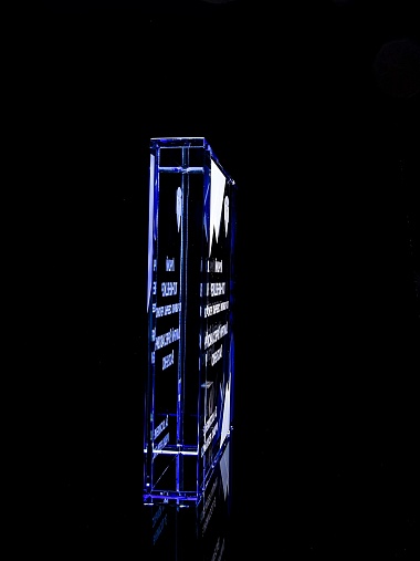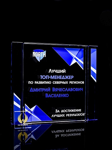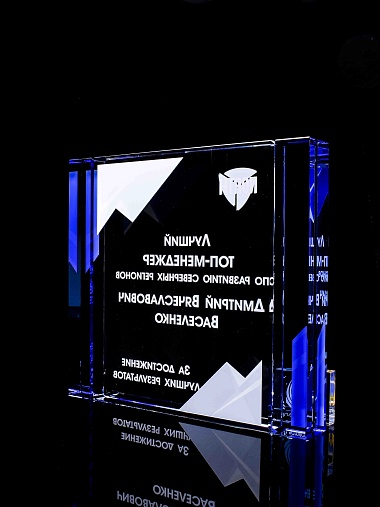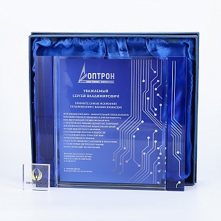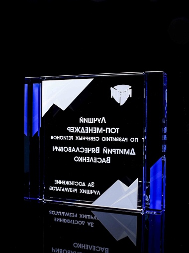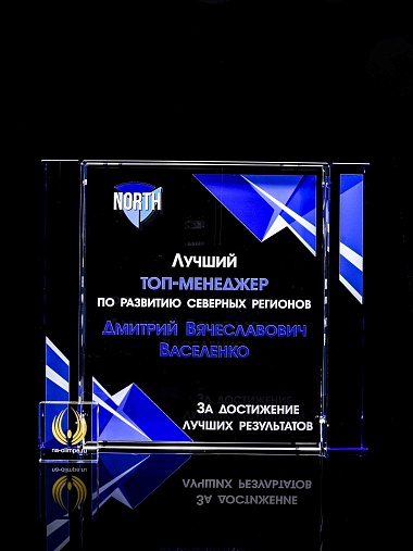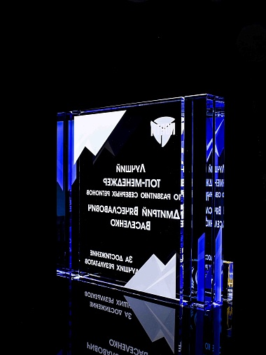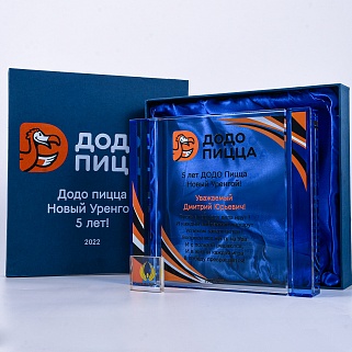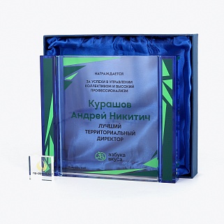Стеклянная награда с полноцветным нанесением. Поставляется в комплекте с подарочным футляром. Толщина стекла 32 мм. Вес награды без футляра 3550гр. Стоимость указана за нанесение на одной стороне, печать выполняется на задней стенке награды.