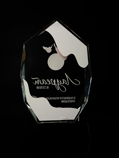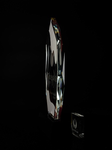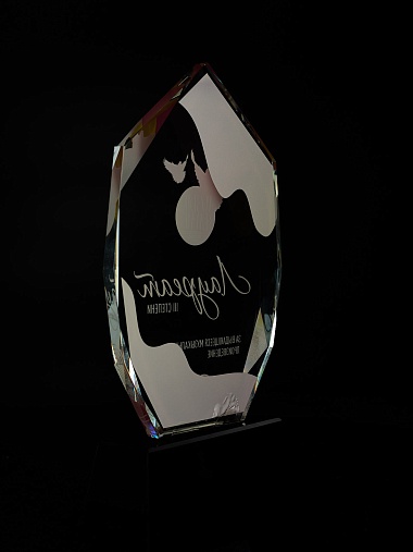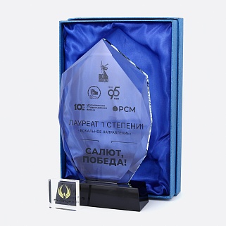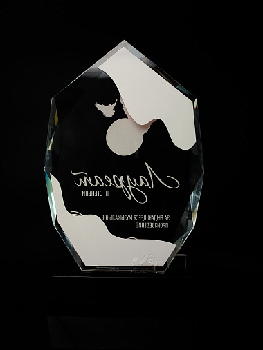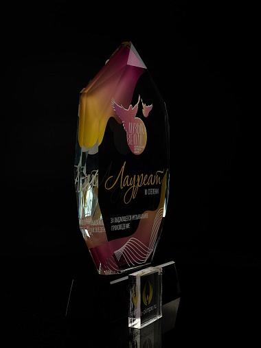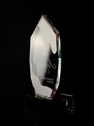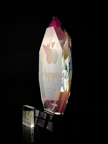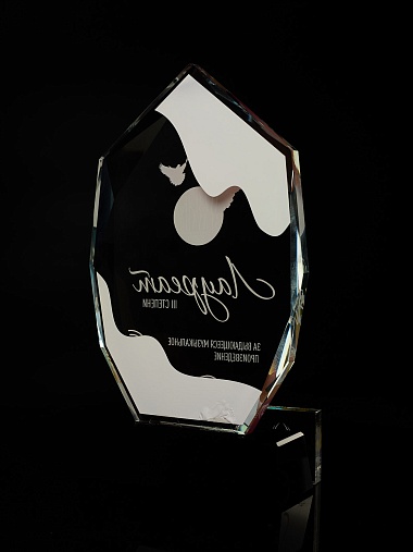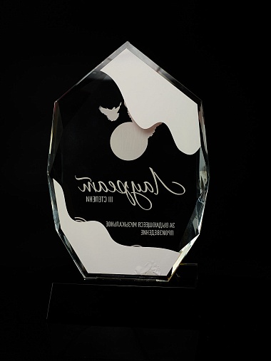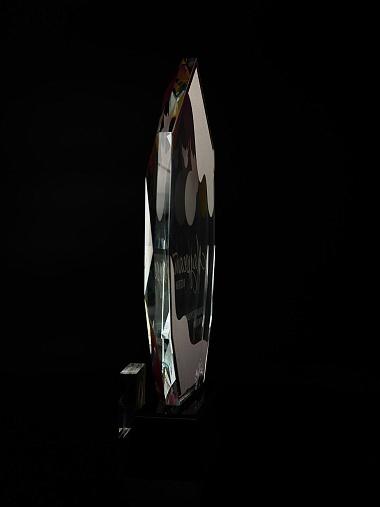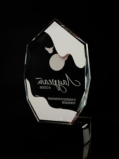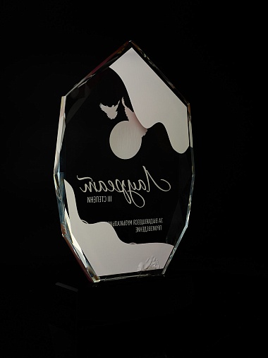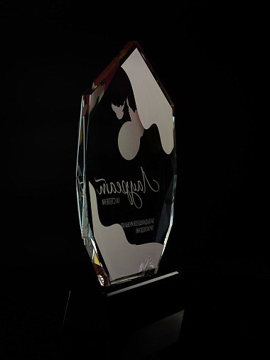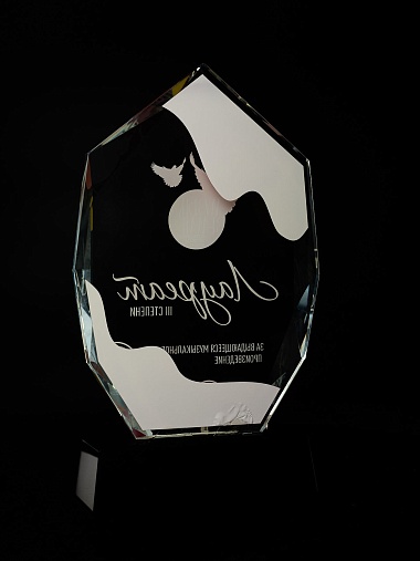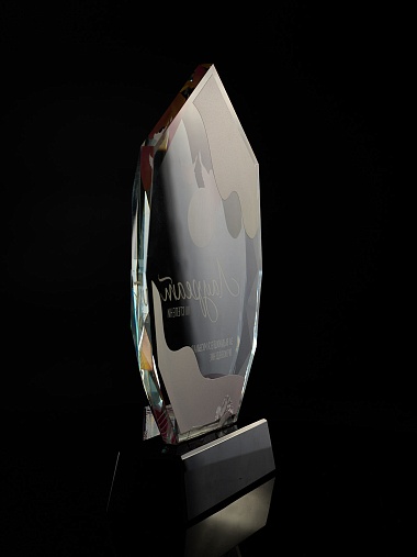 Стеклянная награда с полноцветным нанесением. Толщина стекла 12 мм. Поставляется в комплекте с подарочным футляром. Вес награды без футляра 1215гр. Стоимость указана за нанесение на одной стороне, печать выполняется на задней стенке награды.