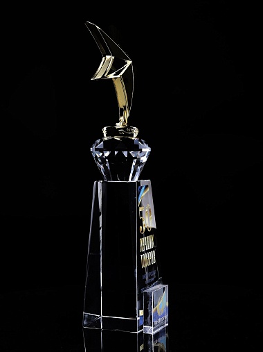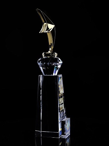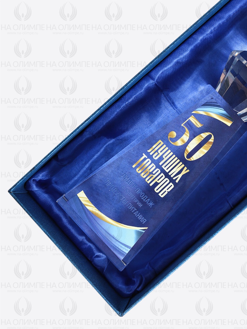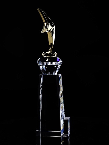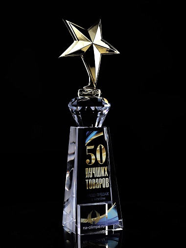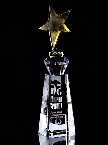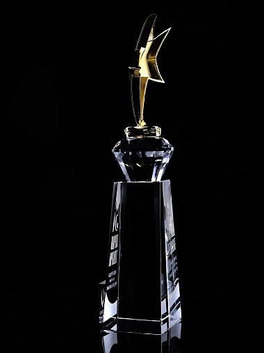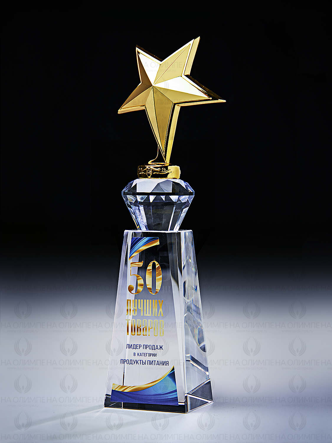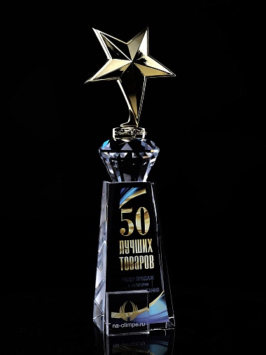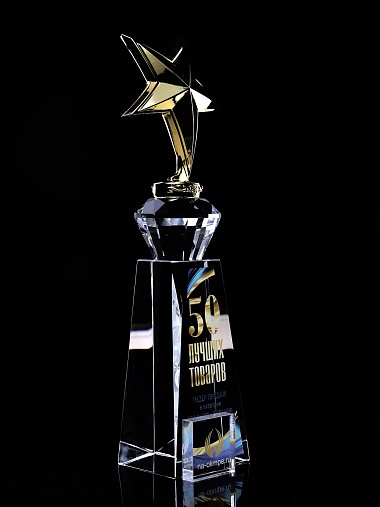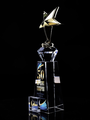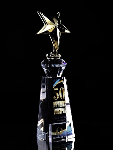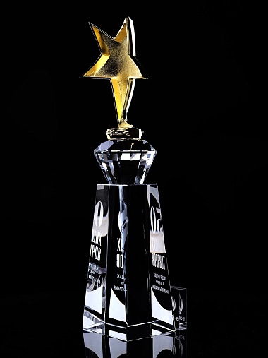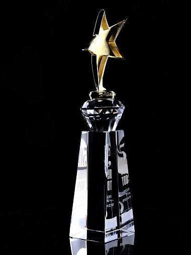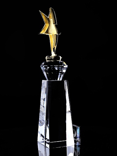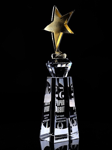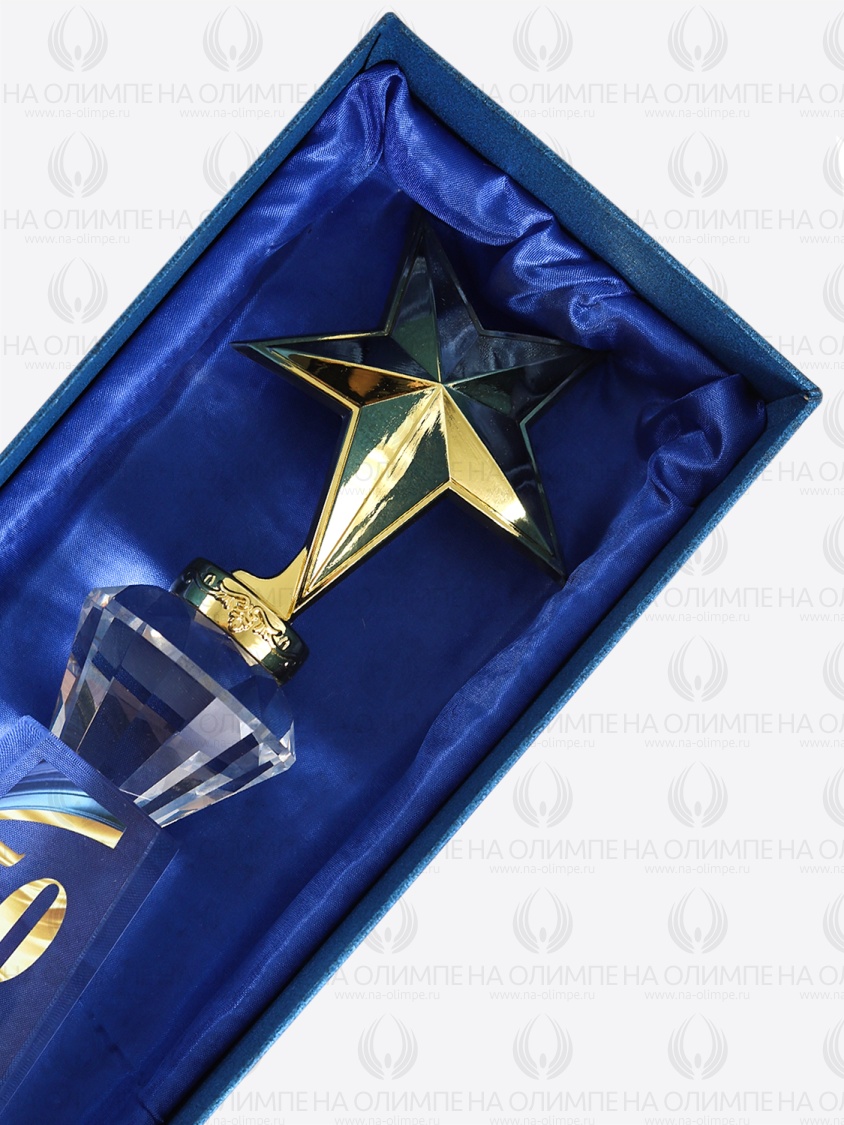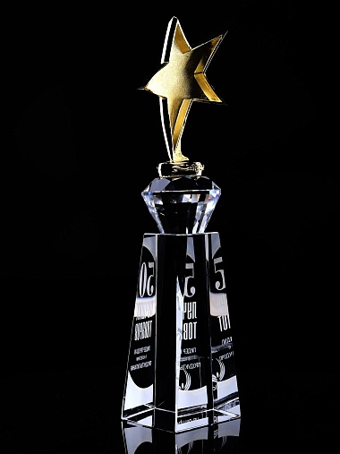 Стеклянная награда с металлической звездой и цветным нанесением на постаменте. Поставляется в комплекте с подарочным футляром. Вес награды без футляра 1330гр.